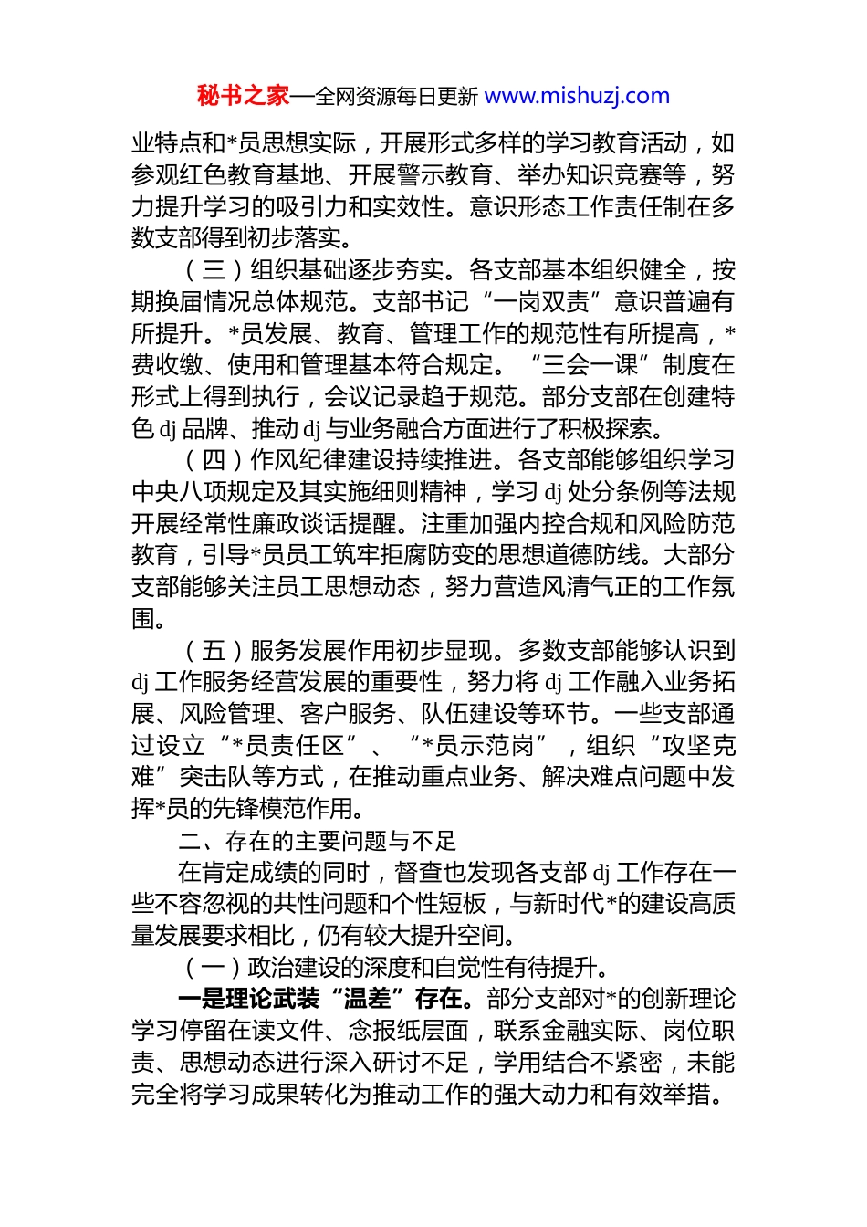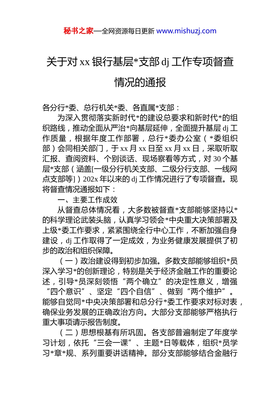 秘书之家—全网资源每日更新 www.mishuzj.com关于对 xx 银行基层*支部 dj 工作专项督查情况的通报各分行*委、总行机关*委、各直属*支部:为深入贯彻落实新时代*的建设总要求和新时代*的组织路线,推动全面从严治*向基层延伸,全面提升基层 dj 工作质量,根据年度工作部署,总行*委办公室(*委组织部)会同相关部门,于 xx 月 xx 日至 xx 月 xx 日,采取听取汇报、查阅资料、个别谈话、现场察看等方式,对 30 个基层*支部(涵盖[一级分行机关支部、二级分行支部、一线网点支部等])202x 年以来的 dj 工作情况进行了专项督查。现将督查情况通报如下:一、主要工作成效从督查总体情况看,大多数被督查*支部能够坚持以*的科学理论武装头脑,认真学习领会*中央重大决策部署及上级*委工作要求,紧紧围绕全行中心工作,不断加强自身建设,dj 工作取得了一定成效,为业务健康发展提供了初步的政治和组织保障。(一)政治建设得到初步加强。多数支部能够组织*员深入学习*的创新理论,特别是关于经济金融工作的重要论述,引导*员深刻领悟“两个确立”的决定性意义,增强“四个意识”、坚定“四个自信”、做到“两个维护”。能够自觉同*中央决策部署和总分行*委工作要求对标对表,确保业务发展的正确政治方向。大部分支部能够严格执行重大事项请示报告制度。(二)思想根基有所巩固。各支部普遍制定了年度学习计划,依托“三会一课”、主题*日等载体,组织*员学习*章*规、系列重要讲话精神。部分支部能够结合金融行秘书之家—全网资源每日更新 www.mishuzj.com业特点和*员思想实际,开展形式多样的学习教育活动,如参观红色教育基地、开展警示教育、举办知识竞赛等,努力提升学习的吸引力和实效性。意识形态工作责任制在多数支部得到初步落实。(三)组织基础逐步夯实。各支部基本组织健全,按期换届情况总体规范。支部书记“一岗双责”意识普遍有所提升。*员发展、教育、管理工作的规范性有所提高,*费收缴、使用和管理基本符合规定。“三会一课”制度在形式上得到执行,会议记录趋于规范。部分支部在创建特色 dj 品牌、推动 dj 与业务融合方面进行了积极探索。(四)作风纪律建设持续推进。各支部能够组织学习中央八项规定及其实施细则精神,学习 dj 处分条例等法规开展经常性廉政谈话提醒。注重加强内控合规和风险防范教育,引导*员员工筑牢拒腐防变的思想道德防线。大部分支部能够关注员工思想动态,努力营造风清气正的工作氛围。(五)服务发展作用初步显现。多数支部能够认识到dj 工作服务经营发展的重要性,努力将 dj 工作融入业务拓展、风险管理、客户服务、队伍建设等环节。一些支部通过设立“*员责任区”、“*员示范岗”,组织“攻坚克难”突击队等方式,在推动重点业务、解决难点问题中发挥*员的先锋模范作用。二、存在的主要问题与不足在肯定成绩的同时,督查也发现各支部 dj 工作存在一些不容忽视的共性问题和个性短板,与新时代*的建设高质量发展要求相比,仍有较大提升空间。(一)政治建设的深度和自觉性有待提升。一是理论武装“温差”存在。部分支部对*的创新理论学习停留在读文件、念报纸层面,联系金融实际、岗位职责、思想动态进行深入研讨不足,学用结合不紧密,未能完全将学习成果转化为推动工作的强大动力和有效举措。秘书之家—全网资源每日更新 www.mishuzj.com个别*员对基本理论、基本方略掌握不全面、不准确。二是政治能力锤炼不足。部分支部在引导*员从政治高度观察、分析和处理业务问题方面做得不够,对金融工作的政治性、人民性认识不够深刻,防范化解金融风险的政治责任感有待加强。在复杂严峻的经济金融形势面前,部分*员的政治判断力、政治领悟力、政治执行力仍需锤炼。三是贯彻落实“最后一公里”有堵点。对上级*委的一些决策部署,存在以会议落实会议、以文件落实文件的现象,结合支部实际制定具体落实措施不够精准有力,跟踪问效机制不健全,导致政策效果在基层打折扣。(二)思想引领的针对性和实效性有待增强。一是学习形式方法单一。集中学习多、个人自学引导少;理论学习多、实践体验少;“填鸭式”灌输多、“互...