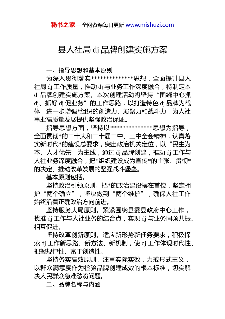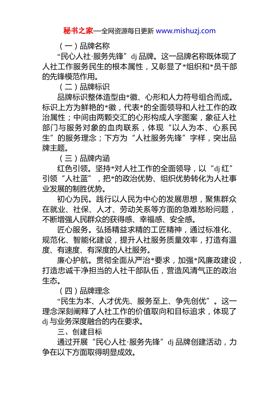 秘书之家—全网资源每日更新 www.mishuzj.com县人社局 dj 品牌创建实施方案一、指导思想和基本原则为深入贯彻落实**************思想,全面提升县人社局 dj 工作质量,推动 dj 与业务工作深度融合,特制定本dj 品牌创建实施方案。本次创建活动将坚持“围绕中心抓dj、抓好 dj 促业务”的工作思路,以打造特色 dj 品牌为载体,进一步增强*组织的创造力、凝聚力和战斗力,为人社事业高质量发展提供坚强政治保证。指导思想方面,坚持以**************思想为指导,全面贯彻*的二十大和二十届二中、三中全会精神,认真落实新时代*的建设总要求,突出政治机关定位,以“民生为本、人才优先”为主线,通过 dj 品牌创建,推动 dj 工作与人社业务深度融合,把*组织建设成为宣传*的主张、贯彻*的决定、推动改革发展的坚强战斗堡垒。基本原则包括。坚持政治引领原则。把*的政治建设摆在首位,坚定拥护“两个确立”,坚决做到“两个维护”,确保人社工作始终沿着正确政治方向前进。坚持服务大局原则。紧紧围绕县委县政府中心工作,找准 dj 工作与人社业务的结合点,实现 dj 与业务同频共振、相互促进。坚持改革创新原则。适应新形势新任务要求,积极探索 dj 工作新思路、新方法、新机制,使 dj 工作体现时代性、把握规律性、富于创造性。坚持务实高效原则。注重实际实效,力戒形式主义,以群众满意度作为检验品牌创建成效的根本标准,切实解决人民群众急难愁盼问题。二、品牌名称与内涵秘书之家—全网资源每日更新 www.mishuzj.com(一)品牌名称“民心人社·服务先锋”dj 品牌。这一品牌名称既体现了人社工作服务民生的根本属性,又彰显了*组织和*员干部的先锋模范作用。(二)品牌标识品牌标识整体造型由*徽、心形和人力符号组合而成。标识上方为鲜艳的*徽,代表*的全面领导和人社工作的政治属性;中间由两颗交汇的心形构成人字图案,象征人社部门与服务对象的血肉联系,体现“以人为本、心系民生”的服务理念;下方为“人社服务先锋”字样,突出品牌主题。(三)品牌内涵红色引领。坚持*对人社工作的全面领导,以“dj 红”引领“人社蓝”,把*的政治优势、组织优势转化为人社事业发展的制胜优势。初心为民。践行以人民为中心的发展思想,聚焦群众在就业、社保、人才、劳动关系等方面的急难愁盼问题,不断增强人民群众的获得感、幸福感、安全感。匠心服务。弘扬精益求精的工匠精神,通过标准化、规范化、智能化建设,提升人社服务质量效率,打造有温度、有速度、有深度的人社服务。廉心护航。贯彻全面从严治*要求,加强*风廉政建设,打造忠诚干净担当的人社干部队伍,营造风清气正的政治生态。(四)品牌理念“民生为本、人才优先、服务至上、争先创优”。这一理念深刻阐释了人社工作的价值取向和目标追求,体现了dj 与业务深度融合的内在要求。三、创建目标通过开展“民心人社·服务先锋”dj 品牌创建活动,力争在以下方面取得明显成效。秘书之家—全网资源每日更新 www.mishuzj.com*组织组织力显著提升。*支部标准化规范化建设水平全面提高,*组织战斗堡垒作用和*员先锋模范作用更加突出,到 2025 年底,力争创建成为县级及以上“先进基层*组织”。dj 业务融合度显著提升。形成一套 dj 与业务深度融合的工作机制,品牌创建对人社事业发展的推动作用明显增强,解决“两张皮”问题取得实质性进展。人社服务效能显著提升。就业、社保、人才、劳动关系等主要业务指标达到或超过年度目标,服务流程不断优化,办事效率提高 30%以上,群众满意度保持在 95%以上。干部队伍能力显著提升。打造一支政治过硬、业务精通、作风优良的人社干部队伍,*员干部的整体素质和服务能力适应新时代人社工作要求。廉洁自律意识显著提升。*风廉政建设责任制全面落实,权力运行监督制约机制更加完善,干部职工无违纪违法行为发生。四、主要内容与具体措施(一)政治引领工程实施“政治引领工程”,不断夯实思想根基。坚持把*的政治建设摆在首位,全面落实“第一议题”制度,深入学习贯彻**************思想,持续巩固拓展 zt 教育成果。严格执行“三会一课”、组织生活会、民...