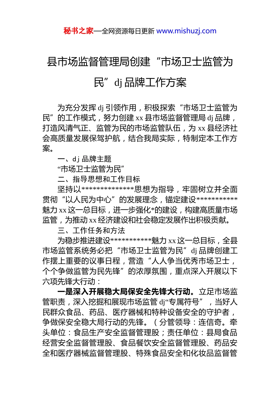 秘书之家—全网资源每日更新 www.mishuzj.com县市场监督管理局创建“市场卫士监管为民”dj 品牌工作方案为充分发挥 dj 引领作用,积极探索“市场卫士监管为民”的工作模式,努力创建 xx 县市场监督管理局 dj 品牌,打造风清气正、监管为民的市场监管队伍,为 xx 县经济社会高质量发展保驾护航,结合我局实际,特制定本工作方案。一、dj 品牌主题“市场卫士监管为民”二、指导思想和工作目标坚持以**************思想为指导,牢固树立并全面贯彻“以人民为中心”的发展理念,锚定建设***********魅力 xx 这一总目标,进一步强化*的建设,构建高质量市场监管,为推动 xx 经济建设和社会稳定发展作出积极贡献。三、工作任务和方法为稳步推进建设***********魅力 xx 这一总目标,全县市场监管系统务必把“市场卫士监管为民”dj 品牌创建工作摆上重要的议事日程,营造“人人争当优秀市场卫士,个个争做监管为民先锋”的浓厚氛围,重点深入开展以下六项先锋大行动:一是深入开展稳大局保安全先锋大行动。立足市场监管职责,深入挖掘和展现市场监管 dj“专属符号”,当好人民群众食品、药品、医疗器械和特种设备安全的守护者,争做保安全稳大局行动的先锋。(分管领导:连信奇。牵头单位:食品生产安全监督管理股;责任单位:县局食品经营安全监督管理股、食品餐饮安全监督管理股、药品安全和医疗器械监督管理股、特殊食品安全和化妆品监督管秘书之家—全网资源每日更新 www.mishuzj.com理股、特种设备安全监察股、协调和应急管理股,各市场监管所,县检验检测中心)二是深入开展稳秩序促竞争先锋大行动。采取“*员带头+局所联动+全员执法”的创新监管方式,提高依法行政和为民服务本领,规范和维护市场秩序,严格落实“三个统一、两项规范”办案机制,规范执法办案流程;提升执法人员规范执法办案能力和廉洁意识,打造清正廉洁、忠诚可靠的市场监管执法队伍。(分管领导:李聪。牵头单位:执法大队;责任单位:县局政策法规股、价格监督检查和反不正当竞争股、网络交易监督和消费环境管理股,各市场监管所)三是深入开展稳主体激活力先锋大行动。立足全县发展大局,发挥市场监管职能优势,调动*员干部为民服务的积极性,提高办事效能、优化营商环境,努力激发市场主体活力,助力全县经济高质量发展。(分管领导:潘京全牵头单位:县局行政许可和登记注册股;责任单位:县局信用和个体私营经济监督管理股、各市场监管所)四是深入开展稳消费拓市场先锋大行动。加强宣传教育引导,促进消费增长,拓宽消费维权渠道,与企业共创共建,营造安全放心的消费环境、公平和谐的市场秩序。(分管领导:凌寿培。牵头单位:网络交易监督和消费环境管理股;责任单位:12315 市场监管投诉举报中心、县局信用和个体私营经济监督管理股、各市场监管所)五是深入开展质量和商标品牌提升先锋大行动。统筹推进质量强县、品牌强县,推动重点产品、关键产业质量商标品牌的提升,助推企业提质增效和产业转型升级,服务 xx 绿色发展、高质量发展。(分管领导:凌寿培。牵头单位:县局知识产权促进和保护股;责任单位:县局质量发展和认证认可管理股、产品质量安全监督管理股、计量和标准化监督管理股)六是深入开展模范机关建设先锋大行动。以*的政治建秘书之家—全网资源每日更新 www.mishuzj.com设为统领,以高质量发展为主题,落实新时代*的建设总要求和组织路线,打造忠诚、干净、担当的干部队伍,打造“让*放心、让人民满意”的模范机关。建设学习型、服务型机关、清廉型机关,加强*员干部队伍管理,积极推行“dj+创新监管+廉政监管+规范监管”工作模式,依托“支部主题*日+”“学习强国”、微信公众号等载体,推进队伍学习教育常态化、专业化、规范化、实战化,定期组织业务学习、专题培训、技能测试、技术比武等活动,打造思想过硬、业务精通的市场监管执法队伍。(分管领导:李聪牵头单位:县局 dj 办公室;责任单位:县局人事股、办公室、政策法规股,各市场监管所)四、领导机构与职责任务为确保局 dj 品牌创建工作扎实有效顺利进行,成立 xx县市场监督管理局 dj 品牌创...