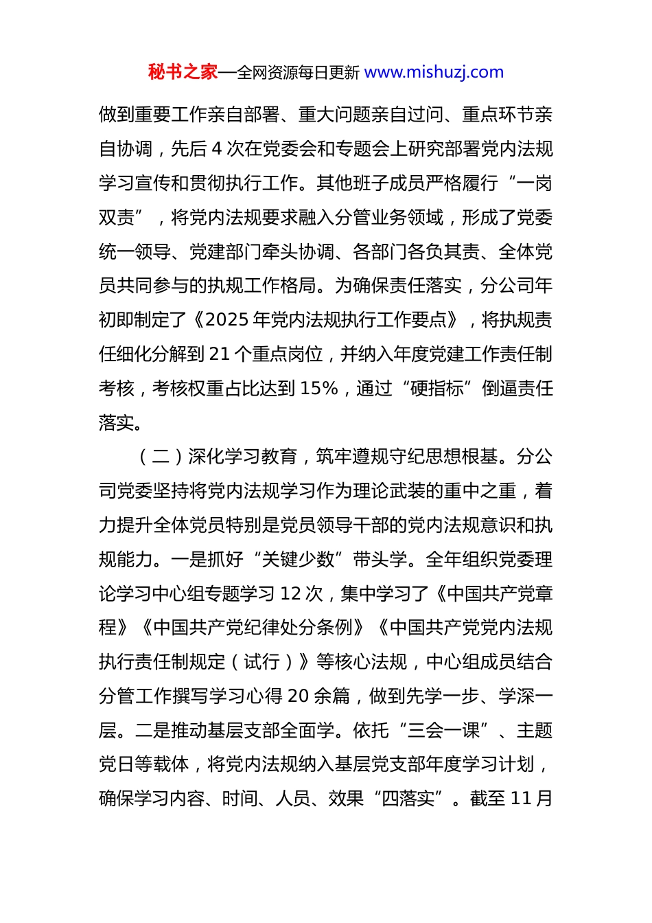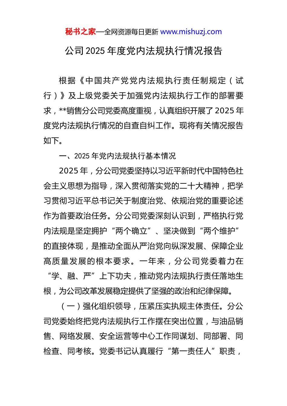 秘书之家—全网资源每日更新 www.mishuzj.com公司 2025 年度党内法规执行情况报告 根据《中国共产党党内法规执行责任制规定(试行)》及上级党委关于加强党内法规执行工作的部署要求,**销售分公司党委高度重视,认真组织开展了 2025 年度党内法规执行情况的自查自纠工作。现将有关情况报告如下。一、2025 年党内法规执行基本情况2025 年,分公司党委坚持以习近平新时代中国特色社会主义思想为指导,深入贯彻落实党的二十大精神,把学习贯彻习近平总书记关于制度治党、依规治党的重要论述作为首要政治任务。分公司党委深刻认识到,严格执行党内法规是坚定拥护“两个确立”、坚决做到“两个维护”的直接体现,是推动全面从严治党向纵深发展、保障企业高质量发展的根本要求。一年来,分公司党委着力在“学、融、严”上下功夫,推动党内法规执行责任落地生根,为公司改革发展稳定提供了坚强的政治和纪律保障。(一)强化组织领导,压紧压实执规主体责任。分公司党委始终把党内法规执行工作摆在突出位置,与油品销售、网络发展、安全运营等中心工作同谋划、同部署、同检查、同考核。党委书记认真履行“第一责任人”职责,秘书之家—全网资源每日更新 www.mishuzj.com做到重要工作亲自部署、重大问题亲自过问、重点环节亲自协调,先后 4 次在党委会和专题会上研究部署党内法规学习宣传和贯彻执行工作。其他班子成员严格履行“一岗双责”,将党内法规要求融入分管业务领域,形成了党委统一领导、党建部门牵头协调、各部门各负其责、全体党员共同参与的执规工作格局。为确保责任落实,分公司年初即制定了《2025 年党内法规执行工作要点》,将执规责任细化分解到 21 个重点岗位,并纳入年度党建工作责任制考核,考核权重占比达到 15%,通过“硬指标”倒逼责任落实。(二)深化学习教育,筑牢遵规守纪思想根基。分公司党委坚持将党内法规学习作为理论武装的重中之重,着力提升全体党员特别是党员领导干部的党内法规意识和执规能力。一是抓好“关键少数”带头学。全年组织党委理论学习中心组专题学习 12 次,集中学习了《中国共产党章程》《中国共产党纪律处分条例》《中国共产党党内法规执行责任制规定(试行)》等核心法规,中心组成员结合分管工作撰写学习心得 20 余篇,做到先学一步、学深一层。二是推动基层支部全面学。依托“三会一课”、主题党日等载体,将党内法规纳入基层党支部年度学习计划,确保学习内容、时间、人员、效果“四落实”。截至 11 月秘书之家—全网资源每日更新 www.mishuzj.com底,全公司 35 个基层党支部累计开展党内法规专题学习超过 150 次,党员教育培训覆盖率达到 100%。三是创新方式方法灵活学。充分利用“学习强国”、“铁人先锋”等线上平台,推送党内法规解读文章和案例剖析,组织党员参加线上知识竞赛,党组织活动参与率保持在 98%以上。通过常态化、制度化的学习教育,引导全体党员干部从“要我学”向“我要学”转变,营造了尊规学规守规用规的浓厚氛围。(三)坚持问题导向,推动党建与业务深度融合。分公司党委坚持学用结合、以用促学,将执行党内法规的成效体现在解决实际问题、推动业务发展上。一是将执规要求嵌入核心业务流程。针对加油站建设招投标、成品油采购供应链监管、第三方承运商管理等廉洁风险较高的领域,分公司纪委牵头修订了《关键领域廉洁风险防控手册》,将《中国共产党廉洁自律准则》等法规要求转化为28 条具体操作规程和监督要点,明确了从项目立项、招标采购到合同履行、资金支付的全流程合规标准和监督节点,确保权力在制度的轨道上运行。二是聚焦重点难点发挥党员先锋作用。在油品保供、安全生产、市场开发等急难险重任务中,设立“党员责任区”15 个,“党员示范岗”32 个。在**加油站扩建项目中,成立了由 5 名党员骨秘书之家—全网资源每日更新 www.mishuzj.com干组成的“党员攻坚队”,他们带头执行招投标纪律,严格监督工程质量与安全,确保了项目提前 10 天合规、高质量完工。据统计,2025 年党员带领团队实现非油品销售额同比增长 12.5%,处理客户有效投诉整改率达 100%。三是强...