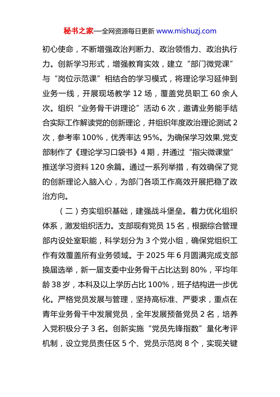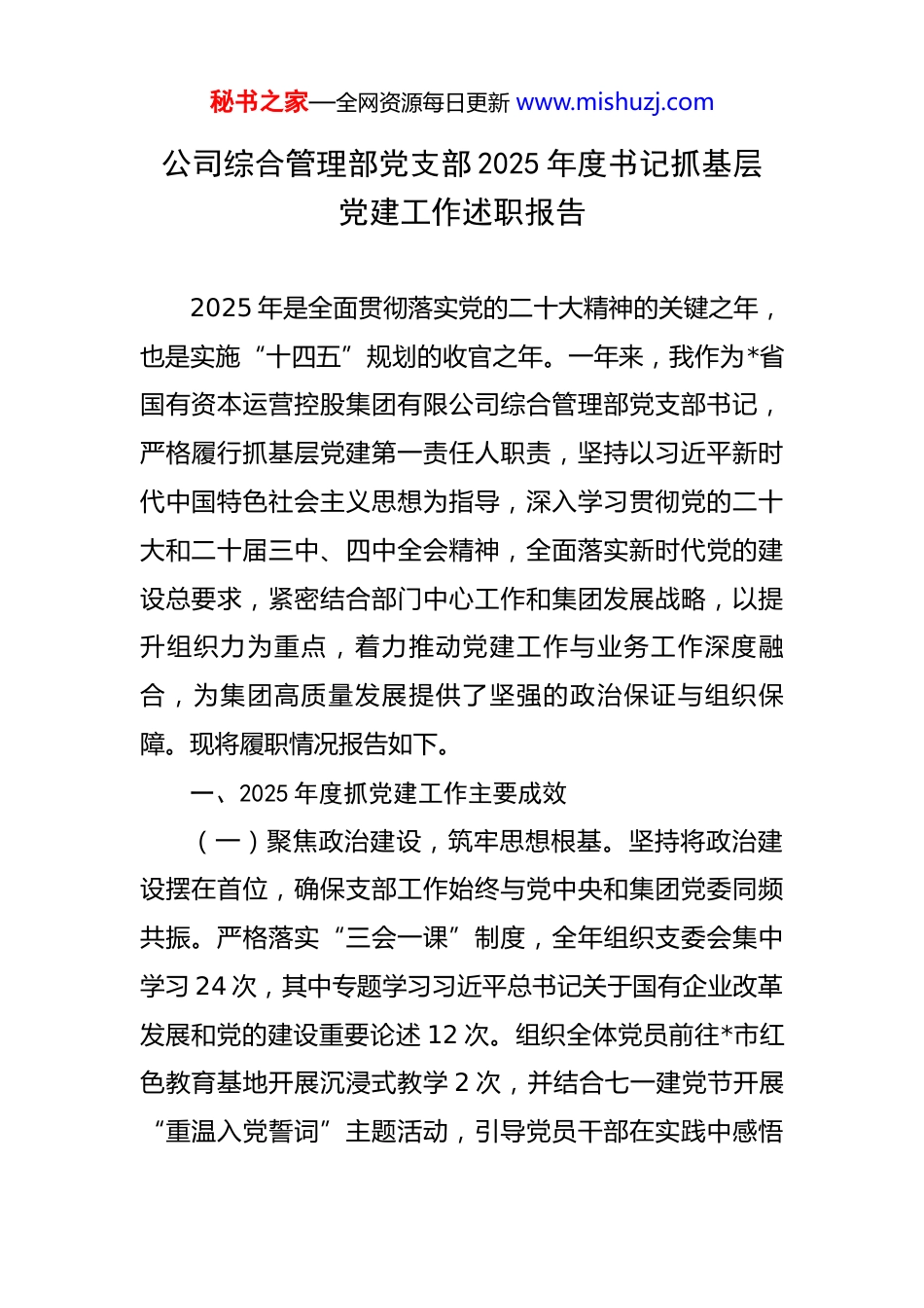 秘书之家—全网资源每日更新 www.mishuzj.com公司综合管理部党支部 2025 年度书记抓基层党建工作述职报告 2025 年是全面贯彻落实党的二十大精神的关键之年,也是实施“十四五”规划的收官之年。一年来,我作为*省国有资本运营控股集团有限公司综合管理部党支部书记,严格履行抓基层党建第一责任人职责,坚持以习近平新时代中国特色社会主义思想为指导,深入学习贯彻党的二十大和二十届三中、四中全会精神,全面落实新时代党的建设总要求,紧密结合部门中心工作和集团发展战略,以提升组织力为重点,着力推动党建工作与业务工作深度融合,为集团高质量发展提供了坚强的政治保证与组织保障。现将履职情况报告如下。一、2025 年度抓党建工作主要成效(一)聚焦政治建设,筑牢思想根基。坚持将政治建设摆在首位,确保支部工作始终与党中央和集团党委同频共振。严格落实“三会一课”制度,全年组织支委会集中学习 24 次,其中专题学习习近平总书记关于国有企业改革发展和党的建设重要论述 12 次。组织全体党员前往*市红色教育基地开展沉浸式教学 2 次,并结合七一建党节开展“重温入党誓词”主题活动,引导党员干部在实践中感悟秘书之家—全网资源每日更新 www.mishuzj.com初心使命,不断增强政治判断力、政治领悟力、政治执行力。创新学习形式,增强教育实效,建立“部门微党课”与“岗位示范课”相结合的学习模式,将理论学习延伸到业务一线,开展现场教学 12 场,覆盖党员职工 60 余人次。组织“业务骨干讲理论”活动 6 次,邀请业务能手结合实际工作解读党的创新理论,并组织年度政治理论测试 2次,参考率 100%,优秀率达 95%。为确保学习效果,党支部制作了《理论学习口袋书》4 期,并通过“指尖微课堂”推送学习资料 120 余篇。通过一系列举措,有效确保了党的创新理论入脑入心,为部门各项工作高效开展把稳了政治方向。(二)夯实组织基础,建强战斗堡垒。着力优化组织体系,激发组织活力。支部现有党员 15 名,根据综合管理部内设处室职能,科学划分为 3 个党小组,确保党组织工作有效覆盖所有业务领域。于 2025 年 6 月圆满完成支部换届选举,新一届支委中业务骨干占比达到 80%,平均年龄 38 岁,本科及以上学历占比 100%,班子结构进一步优化。严格党员发展与管理,坚持高标准、严要求,重点在青年业务骨干中发展党员,全年发展预备党员 2 名,培养入党积极分子 3 名。创新实施“党员先锋指数”量化考评机制,设立党员责任区 5 个、党员示范岗 8 个,实现关键秘书之家—全网资源每日更新 www.mishuzj.com岗位党员全覆盖,有效激励了党员在日常工作中发挥先锋模范作用。全年召开党员大会 4 次、支委会 12 次、党小组会 24 次,组织特色主题党日活动 12 次。在集团党委的坚强领导下,党支部获评集团“五星级党支部”荣誉称号,2名党员获评集团“优秀共产党员”。(三)深化党建融合,服务发展大局。始终坚持党建工作与业务工作同谋划、同部署、同考核。创新建立“党建+中心工作”深度融合机制,将党建工作要求嵌入部门年度重点任务,制定融合任务清单 30 项,确保党建工作与业务目标同向发力。组织开展“建言献策党旗红”活动,成立由党员牵头的专项工作小组 3 个,围绕集团数字化转型、内部管理优化等关键议题,成功解决业务流程堵点 12项,相关建议被集团采纳后,预计可创造间接经济效益超百万元。搭建“金点子”征集平台,收集来自各部门的意见建议 58 条,经支部党员骨干研讨分析,采纳实施 25条,有效提升了综合管理服务的效率与质量。实施“党员带徒”计划,10 名资深党员与青年员工结成对子,成功培养后备业务骨干 5 名。通过党建引领,部门工作效率同比提升 15%,服务对象满意度达到 98%,为集团稳健运营提供了有力支撑。(四)严抓作风纪律,营造清廉生态。始终将纪律和秘书之家—全网资源每日更新 www.mishuzj.com规矩挺在前面,持续深化作风建设,扎实开展深入贯彻纪律规定学习教育,制定部门《作风建设实施细则》3 项,组织专题学习 4 次,开展警示教育案例剖析会 2 次。聚焦“四风”问题...