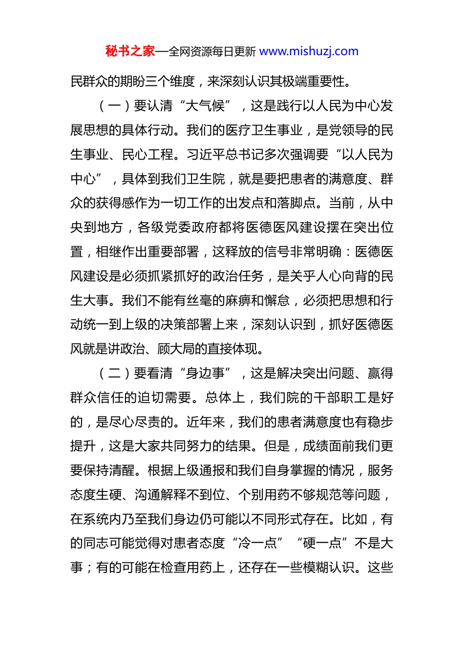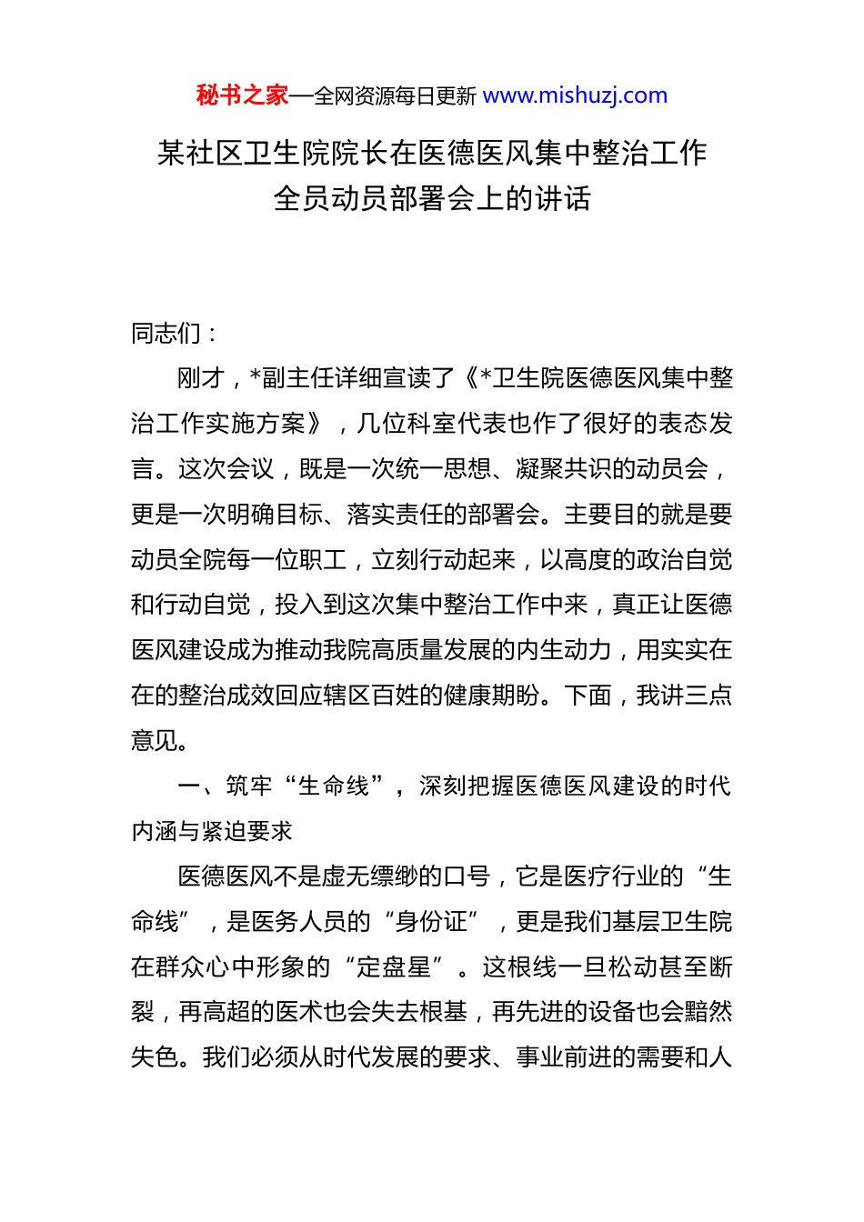 秘书之家—全网资源每日更新 www.mishuzj.com某社区卫生院院长在医德医风集中整治工作全员动员部署会上的讲话 同志们:刚才,*副主任详细宣读了《*卫生院医德医风集中整治工作实施方案》,几位科室代表也作了很好的表态发言。这次会议,既是一次统一思想、凝聚共识的动员会,更是一次明确目标、落实责任的部署会。主要目的就是要动员全院每一位职工,立刻行动起来,以高度的政治自觉和行动自觉,投入到这次集中整治工作中来,真正让医德医风建设成为推动我院高质量发展的内生动力,用实实在在的整治成效回应辖区百姓的健康期盼。下面,我讲三点意见。一、筑牢“生命线”,深刻把握医德医风建设的时代内涵与紧迫要求医德医风不是虚无缥缈的口号,它是医疗行业的“生命线”,是医务人员的“身份证”,更是我们基层卫生院在群众心中形象的“定盘星”。这根线一旦松动甚至断裂,再高超的医术也会失去根基,再先进的设备也会黯然失色。我们必须从时代发展的要求、事业前进的需要和人秘书之家—全网资源每日更新 www.mishuzj.com民群众的期盼三个维度,来深刻认识其极端重要性。(一)要认清“大气候”,这是践行以人民为中心发展思想的具体行动。我们的医疗卫生事业,是党领导的民生事业、民心工程。习近平总书记多次强调要“以人民为中心”,具体到我们卫生院,就是要把患者的满意度、群众的获得感作为一切工作的出发点和落脚点。当前,从中央到地方,各级党委政府都将医德医风建设摆在突出位置,相继作出重要部署,这释放的信号非常明确:医德医风建设是必须抓紧抓好的政治任务,是关乎人心向背的民生大事。我们不能有丝毫的麻痹和懈怠,必须把思想和行动统一到上级的决策部署上来,深刻认识到,抓好医德医风就是讲政治、顾大局的直接体现。(二)要看清“身边事”,这是解决突出问题、赢得群众信任的迫切需要。总体上,我们院的干部职工是好的,是尽心尽责的。近年来,我们的患者满意度也有稳步提升,这是大家共同努力的结果。但是,成绩面前我们更要保持清醒。根据上级通报和我们自身掌握的情况,服务态度生硬、沟通解释不到位、个别用药不够规范等问题,在系统内乃至我们身边仍可能以不同形式存在。比如,有的同志可能觉得对患者态度“冷一点”“硬一点”不是大事;有的可能在检查用药上,还存在一些模糊认识。这些秘书之家—全网资源每日更新 www.mishuzj.com问题,看似不大,但就像“蚁穴”一样,会一点点侵蚀我们与患者之间宝贵的信任堤坝。上半年全系统数据显示,超过 45%的投诉与服务态度和沟通直接相关。这个数字触目惊心,我们必须引以为戒,绝不能让自己成为下一个负面典型。(三)要瞄准“长远计”,这是推动卫生院持续健康发展的核心竞争力。卫生院要发展,靠什么?靠技术,也靠服务,但归根结底靠的是口碑,是群众发自内心的认可。一个医德高尚、医风清正的医院,本身就是一块“金字招牌”,能够吸引患者,凝聚人心,形成强大的发展合力。反之,如果风气不正,即便有再好的设备、再高的技术,患者也会望而却步。抓医德医风,表面是抓服务态度,实质是抓内涵建设,抓的是医院长远发展的“软实力”和“核心竞争力”。我们要通过这次集中整治,真正把医德医风建设转化为卫生院高质量发展的坚实基础和强大动能。二、重塑“新形象”,以刀刃向内的勇气彻底纠治顽瘴痼疾形象重于泰山,作风决定成败。这次集中整治,绝不能搞形式、走过场,必须坚持问题导向,发扬“刀刃向内”的自我革命精神,直击痛点、靶向施策,力求达到秘书之家—全网资源每日更新 www.mishuzj.com“祛沉疴”、“治未病”、“通经络”的效果,真正让群众感受到新变化、看到新气象。(一)要“祛沉疴”,坚决向突出问题亮剑。对于长期存在、群众反映强烈的顽瘴痼疾,我们必须下猛药、出重拳。一是要重点整治服务态度问题。坚决纠正对待患者“生、冷、硬、顶、推”的现象,杜绝脸难看、话难听、事难办。要倡导“人情化”服务,学会换位思考,把患者当亲人,用温暖的语言、耐心的解释、周到的服务,化解患者的焦虑,构建和谐的医患关系。二是要重点整治廉洁风险问题。紧盯“红包”、回扣、吃请等歪风邪...
