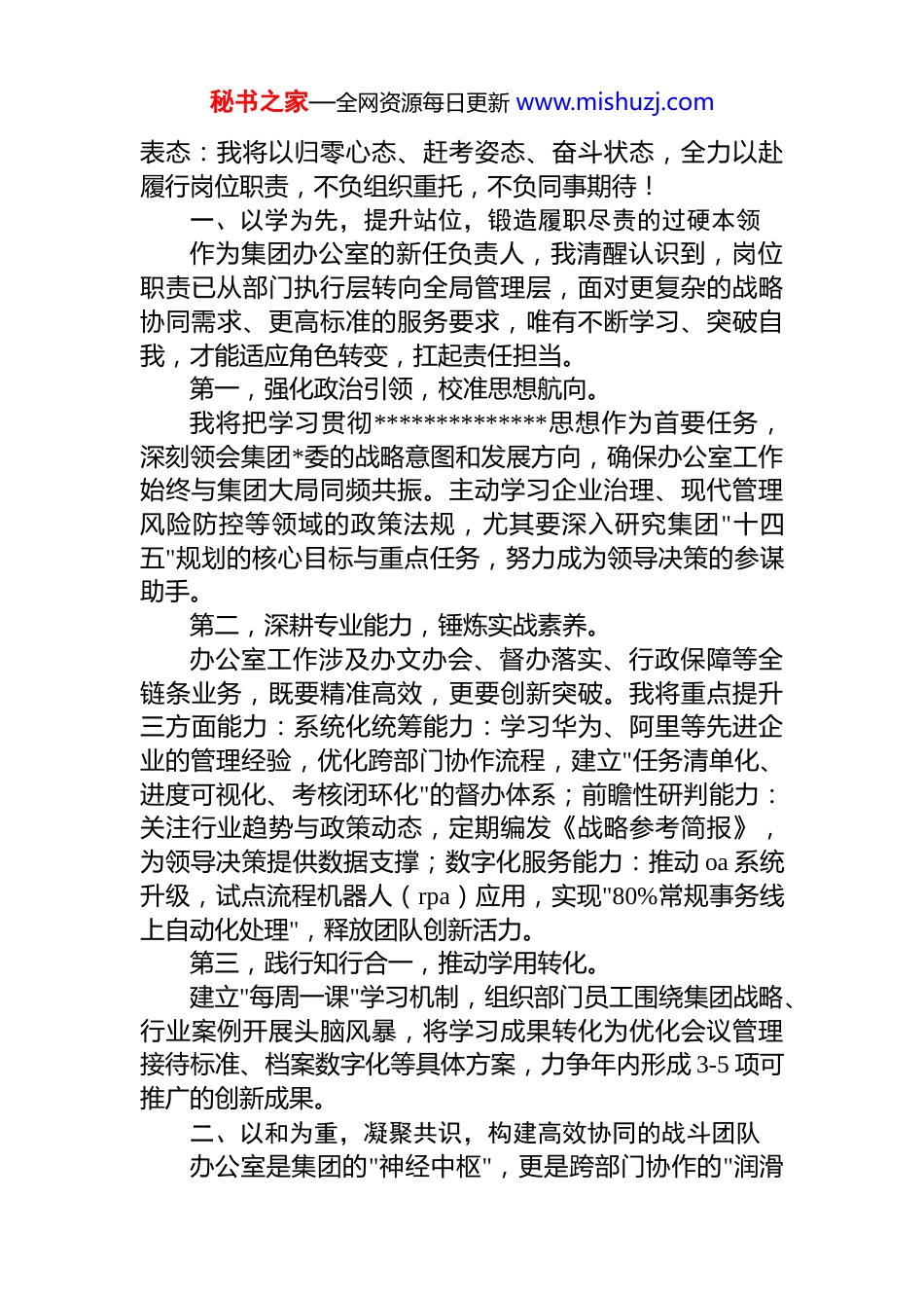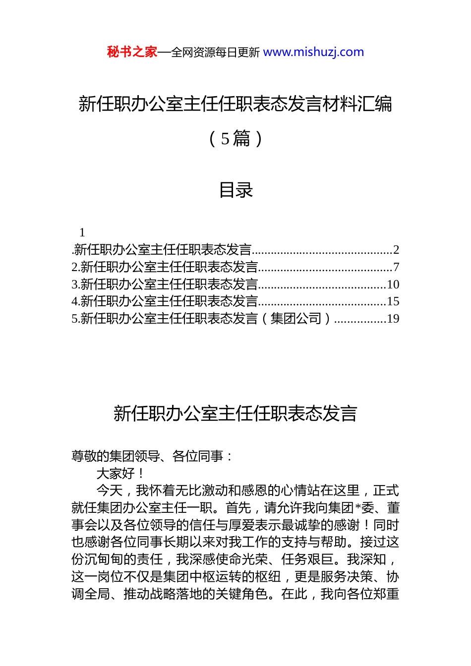 秘书之家—全网资源每日更新 www.mishuzj.com新任职办公室主任任职表态发言材料汇编(5 篇)目录1.新任职办公室主任任职表态发言............................................22.新任职办公室主任任职表态发言..........................................73.新任职办公室主任任职表态发言........................................104.新任职办公室主任任职表态发言........................................155.新任职办公室主任任职表态发言(集团公司)................19新任职办公室主任任职表态发言尊敬的集团领导、各位同事:大家好!今天,我怀着无比激动和感恩的心情站在这里,正式就任集团办公室主任一职。首先,请允许我向集团*委、董事会以及各位领导的信任与厚爱表示最诚挚的感谢!同时也感谢各位同事长期以来对我工作的支持与帮助。接过这份沉甸甸的责任,我深感使命光荣、任务艰巨。我深知,这一岗位不仅是集团中枢运转的枢纽,更是服务决策、协调全局、推动战略落地的关键角色。在此,我向各位郑重秘书之家—全网资源每日更新 www.mishuzj.com表态:我将以归零心态、赶考姿态、奋斗状态,全力以赴履行岗位职责,不负组织重托,不负同事期待!一、以学为先,提升站位,锻造履职尽责的过硬本领作为集团办公室的新任负责人,我清醒认识到,岗位职责已从部门执行层转向全局管理层,面对更复杂的战略协同需求、更高标准的服务要求,唯有不断学习、突破自我,才能适应角色转变,扛起责任担当。第一,强化政治引领,校准思想航向。我将把学习贯彻**************思想作为首要任务,深刻领会集团*委的战略意图和发展方向,确保办公室工作始终与集团大局同频共振。主动学习企业治理、现代管理风险防控等领域的政策法规,尤其要深入研究集团"十四五"规划的核心目标与重点任务,努力成为领导决策的参谋助手。第二,深耕专业能力,锤炼实战素养。办公室工作涉及办文办会、督办落实、行政保障等全链条业务,既要精准高效,更要创新突破。我将重点提升三方面能力:系统化统筹能力:学习华为、阿里等先进企业的管理经验,优化跨部门协作流程,建立"任务清单化、进度可视化、考核闭环化"的督办体系;前瞻性研判能力:关注行业趋势与政策动态,定期编发《战略参考简报》,为领导决策提供数据支撑;数字化服务能力:推动 oa 系统升级,试点流程机器人(rpa)应用,实现"80%常规事务线上自动化处理",释放团队创新活力。第三,践行知行合一,推动学用转化。建立"每周一课"学习机制,组织部门员工围绕集团战略、行业案例开展头脑风暴,将学习成果转化为优化会议管理接待标准、档案数字化等具体方案,力争年内形成 3-5 项可推广的创新成果。二、以和为重,凝聚共识,构建高效协同的战斗团队办公室是集团的"神经中枢",更是跨部门协作的"润滑秘书之家—全网资源每日更新 www.mishuzj.com剂"。我将以"三个坚持"打造一支敢打硬仗、能打胜仗的队伍:一是坚持目标共担,画好同心圆。梳理部门职责清单,明确"大服务、大协调、大督办"的职能定位,建立与战略投资部、人力资源部等部门的联席沟通机制。针对重大项目推进中的堵点问题,推行"首问负责制"和"限时办结制",确保"事事有回音、件件有着落"。二是坚持优势互补,激发内驱力。开展全员岗位胜任力评估,依据性格特质与专业特长重组科室分工:让善于沟通的同事牵头对外联络,让逻辑缜密的同事主抓制度建设,让创意活跃的同事负责品牌宣传。同步实施"ab 角轮岗计划"与"青年员工导师制",打破能力壁垒,培育复合型人才。三是坚持文化铸魂,提升归属感。策划"办公室开放日"活动,邀请一线员工参与流程优化讨论;设立"金点子奖",对节约成本、提升效率的创新建议给予专项奖励;建立员工关怀档案,帮助解决子女入学、就医绿色通道等实际困难,让团队既有战斗力、更有凝聚力。三、以干为要,狠抓落实,争当服务发展的排头兵办公室工作最忌虚功、最需实效。我将围绕集团年度"提质增效"主题,重点抓好三项攻坚行动:攻坚行动一:打造精益化行政服务体系。修订《集团会议管理办法》,推行"无会日"制度,合并同类议题,压缩会议时长 30%以上...