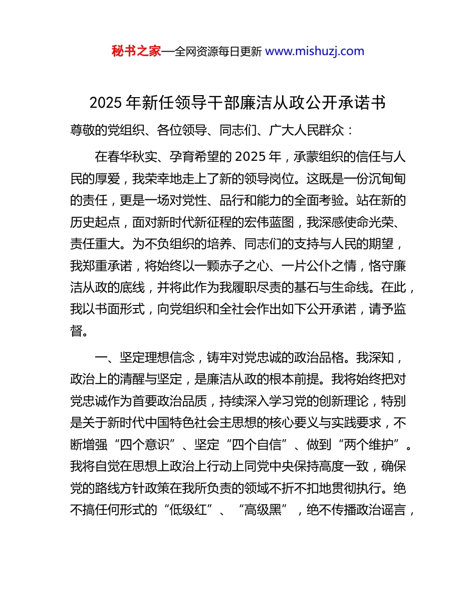 秘书之家—全网资源每日更新 www.mishuzj.com2025 年新任领导干部廉洁从政公开承诺书尊敬的党组织、各位领导、同志们、广大人民群众:在春华秋实、孕育希望的 2025 年,承蒙组织的信任与人民的厚爱,我荣幸地走上了新的领导岗位。这既是一份沉甸甸的责任,更是一场对党性、品行和能力的全面考验。站在新的历史起点,面对新时代新征程的宏伟蓝图,我深感使命光荣、责任重大。为不负组织的培养、同志们的支持与人民的期望,我郑重承诺,将始终以一颗赤子之心、一片公仆之情,恪守廉洁从政的底线,并将此作为我履职尽责的基石与生命线。在此,我以书面形式,向党组织和全社会作出如下公开承诺,请予监督。一、坚定理想信念,铸牢对党忠诚的政治品格。我深知,政治上的清醒与坚定,是廉洁从政的根本前提。我将始终把对党忠诚作为首要政治品质,持续深入学习党的创新理论,特别是关于新时代中国特色社会主思想的核心要义与实践要求,不断增强“四个意识”、坚定“四个自信”、做到“两个维护”。我将自觉在思想上政治上行动上同党中央保持高度一致,确保党的路线方针政策在我所负责的领域不折不扣地贯彻执行。绝不搞任何形式的“低级红”、“高级黑”,绝不传播政治谣言,秘书之家—全网资源每日更新 www.mishuzj.com绝不参与任何非组织活动,以绝对的忠诚擦亮共产党员的政治本色,确保手中的权力始终沿着正确的政治方向运行。二、严守纪律规矩,夯实清正廉洁的行为根基。“欲知平直,则必准绳;欲知方圆,则必规矩。”党的纪律和规矩是带电的高压线,是不可逾越的底线。我将带头学习、严格遵守党章党规党纪和国家法律法规,特别是新修订的《中国共产党纪律处分条例》,将其内化于心、外化于行。我将时刻绷紧纪律这根弦,做到令行禁止、政令畅通。在重大原则问题上,头脑特别清醒、立场特别坚定。严格执行民主集中制,凡属“三重一大”事项,坚决集体讨论决定,绝不搞“一言堂”或个人说了算。严格遵守组织程序,该请示的必须请示,该报告的必须报告,绝不搞先斩后奏、瞒报虚报。我将以如履薄冰、如临深渊的谨慎之心,对待权力、对待职责,确保每一项决策、每一个行动都经得起纪律和规矩的检验。三、秉持公心用权,恪守权力为民的本质要求。我清醒地认识到,权力是人民赋予的,只能用来为人民谋福利,绝不能异化为谋取私利的工具。我将牢固树立正确的权力观、政绩观、事业观,始终坚持“权为民所用、情为民所系、利为民所谋”。在行使权力时,我将时刻自省:权力来自哪里?权力为了谁?确保权力的行使始终围绕公共利益、服务人民群众。坚决反对特权思想和特权现象,绝不利用职权或职务影响,为本人、配偶、以及其他特定关系人,在工程项目、审批监管、资源开发、秘书之家—全网资源每日更新 www.mishuzj.com金融信贷、大宗采购、土地使用权出让等方面谋求不正当利益。我将把权力运行的每一个环节都置于阳光之下,主动接受监督,让权力在制度的轨道上规范运行,真正把好事办好、实事办实,创造出经得起历史、实践和人民检验的业绩。四、弘扬清风正气,坚守简朴高尚的生活作风。生活作风无小事,它直接关系到领导干部的形象和声誉。我将带头践行社会主义核心价值观,弘扬中华民族传统美德,恪守社会公德、职业道德、家庭美德,培养积极健康的生活情趣,坚决抵制奢靡之风和享乐主义。我将保持艰苦朴素的优良传统,在生活待遇上严格标准,不讲排场、不比阔气、不挥霍公款、不铺张浪费。同时,我将严格约束自己的言行举止,注重净化自己的“社交圈”、“生活圈”、“朋友圈”,慎独、慎微、慎初、慎终,做到台上台下一个样、人前人后一个样、八小时内与八小时外一个样。在任何场合、任何时候,都保持共产党员的先进性和纯洁性,以自身的模范行动,带动形成风清气正的良好政治生态和社会风尚。五、自觉接受监督,永葆共产党人的革命本色。监督不是不信任,而是最大的爱护和保护。我将以坦诚的态度,自觉置于党组织和广大人民群众的监督之下。严格执行领导干部报告个人有关事项规定,如实报告个人及家庭情况,绝不隐瞒、绝不造假。我将积极主动参加党的组织生活,认真开展批评与自我批评...