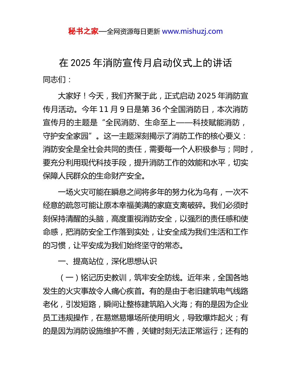 秘书之家—全网资源每日更新 www.mishuzj.com在 2025 年消防宣传月启动仪式上的讲话同志们:大家好!今天,我们齐聚于此,正式启动 2025 年消防宣传月活动。今年 11 月 9 日是第 36 个全国消防日,本次消防宣传月的主题是“全民消防、生命至上——科技赋能消防,守护安全家园”。这一主题深刻揭示了消防工作的核心要义:消防安全是全社会共同的责任,需要每一个人积极参与;同时,要充分利用现代科技手段,提升消防工作的效能和水平,切实保障人民群众的生命财产安全。一场火灾可能在瞬息之间将多年的努力化为乌有,一次不经意的疏忽可能让原本幸福美满的家庭支离破碎。我们必须时刻保持清醒的头脑,高度重视消防安全,以强烈的责任感和使命感,把消防安全工作落到实处,让安全成为我们生活和工作的习惯,让平安成为我们始终坚守的常态。一、提高站位,深化思想认识(一)铭记历史教训,筑牢安全防线。近年来,全国各地发生的火灾事故令人痛心疾首。有的是由于老旧建筑电气线路老化,引发短路,瞬间让整栋建筑陷入火海;有的是因为企业员工违规操作,在易燃易爆场所使用明火,导致爆炸起火;有的是因为消防设施维护不善,关键时刻无法正常运行;还有的秘书之家—全网资源每日更新 www.mishuzj.com是消防通道被杂物堵塞,人员无法及时疏散。这些事故背后,是无数鲜活生命的消逝,是无数家庭的破碎和痛苦。每一起火灾事故都在警示我们:火灾的发生绝非偶然,而是各种隐患长期积累的结果。我们要从这些惨痛的教训中深刻反思,时刻保持警惕,坚决杜绝类似的悲剧在我们身边重演。(二)洞察现实形势,增强忧患意识。当前,我们面临的消防安全形势依然严峻复杂。从季节因素来看,冬季气候干燥,用火用电需求大幅增加,是火灾事故的高发期。从企业自身情况来看,我们公司规模不断扩大,办公区域、生产车间、仓储物流等场所日益增多,人员密集,物资集中,一旦发生火灾,后果不堪设想。从隐患排查情况来看,部分区域的消防设施存在老化、损坏的问题,一些员工的消防安全意识淡薄,存在违规用电、用火的现象。这些问题如果得不到及时解决,随时可能引发重大火灾事故。我们必须清醒地认识到消防安全形势的严峻性,各级管理人员要增强忧患意识,充分预估可能遇到的困难,制定更加周密的防范措施,把消防安全工作做细、做实、做好。二、突出重点,强化防控措施(一)聚焦科技赋能,守护用电安全。随着科技的不断发展,电气设备在我们的生产生活中得到了广泛应用,电气火灾也成为了火灾事故的主要类型之一。我们要充分利用现代科技秘书之家—全网资源每日更新 www.mishuzj.com手段,加强电气安全管理。开展电气安全智能监测系统建设,对公司所有区域的电气线路、配电设施、用电设备进行实时监测,及时发现电气故障和安全隐患。利用大数据分析技术,对电气设备的运行状态进行评估和预警,做到早发现、早处理。严格执行用电管理制度,严禁私拉乱接电线、违规使用大功率电器等行为。办公区域下班后,要确保所有电气设备断电,做到“人走电断、人离灯灭”。加强电气设施的日常维护和保养,定期进行专业检测,及时更换老化破损的电气线路和设备。(二)严格用火管控,筑牢安全屏障。用火管理是消防安全的关键环节。我们要建立健全严格的用火管理制度,对所有涉及明火的活动进行严格审批和监管。动火作业前,必须制定详细的安全方案,配备足够的灭火器材和监护人员,并经过相关部门的审批同意。加强对明火源头的管控,在易燃易爆场所、禁烟区域等严格禁止吸烟和使用明火。食堂等用火场所要规范管理,定期检查燃气管道和灶具的安全状况,防止燃气泄漏引发火灾。在冬季取暖方面,要推广使用安全可靠的取暖设备,严禁使用存在安全隐患的电炉、热得快等取暖工具。使用空调、电暖器等取暖设备时,要与可燃物保持安全距离,并确保设备正常运行。(三)完善设施配备,织密安全网络。消防设施器材是扑救初起火灾、保障人员生命安全的重要保障。我们要按照消防技术标准和规范要求,全面检查和完善公司的消防设施配备。秘书之家—全网资源每日更新 www.mishuzj.com各部门要对本区域的消防器材进行...