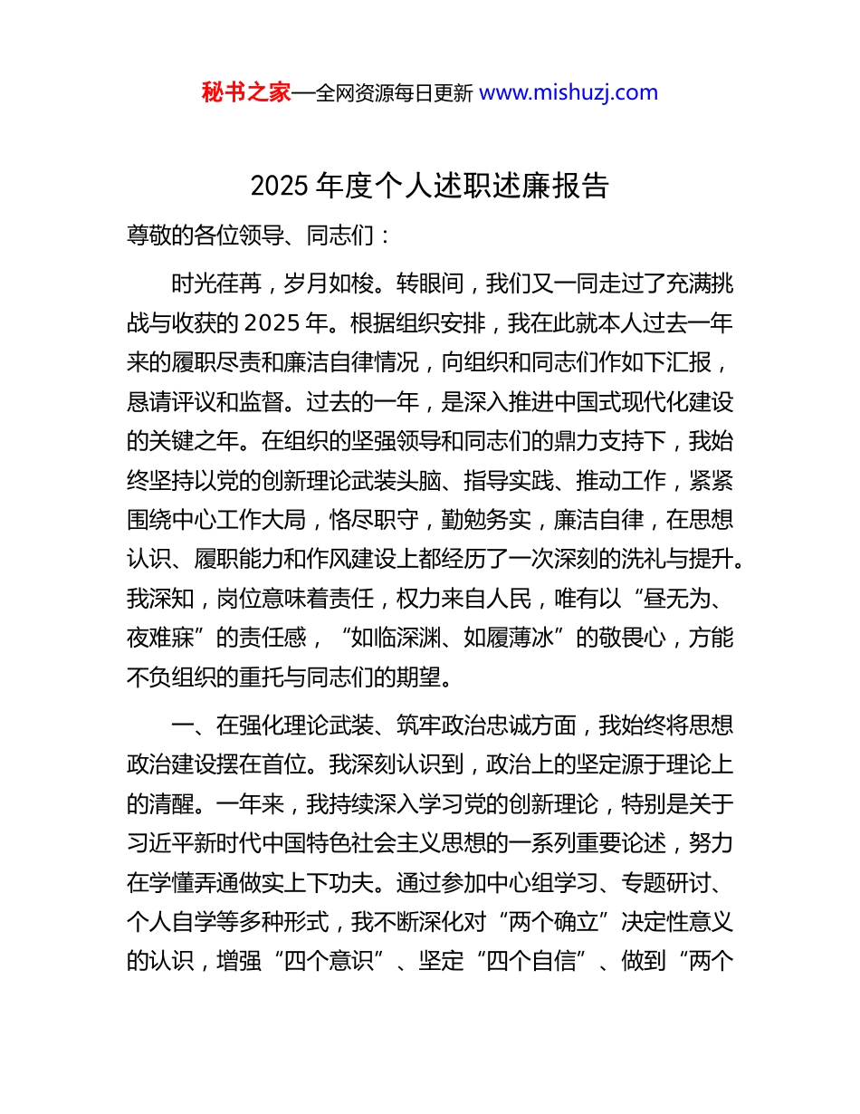 秘书之家—全网资源每日更新 www.mishuzj.com2025 年度个人述职述廉报告尊敬的各位领导、同志们:时光荏苒,岁月如梭。转眼间,我们又一同走过了充满挑战与收获的 2025 年。根据组织安排,我在此就本人过去一年来的履职尽责和廉洁自律情况,向组织和同志们作如下汇报,恳请评议和监督。过去的一年,是深入推进中国式现代化建设的关键之年。在组织的坚强领导和同志们的鼎力支持下,我始终坚持以党的创新理论武装头脑、指导实践、推动工作,紧紧围绕中心工作大局,恪尽职守,勤勉务实,廉洁自律,在思想认识、履职能力和作风建设上都经历了一次深刻的洗礼与提升。我深知,岗位意味着责任,权力来自人民,唯有以“昼无为、夜难寐”的责任感,“如临深渊、如履薄冰”的敬畏心,方能不负组织的重托与同志们的期望。一、在强化理论武装、筑牢政治忠诚方面,我始终将思想政治建设摆在首位。我深刻认识到,政治上的坚定源于理论上的清醒。一年来,我持续深入学习党的创新理论,特别是关于习近平新时代中国特色社会主义思想的一系列重要论述,努力在学懂弄通做实上下功夫。通过参加中心组学习、专题研讨、个人自学等多种形式,我不断深化对“两个确立”决定性意义的认识,增强“四个意识”、坚定“四个自信”、做到“两个秘书之家—全网资源每日更新 www.mishuzj.com维护”。我自觉将所学所思融入工作实际,努力把握新发展阶段、贯彻新发展理念、构建新发展格局的内在要求,确保自己的思想和行动始终同党中央保持高度一致,确保党的路线方针政策在我所负责的领域得到不折不扣的贯彻执行。我坚持学以致用,着力将理论学习成果转化为谋划工作的清晰思路、推动发展的具体举措和破解难题的有效方法,力求使自己的工作更好地体现时代性、把握规律性、富于创造性。二、在聚焦主责主业、推动工作落实方面,我全力以赴投身于分管领域的各项事业发展。作为分管经济建设工作的负责人,我深知责任重大。一年来,我始终秉持“实干为要、行胜于言”的原则,将主要精力和时间投入到调查研究、决策部署和督促落实中。在推动产业转型升级方面,我牵头制定了相关行动计划,多次深入园区和企业一线,协调解决土地、资金、人才等要素瓶颈问题,全力保障了高端制造产业园等重点项目的顺利推进,预计全年可实现工业投资增长*%。在着力于民生福祉改善方面,我高度关注教育、医疗、养老等群众急难愁盼问题,推动实施了“一老一小”暖心服务工程完成了*个老旧小区的改造提升,有效提升了辖区居民的获得感、幸福感、安全感。在应对夏季特大暴雨洪涝灾害过程中,我坚守岗位,靠前指挥,科学调度,与同志们并肩作战,最大程度地保障了人民群众的生命财产安全,确保了社会大局的和谐稳定。回顾一年的工作,虽然面临诸多困难和压力,但在团队的通力协作秘书之家—全网资源每日更新 www.mishuzj.com下,各项既定目标任务均得以顺利完成或超额完成,这让我倍感欣慰,也深知其中凝聚着每一位同志的心血与汗水。三、在严守纪律规矩、永葆清廉本色方面,我时刻绷紧廉洁自律这根弦。我清醒地认识到,廉洁是干部的立身之本。一年来,我严格遵守党的政治纪律、组织纪律、廉洁纪律、群众纪律、工作纪律和生活纪律,认真贯彻落实中央八项规定及其实施细则精神,坚决抵制各种不正之风。在权力行使上,我始终坚持民主集中制原则,对于“三重一大”事项,一律提交集体讨论决定,绝不搞“一言堂”或个人说了算,确保权力在阳光下运行。我自觉净化自己的“社交圈”“生活圈”“朋友圈”,做到慎独、慎微、慎初、慎友,从未利用职权或职务影响为本人、配偶以及其他特定关系人,在工程项目、资源开发、金融信贷、土地出让等方面谋求不正当利益。在个人生活上,我坚持勤俭节约,反对铺张浪费,注重培养健康的生活情趣,严格管束家人和身边工作人员,共同构筑起拒腐防变的家庭和工作防线。我认真履行“一岗双责”,在抓好业务工作的同时,切实抓好分管领域的党风廉政建设,常态化开展廉政谈话提醒,对苗头性、倾向性问题及时“咬耳扯袖”,努力营造风清气正的政治生态。四、在深刻反思自省、认识存在不足方面,我清醒地看到自身仍存在一...