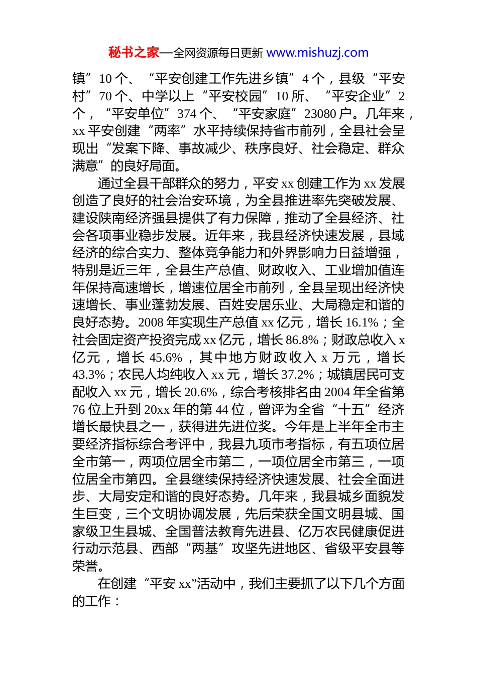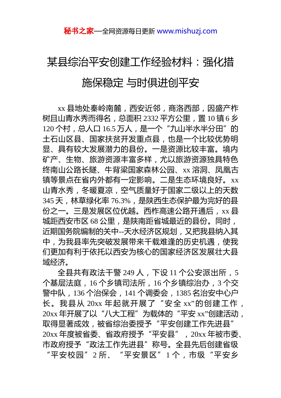 秘书之家—全网资源每日更新 www.mishuzj.com某县综治平安创建工作经验材料:强化措施保稳定 与时俱进创平安xx 县地处秦岭南麓,西安近邻,商洛西部,因盛产柞树且山青水秀而得名,总面积 2332 平方公里,置 10 镇 6 乡120 个村,总人口 16.5 万人,是一个“九山半水半分田”的土石山区县、国家扶贫开发重点县,也是一个比较优势明显、具有较大发展潜力的县份。一是资源比较丰富。境内矿产、生物、旅游资源丰富多样,尤以旅游资源独具特色终南山公路长隧、牛背梁国家森林公园、xx 溶洞、凤凰古镇等景点在省内外都有一定影响。二是生态环境良好。xx山青水秀,冬暖夏凉,空气质量好于国家二级以上的天数345 天,林草绿化率 76.3%,是陕西生态保护最为完好的县份之一。三是发展区位优越。西柞高速公路开通后,xx 县城距西安市区 68 公里,是陕南距省城最近的县份。同时,近期国务院编制的关中--天水经济区规划,又把我县纳入其中,为我县率先突破发展带来千载难逢的历史机遇,使我们更加有利于依托以西安为核心的国家经济区发展壮大县域经济。全县共有政法干警 249 人,下设 11 个公安派出所,5个基层法庭,16 个乡镇司法所,16 个乡镇综治办,3 个交警中队,136 个治保会,141 个调委会,1385 名治安中心户长。我县从 20xx 年起就开展了“安全 xx”的创建工作,20xx 年开展了以“八大工程”为载体的“平安 xx”创建活动,取得显著成效,被省综治委授予“平安创建工作先进县”20xx 年度被省委、省政府授予“平安县”,20xx 年被市委、市政府授予“政法工作先进县”称号。全县先后创建省级“平安校园”2 所、“平安景区”1 个,市级“平安乡秘书之家—全网资源每日更新 www.mishuzj.com镇”10 个、“平安创建工作先进乡镇”4 个,县级“平安村”70 个、中学以上“平安校园”10 所、“平安企业”2个,“平安单位”374 个、“平安家庭”23080 户。几年来,xx 平安创建“两率”水平持续保持省市前列,全县社会呈现出“发案下降、事故减少、秩序良好、社会稳定、群众满意”的良好局面。通过全县干部群众的努力,平安 xx 创建工作为 xx 发展创造了良好的社会治安环境,为全县推进率先突破发展、建设陕南经济强县提供了有力保障,推动了全县经济、社会各项事业稳步发展。近年来,我县经济快速发展,县域经济的综合实力、整体竞争能力和外界影响力日益增强,特别是近三年,全县生产总值、财政收入、工业增加值连年保持高速增长,增速位居全市前列,全县呈现出经济快速增长、事业蓬勃发展、百姓安居乐业、大局稳定和谐的良好态势。2008 年实现生产总值 xx 亿元,增长 16.1%;全社会固定资产投资完成 xx 亿元,增长 86.8%;财政总收入 x亿 元 , 增 长 45.6% , 其 中 地 方 财 政 收 入 x 万 元 , 增 长43.3%;农民人均纯收入 xx 元,增长 37.2%;城镇居民可支配收入 xx 元,增长 20.6%,综合考核排名由 2004 年全省第76 位上升到 20xx 年的第 44 位,曾评为全省“十五”经济增长最快县之一,获得进先进位奖。今年是上半年全市主要经济指标综合考评中,我县九项市考指标,有五项位居全市第一,两项位居全市第二,一项位居全市第三,一项位居全市第四。全县继续保持经济快速发展、社会全面进步、大局安定和谐的良好态势。几年来,我县城乡面貌发生巨变,三个文明协调发展,先后荣获全国文明县城、国家级卫生县城、全国普法教育先进县、亿万农民健康促进行动示范县、西部“两基”攻坚先进地区、省级平安县等荣誉。在创建“平安 xx”活动中,我们主要抓了以下几个方面的工作:秘书之家—全网资源每日更新 www.mishuzj.com一、加强组织领导,强化工作措施,努力为平安创建提供有力保障在创建“平安 xx”活动中,县委、县政府从领导、责任、措施、宣传、经费五个方面入手,通过“五个到位”为平安创建工作提供了全面的保障。(一)组织领导到位。县委、县政府把平安创建工作纳入经济社会发展总体规划,列入各乡镇、各部门年度重要工作目标,作为各级*委、政府年度政绩考核的重要内容。县上成立了由...