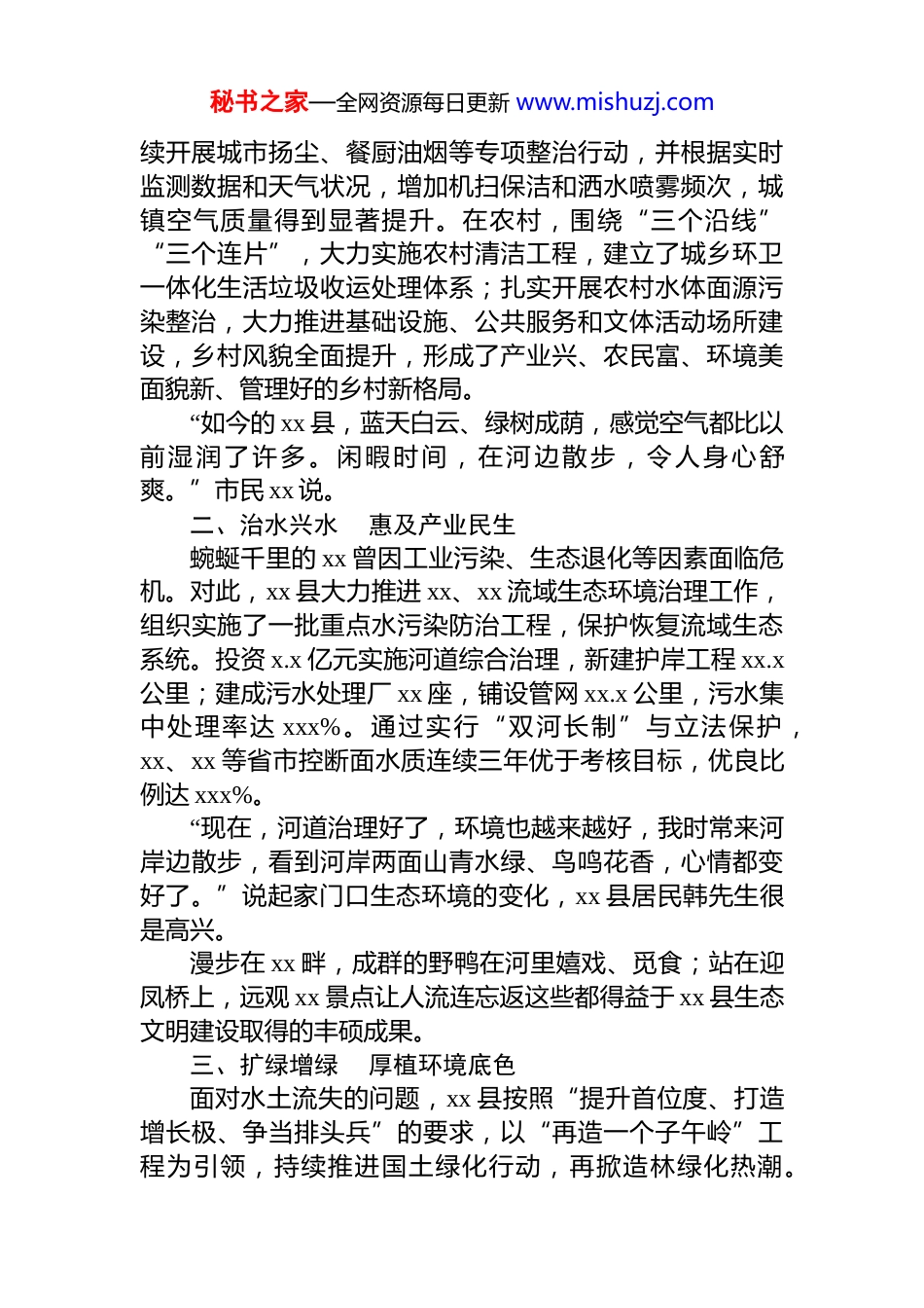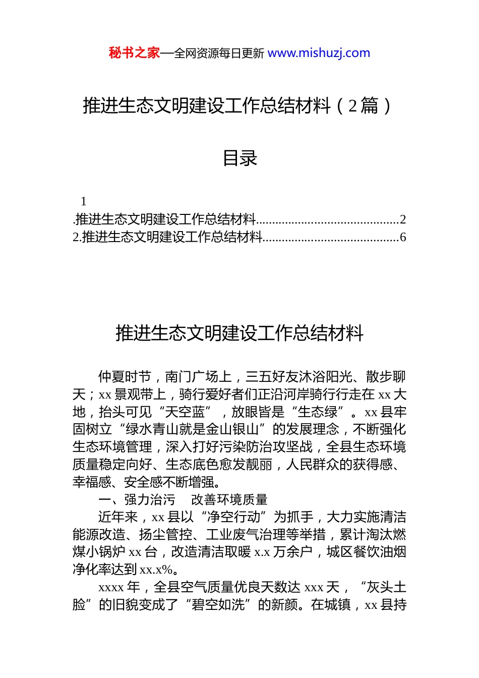 秘书之家—全网资源每日更新 www.mishuzj.com推进生态文明建设工作总结材料(2 篇)目录1.推进生态文明建设工作总结材料............................................22.推进生态文明建设工作总结材料..........................................6推进生态文明建设工作总结材料仲夏时节,南门广场上,三五好友沐浴阳光、散步聊天;xx 景观带上,骑行爱好者们正沿河岸骑行行走在 xx 大地,抬头可见“天空蓝”,放眼皆是“生态绿”。xx 县牢固树立“绿水青山就是金山银山”的发展理念,不断强化生态环境管理,深入打好污染防治攻坚战,全县生态环境质量稳定向好、生态底色愈发靓丽,人民群众的获得感、幸福感、安全感不断增强。一、强力治污改善环境质量近年来,xx 县以“净空行动”为抓手,大力实施清洁能源改造、扬尘管控、工业废气治理等举措,累计淘汰燃煤小锅炉 xx 台,改造清洁取暖 x.x 万余户,城区餐饮油烟净化率达到 xx.x%。xxxx 年,全县空气质量优良天数达 xxx 天,“灰头土脸”的旧貌变成了“碧空如洗”的新颜。在城镇,xx 县持秘书之家—全网资源每日更新 www.mishuzj.com续开展城市扬尘、餐厨油烟等专项整治行动,并根据实时监测数据和天气状况,增加机扫保洁和洒水喷雾频次,城镇空气质量得到显著提升。在农村,围绕“三个沿线”“三个连片”,大力实施农村清洁工程,建立了城乡环卫一体化生活垃圾收运处理体系;扎实开展农村水体面源污染整治,大力推进基础设施、公共服务和文体活动场所建设,乡村风貌全面提升,形成了产业兴、农民富、环境美面貌新、管理好的乡村新格局。“如今的 xx 县,蓝天白云、绿树成荫,感觉空气都比以前湿润了许多。闲暇时间,在河边散步,令人身心舒爽。”市民 xx 说。二、治水兴水惠及产业民生蜿蜒千里的 xx 曾因工业污染、生态退化等因素面临危机。对此,xx 县大力推进 xx、xx 流域生态环境治理工作,组织实施了一批重点水污染防治工程,保护恢复流域生态系统。投资 x.x 亿元实施河道综合治理,新建护岸工程 xx.x公里;建成污水处理厂 xx 座,铺设管网 xx.x 公里,污水集中处理率达 xxx%。通过实行“双河长制”与立法保护,xx、xx 等省市控断面水质连续三年优于考核目标,优良比例达 xxx%。“现在,河道治理好了,环境也越来越好,我时常来河岸边散步,看到河岸两面山青水绿、鸟鸣花香,心情都变好了。”说起家门口生态环境的变化,xx 县居民韩先生很是高兴。漫步在 xx 畔,成群的野鸭在河里嬉戏、觅食;站在迎凤桥上,远观 xx 景点让人流连忘返这些都得益于 xx 县生态文明建设取得的丰硕成果。三、扩绿增绿厚植环境底色面对水土流失的问题,xx 县按照“提升首位度、打造增长极、争当排头兵”的要求,以“再造一个子午岭”工程为引领,持续推进国土绿化行动,再掀造林绿化热潮。秘书之家—全网资源每日更新 www.mishuzj.comxxxx 年以来,累计造林 xxx.x 万亩,打造万亩以上示范点xx 个、xxxx 亩以上示范点 xx 个,森林覆盖率从 xx.xx%提升至 xx.xx%,植被覆盖率达 xx%。同步推进“固沟保塬”与坡耕地治理,建成淤地坝 xx 座,治理水土流失 xxx 平方公里,形成了“山、水、城、林”一体化的生态屏障。生态文明建设不仅改善了生态环境,也为全县经济发展注入了新动力。生态旅游、生态农业等绿色产业蓬勃发展,带动当地群众增收致富。xx 村等特色村,依托良好的生态环境,以田园采摘为特色,发展生态旅游,吸引众多游客前来观光、体验,成为 xx 县生态旅游的新名片。四、筑牢屏障守护绿色家园从划定生态红线到建立“三级河长制”,从环保督察问题整改到公众参与机制完善,xx 县构建了“*政主导、部门联动、全民共治”的生态治理体系。xxxx 年,中央及省级环保督察反馈的 xx 项问题整改完成 xx 项,办结群众信访xxx 件,生态环境信息公开与公众参与度显著提升。xx 县严格落实“八机制三清单一包保一承诺”工作措施,召开专题会议部署森林草原防灭火工作。在 xx 等重点区域设立森林草原火险因子综合监测站 x 处。利用多种媒介大力宣传防火常识,在重点时段对重点...