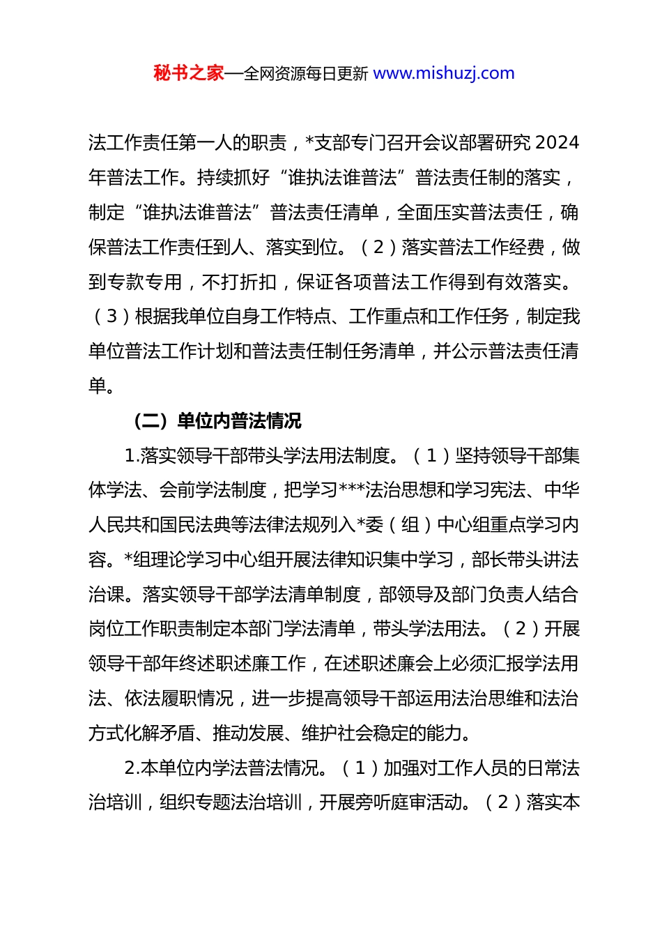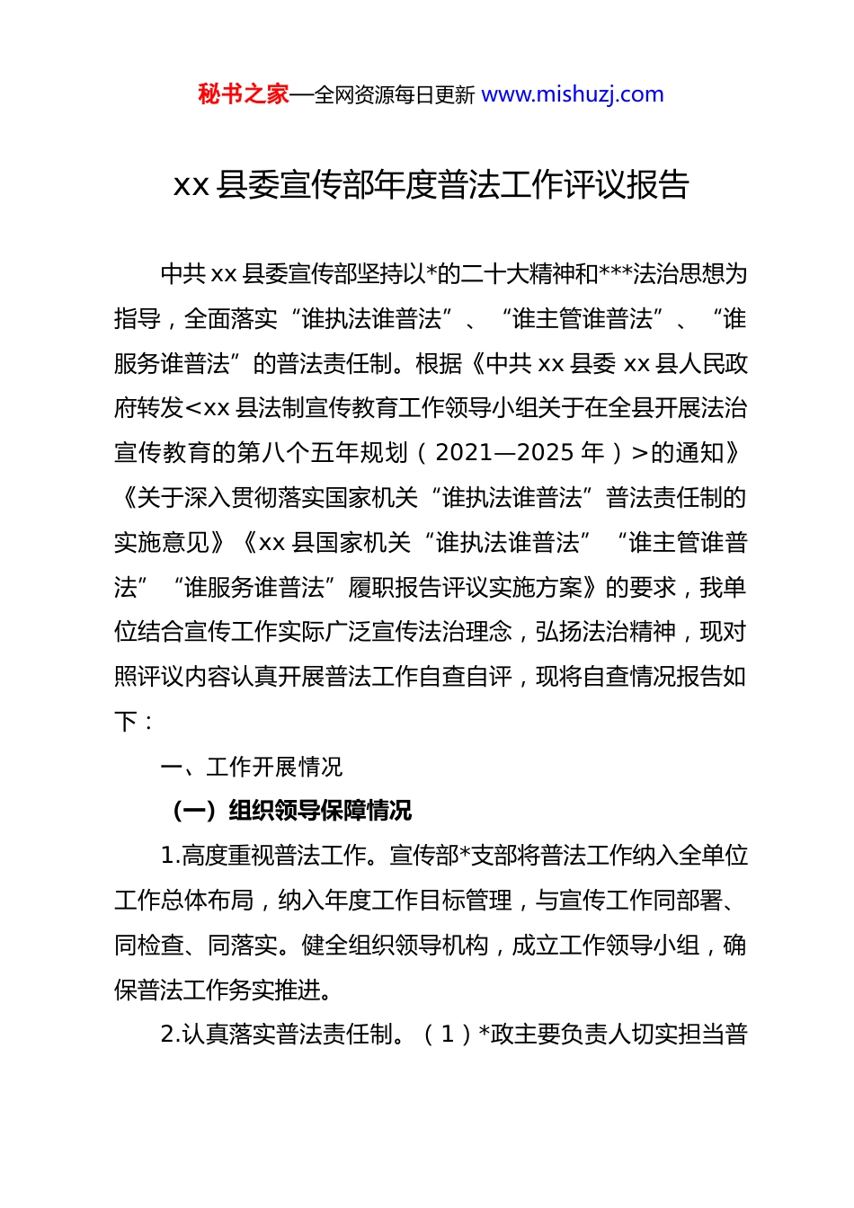 秘书之家—全网资源每日更新 www.mishuzj.comxx 县委宣传部年度普法工作评议报告中共 xx 县委宣传部坚持以*的二十大精神和***法治思想为指导,全面落实“谁执法谁普法”、“谁主管谁普法”、“谁服务谁普法”的普法责任制。根据《中共 xx 县委 xx 县人民政府转发的通知》《关于深入贯彻落实国家机关“谁执法谁普法”普法责任制的实施意见》《xx 县国家机关“谁执法谁普法”“谁主管谁普法”“谁服务谁普法”履职报告评议实施方案》的要求,我单位结合宣传工作实际广泛宣传法治理念,弘扬法治精神,现对照评议内容认真开展普法工作自查自评,现将自查情况报告如下:一、工作开展情况(一)组织领导保障情况1.高度重视普法工作。宣传部*支部将普法工作纳入全单位工作总体布局,纳入年度工作目标管理,与宣传工作同部署、同检查、同落实。健全组织领导机构,成立工作领导小组,确保普法工作务实推进。2.认真落实普法责任制。(1)*政主要负责人切实担当普秘书之家—全网资源每日更新 www.mishuzj.com法工作责任第一人的职责,*支部专门召开会议部署研究 2024年普法工作。持续抓好“谁执法谁普法”普法责任制的落实,制定“谁执法谁普法”普法责任清单,全面压实普法责任,确保普法工作责任到人、落实到位。(2)落实普法工作经费,做到专款专用,不打折扣,保证各项普法工作得到有效落实。(3)根据我单位自身工作特点、工作重点和工作任务,制定我单位普法工作计划和普法责任制任务清单,并公示普法责任清单。(二)单位内普法情况1.落实领导干部带头学法用法制度。(1)坚持领导干部集体学法、会前学法制度,把学习***法治思想和学习宪法、中华人民共和国民法典等法律法规列入*委(组)中心组重点学习内容。*组理论学习中心组开展法律知识集中学习,部长带头讲法治课。落实领导干部学法清单制度,部领导及部门负责人结合岗位工作职责制定本部门学法清单,带头学法用法。(2)开展领导干部年终述职述廉工作,在述职述廉会上必须汇报学法用法、依法履职情况,进一步提高领导干部运用法治思维和法治方式化解矛盾、推动发展、维护社会稳定的能力。2.本单位内学法普法情况。(1)加强对工作人员的日常法治培训,组织专题法治培训,开展旁听庭审活动。(2)落实本秘书之家—全网资源每日更新 www.mishuzj.com单位工作年度法律知识考试和任职法律知识考试制度,组织部领导干部参加全县领导干部网上法律知识考试或分类学法考法,参考率达 100%;合格率达 100%。(3)开展机关法治文化建设,在我单位外墙上设立法治文化宣传宣传,宣传***法治思想;依托 xx 之窗 app 进行普法宣传。(4)狠抓*风廉政建设。加强*政主要负责人述法制度,认真贯彻《*内监督条例》,坚决反“四风”、强作风,加强惩防体系建设,弘扬法治精神,提高普法宣传教育工作的实效性。(三)面向社会普法情况1.对网民开展法治宣传教育。积极响应“全国普法行”系列活动,联合县融媒体中心、县市管局、县城管局、县教体局等单位,共同开展“2024 年 xx 县网信普法宣传活动”。采用“线上+线下”相结合的方式,通过全县各新时代文明实践所(站)、各中小学、各商户酒店等渠道开展进社区、进校园、进企业、进乡村、进机关、进军营、进网络“七进”活动,通过播放宣传标语、组织理论宣讲、发放宣传折页、悬挂宣传条幅等形式,向群众深入解读互联网法律法规,引导群众树立良好的法治观念。将学习宣传贯彻*的二十大精神与网信普法宣传紧密结合,深入宣传***法治思想、******关于网络强国的重要思想,形成全社会关心、支持和参与网信普法的浓厚氛围,营秘书之家—全网资源每日更新 www.mishuzj.com造健康向上的清朗网络空间。2.开展了“清朗·优化营商环境—整治涉企侵权信息乱象”、“清朗·打击违法信息外链”、“清朗·整治‘自媒体’无底线博流量”等 20 余次专项行动,在 xx 之窗 app 上开设“互联网平台监管”“涉企”“指尖上的形式主义”“涉移风易俗乡风文明”等专项行动举报专区,对“xx 地...