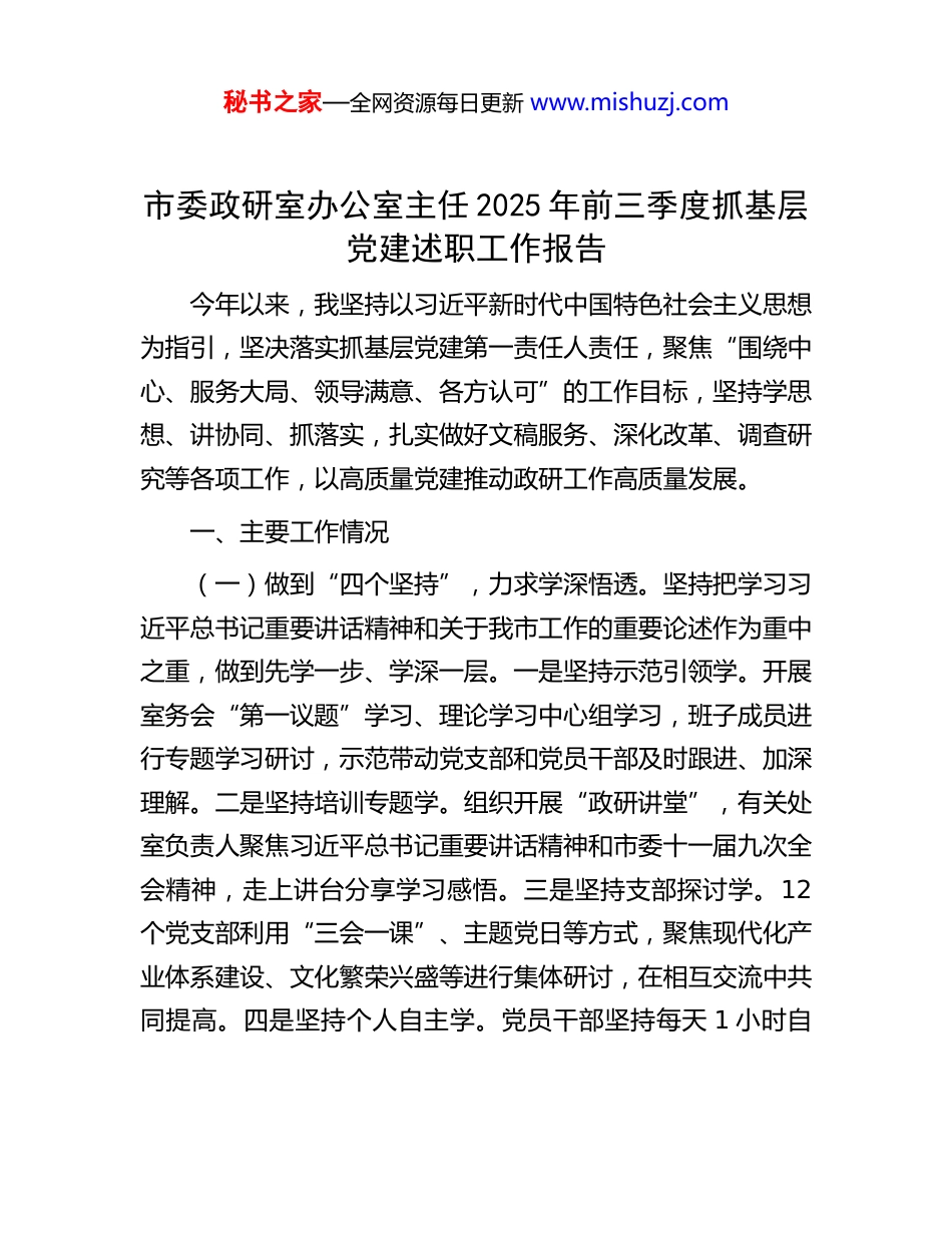 秘书之家—全网资源每日更新 www.mishuzj.com市委政研室办公室主任 2025 年前三季度抓基层党建述职工作报告今年以来,我坚持以习近平新时代中国特色社会主义思想为指引,坚决落实抓基层党建第一责任人责任,聚焦“围绕中心、服务大局、领导满意、各方认可”的工作目标,坚持学思想、讲协同、抓落实,扎实做好文稿服务、深化改革、调查研究等各项工作,以高质量党建推动政研工作高质量发展。一、主要工作情况(一)做到“四个坚持”,力求学深悟透。坚持把学习习近平总书记重要讲话精神和关于我市工作的重要论述作为重中之重,做到先学一步、学深一层。一是坚持示范引领学。开展室务会“第一议题”学习、理论学习中心组学习,班子成员进行专题学习研讨,示范带动党支部和党员干部及时跟进、加深理解。二是坚持培训专题学。组织开展“政研讲堂”,有关处室负责人聚焦习近平总书记重要讲话精神和市委十一届九次全会精神,走上讲台分享学习感悟。三是坚持支部探讨学。12个党支部利用“三会一课”、主题党日等方式,聚焦现代化产业体系建设、文化繁荣兴盛等进行集体研讨,在相互交流中共同提高。四是坚持个人自主学。党员干部坚持每天 1 小时自秘书之家—全网资源每日更新 www.mishuzj.com主学习,用好《习近平关于我市工作论述摘编》等,在读原著、学原文、悟原理中努力做到学思践悟、融会贯通。(二)聚焦“三个维度”,强化理论宣讲。立足政研改革职能优势,充分利用专题宣讲、调研宣讲等方式,为让党的创新理论在中原大地落地生根、开花结果贡献力量。一是专题宣讲有高度。有关室领导和处室负责人围绕习近平总书记重要讲话精神、市委十一届九次全会精神等,受邀到市委统战部、市财政厅等单位开展专题宣讲 10 余次。二是调研宣讲有深度。利 用 到 郑 州 、 开 封 等 市 县 开 展 调 查 研 究 契 机 , 围 绕“1+2+4+N”目标任务体系对基层党员干部和企业职工等宣讲全会精神,引导基层干部群众增进认识、加深理解。三是基层宣讲有温度。利用到定点帮扶村、新时代文明实践中心联系点开展“四送一助力”等活动契机,用通俗易懂、喜闻乐见的语言为乡镇、村“两委”干部和基层群众进行宣讲。依托《日报》等主流媒体刊发多篇理论文章,积极做好宣传阐释工作。(三)立足“四项职能”,抓好工作落实。立足文稿服务深化改革、调查研究、信息服务、决策咨询服务等职能抓好贯彻落实。一是扎实做好文稿服务。完成市委主要领导在市委十一届九次全会,全市认真学习习近平总书记考察重要讲话精神,锲而不舍落实中央八项规定精神、学查改一体推进大会、加强社会治理工作会议、推动文化繁荣兴盛工作会议等系列会议上的讲话。牵头完成《市委关于深入学习贯彻习近平总书记在考秘书之家—全网资源每日更新 www.mishuzj.com察时重要讲话精神奋力谱写中原大地推进中国式现代化新篇章的决定》等重要文件。二是协调推进深化改革。对有关市直、中央在我市单位承接落实的重大改革任务定期听取跟进改革进展、取得成效。统筹推动跨部门改革,联合卫生健康、医保等部门印发《市因地制宜推广三明医改经验实施方案》《市集中带量采购药品“三进”专项行动实施方案》。围绕习近平总书记强调的优化营商环境、积极融入和服务全国统一大市场等重点改革领域深化研究,形成关于市管企业压减层级瘦身健体情况等报告,获得市委主要领导批示肯定,部分意见建议纳入市委市政府决策。提出 7 项“便民利民微改革”举措,让改革成果更多更公平惠及人民群众。三是深入开展调查研究。围绕“1+2+4+N”总体部署,分类别分专题开展调查研究,调研报告多次获得市领导批示。对习近平总书记强调的“推动高质量发展,因地制宜发展新质生产力”要求,撰写调研报告《新形势下加快我市人工智能人才队伍建设的几点建议》。对习近平总书记强调的“扎扎实实加强社会治理”,撰写完成《新社会组织党建工作的“难”与“解”》《关于做好新一轮全市村“两委”换届的思考与建议》等调研报告。四是全力做好信息服务。坚持所选刊物围绕“两高四着力”重大要求,聚焦影响经济社会持续健康发展的突出矛盾,人民群众切身...