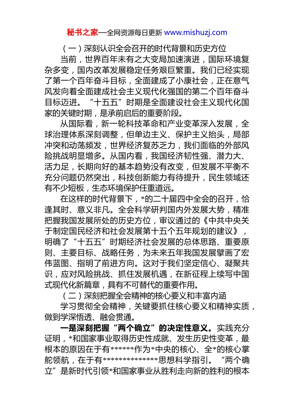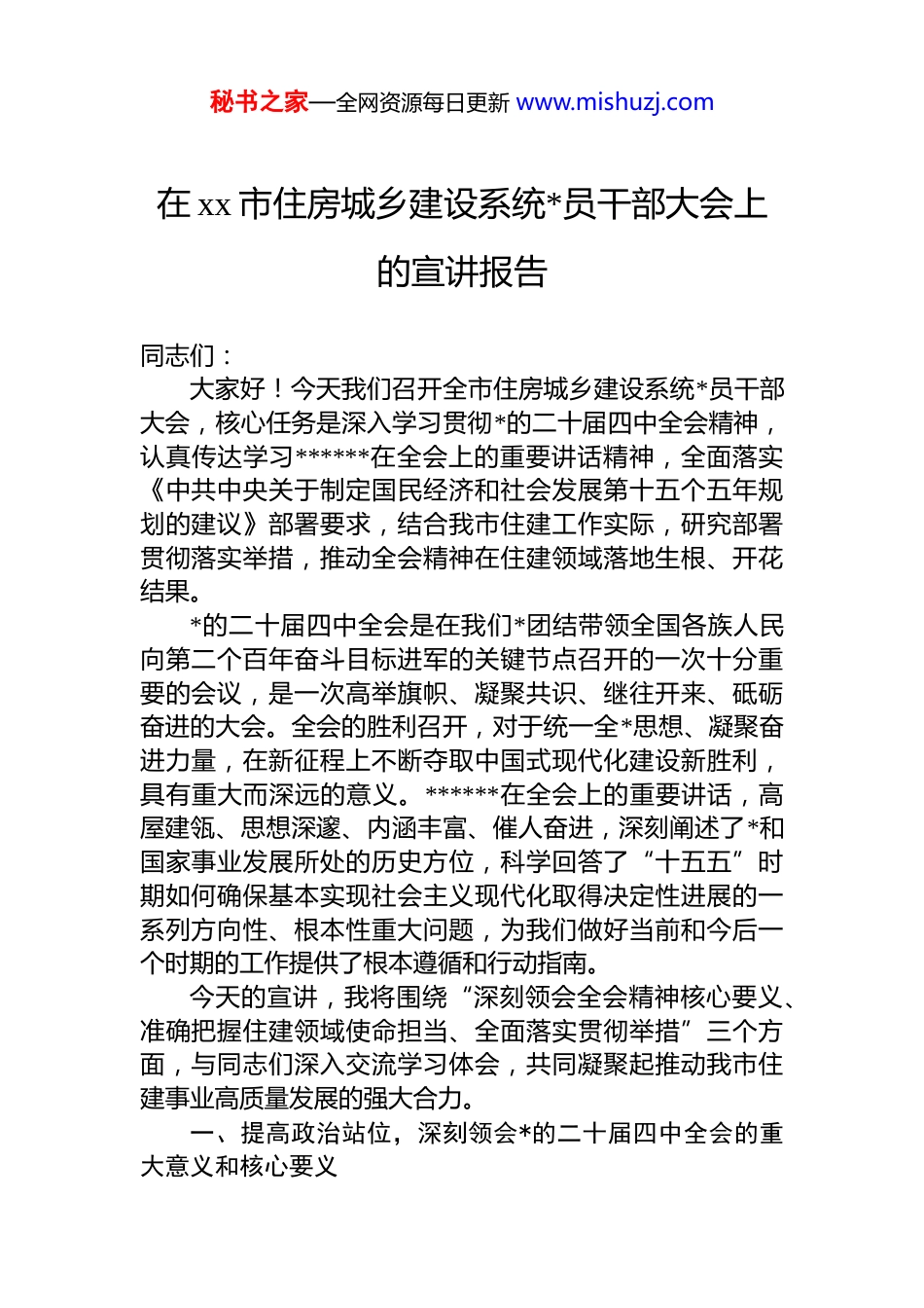 秘书之家—全网资源每日更新 www.mishuzj.com在 xx 市住房城乡建设系统*员干部大会上的宣讲报告同志们:大家好!今天我们召开全市住房城乡建设系统*员干部大会,核心任务是深入学习贯彻*的二十届四中全会精神,认真传达学习******在全会上的重要讲话精神,全面落实《中共中央关于制定国民经济和社会发展第十五个五年规划的建议》部署要求,结合我市住建工作实际,研究部署贯彻落实举措,推动全会精神在住建领域落地生根、开花结果。*的二十届四中全会是在我们*团结带领全国各族人民向第二个百年奋斗目标进军的关键节点召开的一次十分重要的会议,是一次高举旗帜、凝聚共识、继往开来、砥砺奋进的大会。全会的胜利召开,对于统一全*思想、凝聚奋进力量,在新征程上不断夺取中国式现代化建设新胜利,具有重大而深远的意义。******在全会上的重要讲话,高屋建瓴、思想深邃、内涵丰富、催人奋进,深刻阐述了*和国家事业发展所处的历史方位,科学回答了“十五五”时期如何确保基本实现社会主义现代化取得决定性进展的一系列方向性、根本性重大问题,为我们做好当前和今后一个时期的工作提供了根本遵循和行动指南。今天的宣讲,我将围绕“深刻领会全会精神核心要义、准确把握住建领域使命担当、全面落实贯彻举措”三个方面,与同志们深入交流学习体会,共同凝聚起推动我市住建事业高质量发展的强大合力。一、提高政治站位,深刻领会*的二十届四中全会的重大意义和核心要义秘书之家—全网资源每日更新 www.mishuzj.com(一)深刻认识全会召开的时代背景和历史方位当前,世界百年未有之大变局加速演进,国际环境复杂多变,国内改革发展稳定任务艰巨繁重。我们已经实现了第一个百年奋斗目标,全面建成了小康社会,正在意气风发向着全面建成社会主义现代化强国的第二个百年奋斗目标迈进。“十五五”时期是全面建设社会主义现代化国家的关键时期,是承前启后的重要阶段。从国际看,新一轮科技革命和产业变革深入发展,全球治理体系深刻调整,但单边主义、保护主义抬头,局部冲突和动荡频发,世界经济复苏乏力,我们面临的外部风险挑战明显增多。从国内看,我国经济韧性强、潜力大、活力足,长期向好的基本趋势没有改变,但发展不平衡不充分问题仍然突出,科技创新能力有待提升,民生领域还有不少短板,生态环境保护任重道远。在这样的时代背景下,*的二十届四中全会的召开,恰逢其时、意义非凡。全会科学研判国内外发展大势,精准把握我国发展所处的历史方位,审议通过的《中共中央关于制定国民经济和社会发展第十五个五年规划的建议》,明确了“十五五”时期经济社会发展的总体思路、重要原则、主要目标、战略任务,为未来五年我国发展擘画了宏伟蓝图、指明了前进方向。这对于我们坚定信心、凝聚共识,应对风险挑战、抓住发展机遇,在新征程上续写中国式现代化新篇章,具有不可替代的重要作用。(二)深刻把握全会精神的核心要义和丰富内涵学习贯彻全会精神,关键要抓住核心要义和精神实质,做到学深悟透、融会贯通。一是深刻把握“两个确立”的决定性意义。实践充分证明,*和国家事业取得历史性成就、发生历史性变革,最根本的原因在于有******作为*中央的核心、全*的核心掌舵领航,在于有**************思想科学指引。“两个确立”是新时代引领*和国家事业从胜利走向新的胜利的根本秘书之家—全网资源每日更新 www.mishuzj.com政治保证。我们要深刻领悟“两个确立”的决定性意义,增强“四个意识”、坚定“四个自信”、做到“两个维护”,始终在思想上政治上行动上同以***同志为核心的*中央保持高度一致。二是深刻把握“十五五”时期的总体要求和主要目标。全会提出了“十五五”时期经济社会发展的总体要求,强调要坚持以**************思想为指导,全面贯彻*的二十大和二十届二中、三中、四中全会精神,紧紧围绕推进中国式现代化,完整、准确、全面贯彻新发展理念,加快构建新发展格局,着力推动高质量发展。主要目标包括:经济发展质效显著提升,创新驱动能力大幅增强,改革开放纵深推进,民生福祉达到新水平,生态环境持续改善,安全发展能力显著提高,基本实现社会主义现代化取得...