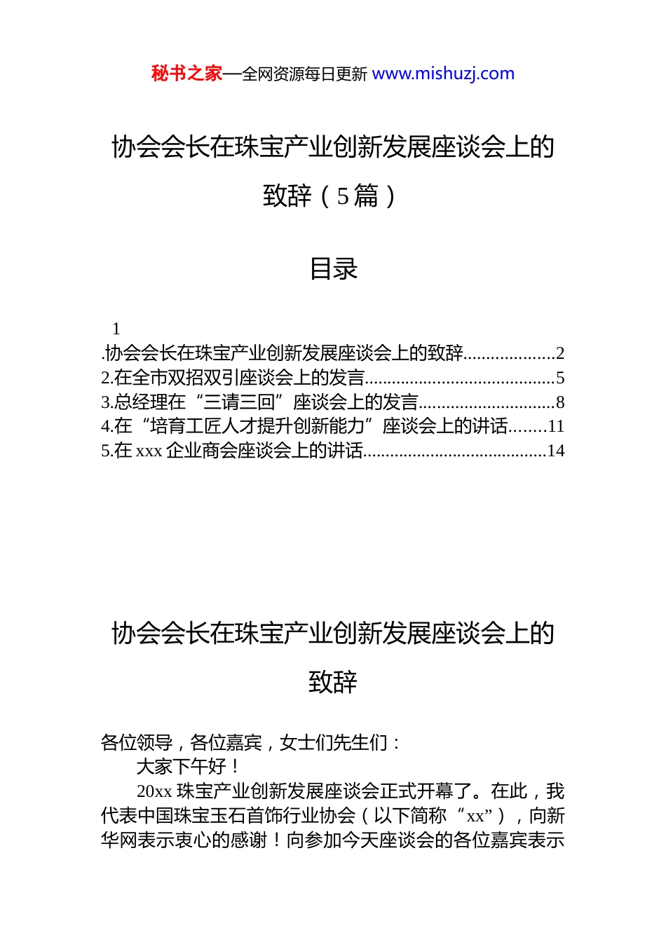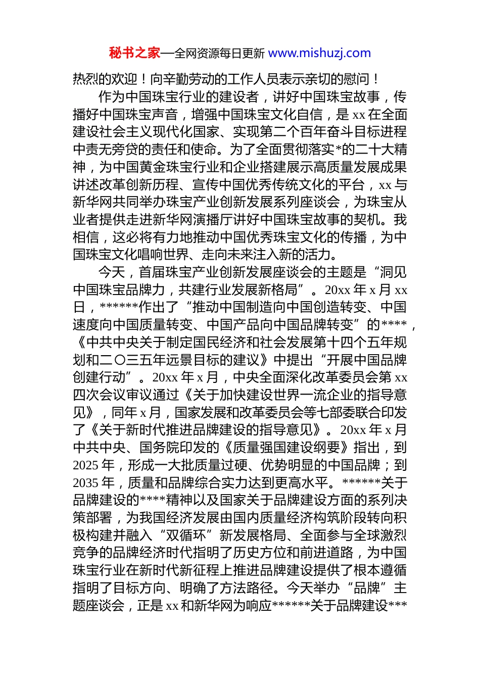 秘书之家—全网资源每日更新 www.mishuzj.com协会会长在珠宝产业创新发展座谈会上的致辞(5 篇)目录1.协会会长在珠宝产业创新发展座谈会上的致辞....................22.在全市双招双引座谈会上的发言..........................................53.总经理在“三请三回”座谈会上的发言..............................84.在“培育工匠人才提升创新能力”座谈会上的讲话........115.在 xxx 企业商会座谈会上的讲话.........................................14协会会长在珠宝产业创新发展座谈会上的致辞各位领导,各位嘉宾,女士们先生们:大家下午好!20xx 珠宝产业创新发展座谈会正式开幕了。在此,我代表中国珠宝玉石首饰行业协会(以下简称“xx”),向新华网表示衷心的感谢!向参加今天座谈会的各位嘉宾表示秘书之家—全网资源每日更新 www.mishuzj.com热烈的欢迎!向辛勤劳动的工作人员表示亲切的慰问!作为中国珠宝行业的建设者,讲好中国珠宝故事,传播好中国珠宝声音,增强中国珠宝文化自信,是 xx 在全面建设社会主义现代化国家、实现第二个百年奋斗目标进程中责无旁贷的责任和使命。为了全面贯彻落实*的二十大精神,为中国黄金珠宝行业和企业搭建展示高质量发展成果讲述改革创新历程、宣传中国优秀传统文化的平台,xx 与新华网共同举办珠宝产业创新发展系列座谈会,为珠宝从业者提供走进新华网演播厅讲好中国珠宝故事的契机。我相信,这必将有力地推动中国优秀珠宝文化的传播,为中国珠宝文化唱响世界、走向未来注入新的活力。今天,首届珠宝产业创新发展座谈会的主题是“洞见中国珠宝品牌力,共建行业发展新格局”。20xx 年 x 月 xx日,******作出了“推动中国制造向中国创造转变、中国速度向中国质量转变、中国产品向中国品牌转变”的****,《中共中央关于制定国民经济和社会发展第十四个五年规划和二〇三五年远景目标的建议》中提出“开展中国品牌创建行动”。20xx 年 x 月,中央全面深化改革委员会第 xx四次会议审议通过《关于加快建设世界一流企业的指导意见》,同年 x 月,国家发展和改革委员会等七部委联合印发了《关于新时代推进品牌建设的指导意见》。20xx 年 x 月中共中央、国务院印发的《质量强国建设纲要》指出,到2025 年,形成一大批质量过硬、优势明显的中国品牌;到2035 年,质量和品牌综合实力达到更高水平。******关于品牌建设的****精神以及国家关于品牌建设方面的系列决策部署,为我国经济发展由国内质量经济构筑阶段转向积极构建并融入“双循环”新发展格局、全面参与全球激烈竞争的品牌经济时代指明了历史方位和前进道路,为中国珠宝行业在新时代新征程上推进品牌建设提供了根本遵循指明了目标方向、明确了方法路径。今天举办“品牌”主题座谈会,正是 xx 和新华网为响应******关于品牌建设***秘书之家—全网资源每日更新 www.mishuzj.com*精神的一大举措,座谈会将围绕着如何贯彻落实******关于品牌建设的指示精神展开研讨。xx 倡议:一是要将珠宝产业创新发展座谈会打造成为珠宝行业文化传播与价值引领的标杆性平台,以品牌化、专业化的平台建设助推中国黄金珠宝品牌建设;二是要坚持守正创新,深入挖掘中国珠宝传统文化并创意创新,打造符合时代特征、具有新的历史特点的珠宝文化符号与题材;三是要大力宣传行业先进典型与优秀事迹,发挥先进模范带头作用,充分展现新时代珠宝行业风采;四是要善于抓住珠宝行业热点话题,用足、用好、用活珠宝行业的大事、好事、喜事等题材,运用网言网语讲好新时代珠宝行业正能量故事;五是要提升走好网上群众路线的能力,引导珠宝文化宣传主题和社会公众关注热点同频共振,创造群众喜闻乐见的新时代珠宝文化形态。各位同仁,路虽远,行则将至;事虽难,做则必成。站在中国珠宝文化建设的新起点上,过去和未来接替承续机遇与挑战并存同行。面对新时代、新征程、新任务、新要求,我们不仅要坚定中国珠宝文化自信,坚守服务人民的立场,更要以坚若磐石的战略定力,以抓铁有痕、踏石留印的韧劲,采取切实可行的举措,推进中国珠宝文化建设在新时代新征程实现更大发展、发挥更大作用...