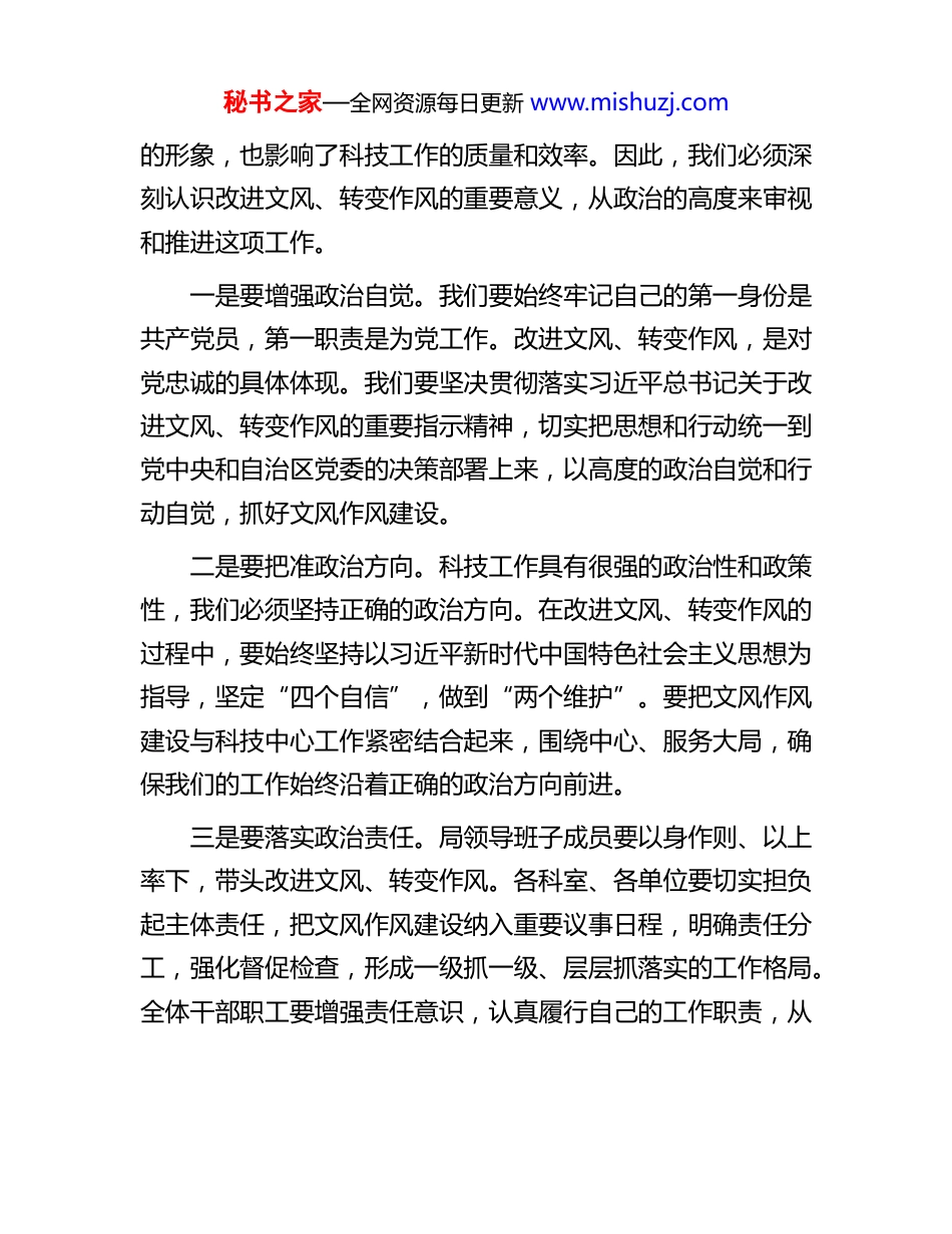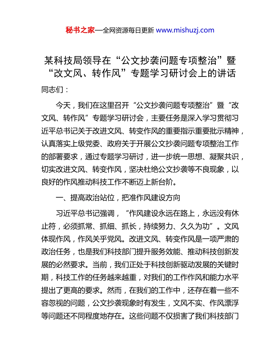 秘书之家—全网资源每日更新 www.mishuzj.com某科技局领导在“公文抄袭问题专项整治”暨“改文风、转作风”专题学习研讨会上的讲话同志们:今天,我们在这里召开“公文抄袭问题专项整治”暨“改文风、转作风”专题学习研讨会,主要任务是深入学习贯彻习近平总书记关于改进文风、转变作风的重要指示重要批示精神,认真落实上级党委、政府关于开展公文抄袭问题专项整治工作的部署要求,通过专题学习研讨,进一步统一思想、凝聚共识,切实改进文风、转变作风,坚决杜绝公文抄袭等不良现象,以良好的作风推动科技工作不断迈上新台阶。一、提高政治站位,把准作风建设方向习近平总书记强调,“作风建设永远在路上,永远没有休止符,必须抓常、抓细、抓长,持续努力、久久为功”。文风体现作风,作风关乎党风。改进文风、转变作风是一项严肃的政治任务,也是我们科技部门提升服务效能、推动科技创新发展的必然要求。当前,我们正处于科技创新驱动发展的关键时期,科技工作的任务越来越重,对我们的工作作风和能力水平提出了更高的要求。然而,在我们的工作中,还存在着一些不容忽视的问题,公文抄袭现象时有发生,文风不实、作风漂浮等问题还不同程度地存在。这些问题不仅损害了我们科技部门秘书之家—全网资源每日更新 www.mishuzj.com的形象,也影响了科技工作的质量和效率。因此,我们必须深刻认识改进文风、转变作风的重要意义,从政治的高度来审视和推进这项工作。一是要增强政治自觉。我们要始终牢记自己的第一身份是共产党员,第一职责是为党工作。改进文风、转变作风,是对党忠诚的具体体现。我们要坚决贯彻落实习近平总书记关于改进文风、转变作风的重要指示精神,切实把思想和行动统一到党中央和自治区党委的决策部署上来,以高度的政治自觉和行动自觉,抓好文风作风建设。二是要把准政治方向。科技工作具有很强的政治性和政策性,我们必须坚持正确的政治方向。在改进文风、转变作风的过程中,要始终坚持以习近平新时代中国特色社会主义思想为指导,坚定“四个自信”,做到“两个维护”。要把文风作风建设与科技中心工作紧密结合起来,围绕中心、服务大局,确保我们的工作始终沿着正确的政治方向前进。三是要落实政治责任。局领导班子成员要以身作则、以上率下,带头改进文风、转变作风。各科室、各单位要切实担负起主体责任,把文风作风建设纳入重要议事日程,明确责任分工,强化督促检查,形成一级抓一级、层层抓落实的工作格局。全体干部职工要增强责任意识,认真履行自己的工作职责,从秘书之家—全网资源每日更新 www.mishuzj.com每一篇公文撰写、每一项工作任务落实做起,切实改进文风、转变作风。二、强化理论学习,筑牢作风改进基础习近平总书记指出,“中国共产党人依靠学习走到今天,也必然要依靠学习走向未来。”加强理论学习是改进文风、转变作风的基础和前提。只有不断加强理论学习,才能提高我们的政治素养和业务能力,才能使我们的文风更加清新、作风更加务实。我们这次会议集中学习了习近平总书记关于改进文风、转变作风的重要论述,以及相关的制度文件,这只是一个开始。接下来,我们要进一步强化理论学习,建立常态化的学习机制,不断提高学习的质量和效果。一是要系统学习党中央和自治区党委关于作风建设、文风改进的重要论述和精神。要原原本本、原汁原味地学习习近平总书记的重要讲话精神,深刻领会其精神实质和丰富内涵。要深入学习自治区党委关于作风建设的部署要求,准确把握工作重点和方向。通过系统学习,切实增强我们改进文风、转变作风的思想自觉和行动自觉。二是要紧密结合科技工作实际开展针对性学习。科技工作有其自身的特点和规律,我们要结合实际,有针对性地学习相关的科技政策、法律法规和业务知识。要通过学习,不断提高我们的业务水平和工作能力,使我们能够更好地适应科技创新秘书之家—全网资源每日更新 www.mishuzj.com发展的需要。同时,要把学习与解决实际问题结合起来,针对我们在文风作风方面存在的问题,以及科技工作中的难点、热点问题,深入开展调查研究,提出切实可行的解决办法。三是要坚持学用结合、知行合一。学习的目...