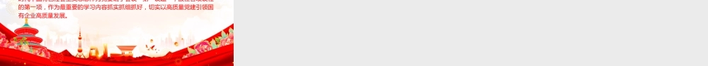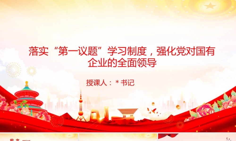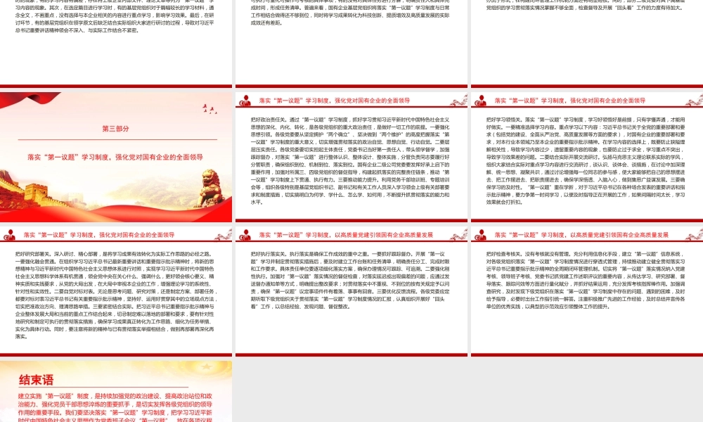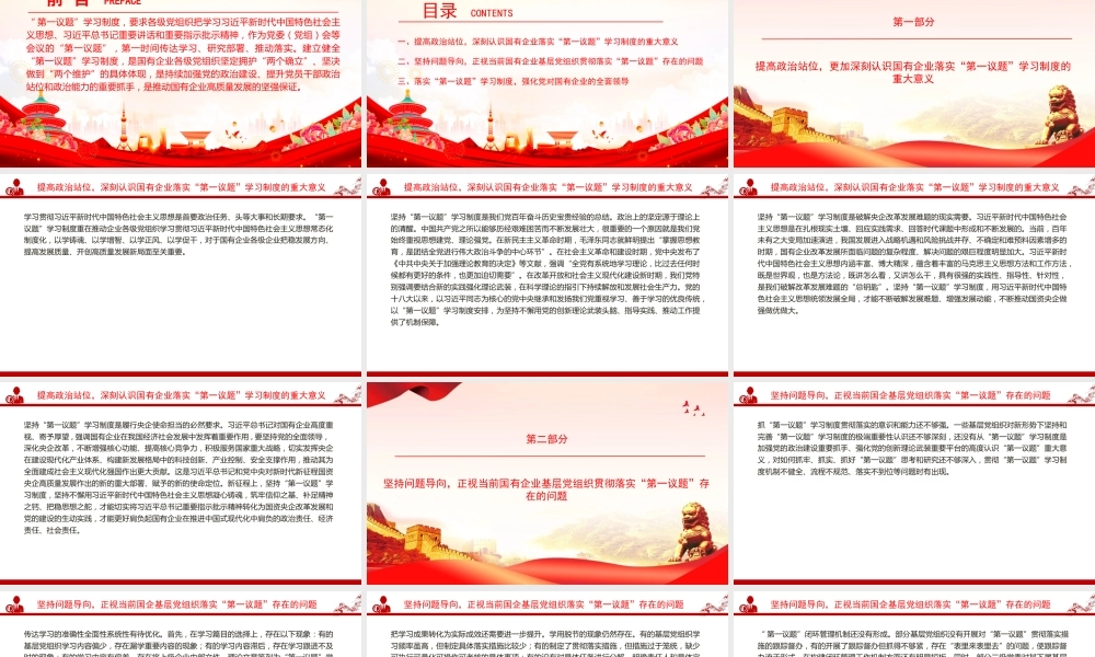 落实“第一议题”学习制度,强化党对国有企业的全面领导授课人: * 书记前 言 PREFACE“ 第一议题”学习制度,要求各级党组织把学习习近平新时代中国特色社会主义思想、习近平总书记重要讲话和重要指示批示精神,作为党委(党组)会等会议的“第一议题”,第一时间传达学习、研究部署、推动落实。建立健全“第一议题”学习制度,是国有企业各级党组织坚定拥护“两个确立”、坚决做到“两个维护”的具体体现,是持续加强党的政治建设、提升党员干部政治站位和政治能力的重要抓手,是推动国有企业高质量发展的坚强保证。目录 CONTENTS一、提高政治站位,深刻认识国有企业落实“第一议题”学习制度的重大意义二、坚持问题导向,正视当前国有企业基层党组织贯彻落实“第一议题”存在的问题三、落实“第一议题”学习制度,强化党对国有企业的全面领导提高政治站位,更加深刻认识国有企业落实“第一议题”学习制度的重大意义第一部分提高政治站位,深刻认识国有企业落实“第一议题”学习制度的重大意义学习贯彻习近平新时代中国特色社会主义思想是首要政治任务、头等大事和长期要求。“第一议题”学习制度重在推动企业各级党组织学习贯彻习近平新时代中国特色社会主义思想常态化制度化,以学铸魂、以学增智、以学正风、以学促干,对于国有企业各级企业把稳发展方向、提高发展质量、开创高质量发展新局面至关重要。提高政治站位,深刻认识国有企业落实“第一议题”学习制度的重大意义坚持“第一议题”学习制度是我们党百年奋斗历史宝贵经验的总结。政治上的坚定源于理论上的清醒。中国共产党之所以能够历经艰难困苦而不断发展壮大,很重要的一个原因就是我们党始终重视思想建党、理论强党。在新民主主义革命时期,毛泽东同志就鲜明提出“掌握思想教育,是团结全党进行伟大政治斗争的中心环节”。在社会主义革命和建设时期,党中央发布了《中共中央关于加强理论教育的决定》等文献,强调“全党有系统地学习理论,比过去任何时候都有更好的条件,也更加迫切需要”。在改革开放和社会主义现代化建设新时期,我们党特别强调要结合新的实践强化理论武装,在科学理论的指引下持续解放和发展社会生产力。党的十八大以来,以习近平同志为核心的党中央继承和发扬我们党重视学习、善于学习的优良传统,以“第一议题”学习制度安排,为坚持不懈用党的创新理论武装头脑、指导实践、推动工作提供了机制保障。提高政治站位,深刻认识国有企业落实“第一议题”学习制度的重大意义坚持“第一议题”学习制度是破解央企改革发展难题的现实需要。习近平新时代中国特色社会主义思想是在扎根现实土壤、回应实践需求、回答时代课题中形成和不断发展的。当前,百年未有之大变局加速演进,我国发展进入战略机遇和风险挑战并存、不确定和难预料因素增多的时期,国有企业改革发展所面临问题的复杂程度、解决问题的艰巨程度明显加大。习近平新时代中国特色社会主义思想内涵丰富、博大精深,蕴含着丰富的马克思主义思想方法和工作方法,既是世界观,也是方法论,既讲怎么看,又讲怎么干,具有很强的实践性、指导性、针对性,是我们破解改革发展难题的“总钥匙”。坚持“第一议题”学习制度,用习近平新时代中国特色社会主义思想统领发展全局,才能不断破解发展难题、增强发展动能,不断推动国资央企做强做优做大。提高政治站位,深刻认识国有企业落实“第一议题”学习制度的重大意义坚持“第一议题”学习制度是履行央企使命担当的必然要求。习近平总书记对国有企业高度重视、寄予厚望 , 强调国有企业在我国经济社会发展中发挥着重要作用 , 要坚持党的全面领导,深化央企改革,不断增强核心功能、提高核心竞争力,积极服务国家重大战略,切实发挥央企在建设现代化产业体系、构建新发展格局中的科技创新、产业控制、安全支撑作用,推动其为全面建成社会主义现代化强国作出更大贡献。这是习近平总书记和党中央对新时代新征程国资央企高质量发展作出的新的重大部署、赋予的新的使命定位。新征程上,坚持“第一议题”学习制度,坚持不懈用习近平新时代中国特色社会主义思想凝心铸魂,筑牢信仰之基、补足精神之钙、...