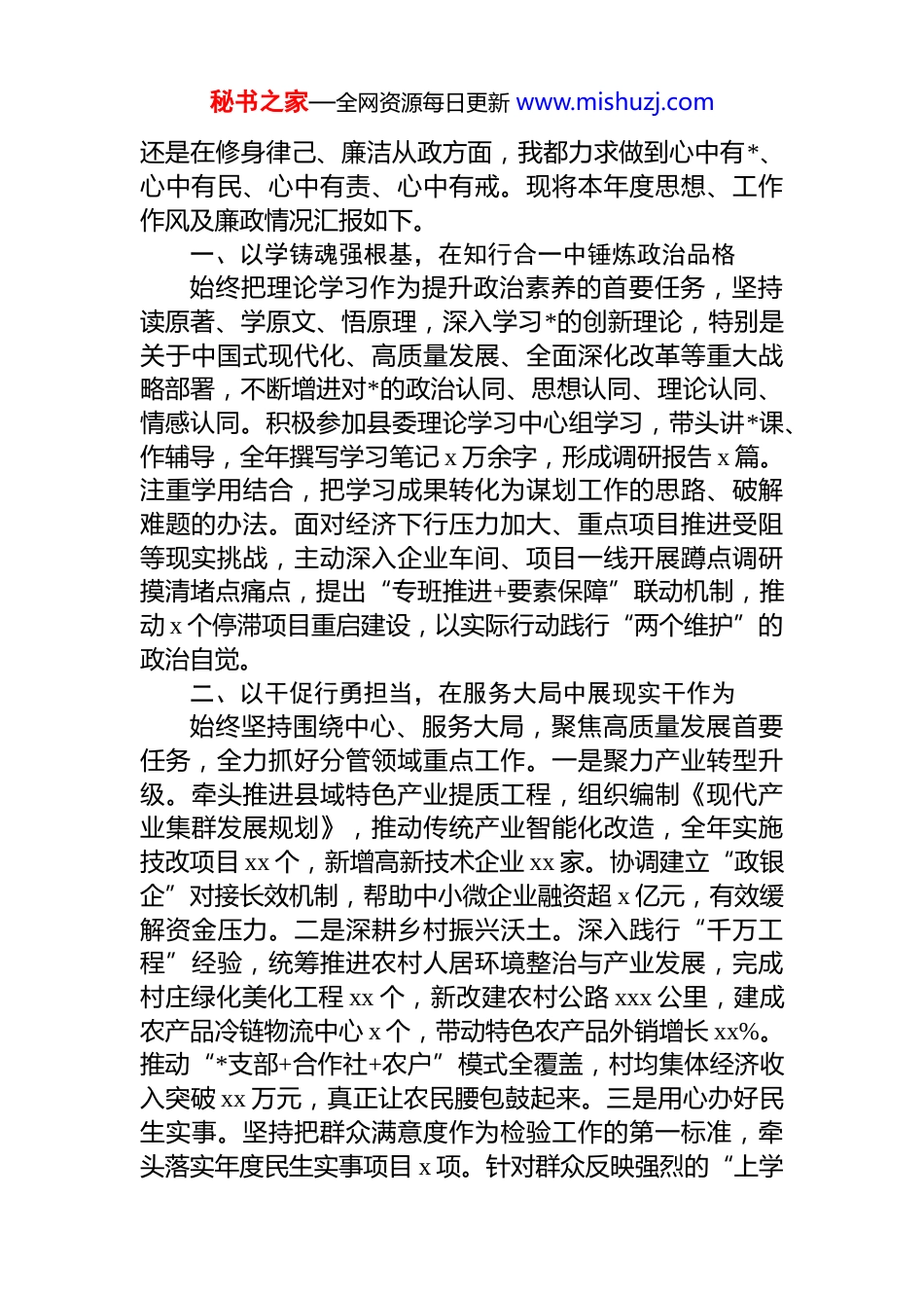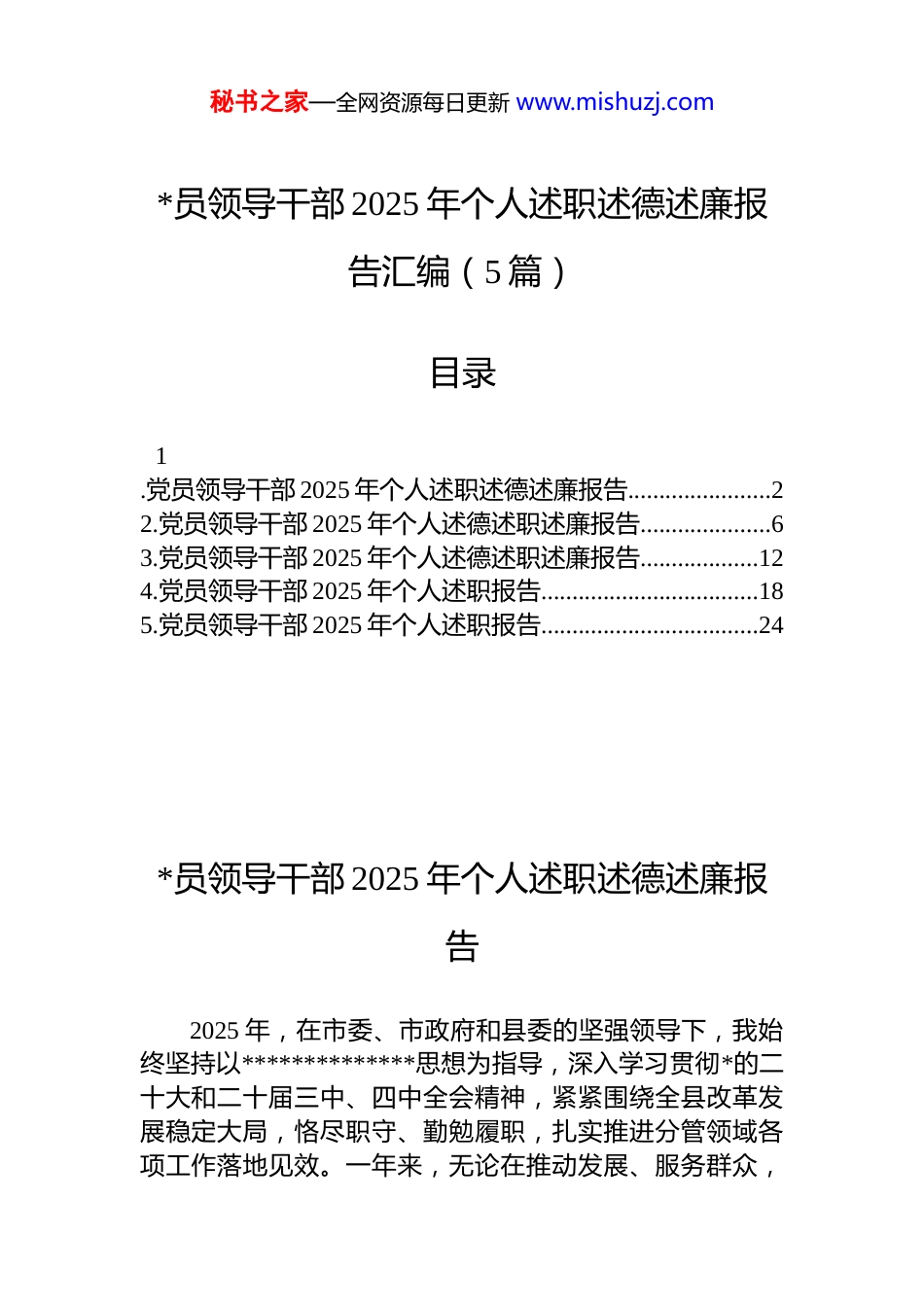 秘书之家—全网资源每日更新 www.mishuzj.com*员领导干部 2025 年个人述职述德述廉报告汇编(5 篇)目录1.党员领导干部 2025 年个人述职述德述廉报告.......................22.党员领导干部 2025 年个人述德述职述廉报告.....................63.党员领导干部 2025 年个人述德述职述廉报告...................124.党员领导干部 2025 年个人述职报告...................................185.党员领导干部 2025 年个人述职报告...................................24*员领导干部 2025 年个人述职述德述廉报告2025 年,在市委、市政府和县委的坚强领导下,我始终坚持以**************思想为指导,深入学习贯彻*的二十大和二十届三中、四中全会精神,紧紧围绕全县改革发展稳定大局,恪尽职守、勤勉履职,扎实推进分管领域各项工作落地见效。一年来,无论在推动发展、服务群众,秘书之家—全网资源每日更新 www.mishuzj.com还是在修身律己、廉洁从政方面,我都力求做到心中有*、心中有民、心中有责、心中有戒。现将本年度思想、工作作风及廉政情况汇报如下。一、以学铸魂强根基,在知行合一中锤炼政治品格始终把理论学习作为提升政治素养的首要任务,坚持读原著、学原文、悟原理,深入学习*的创新理论,特别是关于中国式现代化、高质量发展、全面深化改革等重大战略部署,不断增进对*的政治认同、思想认同、理论认同、情感认同。积极参加县委理论学习中心组学习,带头讲*课、作辅导,全年撰写学习笔记 x 万余字,形成调研报告 x 篇。注重学用结合,把学习成果转化为谋划工作的思路、破解难题的办法。面对经济下行压力加大、重点项目推进受阻等现实挑战,主动深入企业车间、项目一线开展蹲点调研摸清堵点痛点,提出“专班推进+要素保障”联动机制,推动 x 个停滞项目重启建设,以实际行动践行“两个维护”的政治自觉。二、以干促行勇担当,在服务大局中展现实干作为始终坚持围绕中心、服务大局,聚焦高质量发展首要任务,全力抓好分管领域重点工作。一是聚力产业转型升级。牵头推进县域特色产业提质工程,组织编制《现代产业集群发展规划》,推动传统产业智能化改造,全年实施技改项目 xx 个,新增高新技术企业 xx 家。协调建立“政银企”对接长效机制,帮助中小微企业融资超 x 亿元,有效缓解资金压力。二是深耕乡村振兴沃土。深入践行“千万工程”经验,统筹推进农村人居环境整治与产业发展,完成村庄绿化美化工程 xx 个,新改建农村公路 xxx 公里,建成农产品冷链物流中心 x 个,带动特色农产品外销增长 xx%。推动“*支部+合作社+农户”模式全覆盖,村均集体经济收入突破 xx 万元,真正让农民腰包鼓起来。三是用心办好民生实事。坚持把群众满意度作为检验工作的第一标准,牵头落实年度民生实事项目 x 项。针对群众反映强烈的“上学秘书之家—全网资源每日更新 www.mishuzj.com难”“看病远”问题,推动新建乡镇寄宿制学校 x 所、标准化卫生院 x 个,实现县域医共体全覆盖,县域内就诊率达xx%以上。特别是在应对汛期洪涝灾害过程中,连续值守一线 xx 天,组织转移群众 xxxx 余人,确保无一人伤亡,用实际行动守护群众生命财产安全。三、以德润心守底线,在立身修德中涵养清风正气始终牢记“国无德不兴,人无德不立”的古训,把加强道德修养作为人生必修课。一是坚定理想信念。自觉践行社会主义核心价值观,带头弘扬社会公德、职业道德、家庭美德,始终保持健康的生活情趣和高尚的精神追求。在工作中坚持实事求是,不搞“形象工程”、不报“虚假政绩”,坚决抵制形式主义、官僚主义。二是注重家风建设。严格约束亲属和身边工作人员,教育家人遵纪守法、勤俭持家,不插手工程项目、不干预人事安排,筑牢家庭廉洁防线。每逢节假日都召开家庭会议,重温入*誓词、共读红色家书,传承良好家风。三是强化宗旨意识。始终把群众当亲人,定期走访困难户、老*员、退役军人,倾听诉求、解决实际困难。全年累计接待来访群众 xx 人次,协调解决住房、医疗、就业等问题 xx 件,群众满意度持续提升。在一次走访中,得知独居老人 x 奶奶因腿脚...