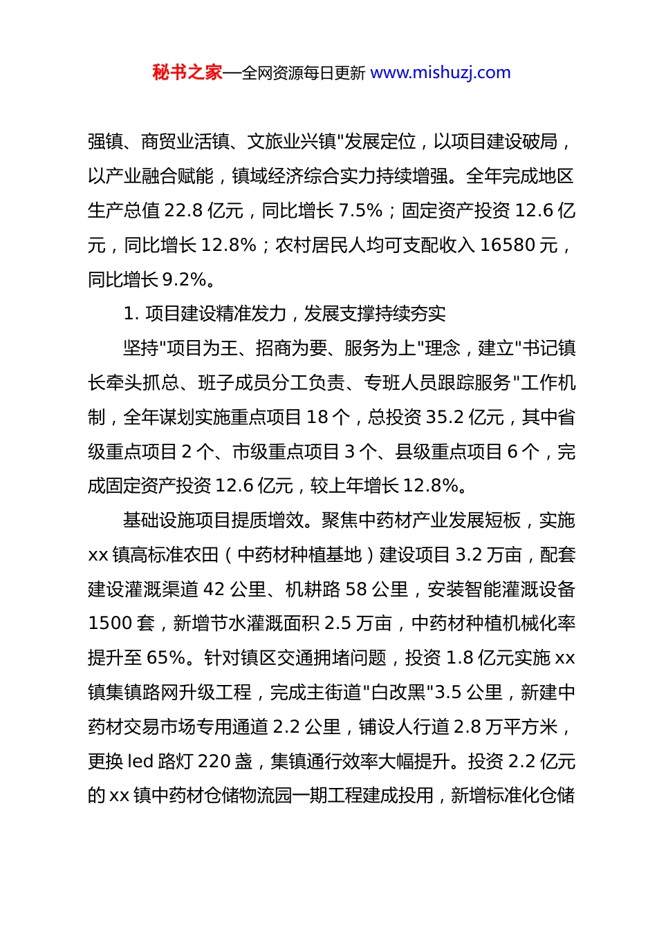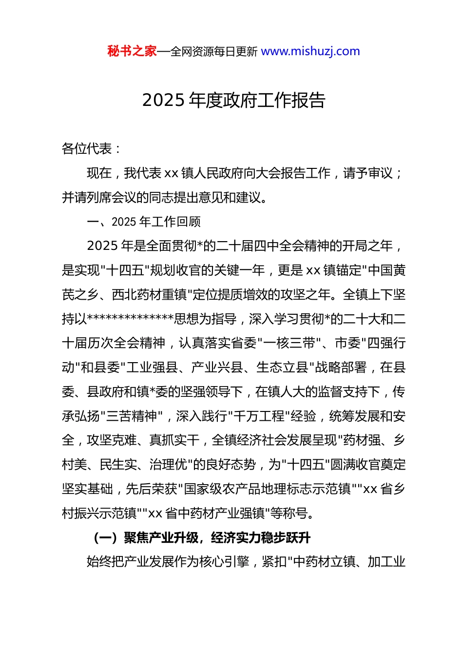 秘书之家—全网资源每日更新 www.mishuzj.com2025 年度政府工作报告各位代表:现在,我代表 xx 镇人民政府向大会报告工作,请予审议;并请列席会议的同志提出意见和建议。一、2025 年工作回顾2025 年是全面贯彻*的二十届四中全会精神的开局之年,是实现"十四五"规划收官的关键一年,更是 xx 镇锚定"中国黄芪之乡、西北药材重镇"定位提质增效的攻坚之年。全镇上下坚持以**************思想为指导,深入学习贯彻*的二十大和二十届历次全会精神,认真落实省委"一核三带"、市委"四强行动"和县委"工业强县、产业兴县、生态立县"战略部署,在县委、县政府和镇*委的坚强领导下,在镇人大的监督支持下,传承弘扬"三苦精神",深入践行"千万工程"经验,统筹发展和安全,攻坚克难、真抓实干,全镇经济社会发展呈现"药材强、乡村美、民生实、治理优"的良好态势,为"十四五"圆满收官奠定坚实基础,先后荣获"国家级农产品地理标志示范镇""xx 省乡村振兴示范镇""xx 省中药材产业强镇"等称号。(一)聚焦产业升级,经济实力稳步跃升始终把产业发展作为核心引擎,紧扣"中药材立镇、加工业秘书之家—全网资源每日更新 www.mishuzj.com强镇、商贸业活镇、文旅业兴镇"发展定位,以项目建设破局,以产业融合赋能,镇域经济综合实力持续增强。全年完成地区生产总值 22.8 亿元,同比增长 7.5%;固定资产投资 12.6 亿元,同比增长 12.8%;农村居民人均可支配收入 16580 元,同比增长 9.2%。1. 项目建设精准发力,发展支撑持续夯实坚持"项目为王、招商为要、服务为上"理念,建立"书记镇长牵头抓总、班子成员分工负责、专班人员跟踪服务"工作机制,全年谋划实施重点项目 18 个,总投资 35.2 亿元,其中省级重点项目 2 个、市级重点项目 3 个、县级重点项目 6 个,完成固定资产投资 12.6 亿元,较上年增长 12.8%。基础设施项目提质增效。聚焦中药材产业发展短板,实施xx 镇高标准农田(中药材种植基地)建设项目 3.2 万亩,配套建设灌溉渠道 42 公里、机耕路 58 公里,安装智能灌溉设备1500 套,新增节水灌溉面积 2.5 万亩,中药材种植机械化率提升至 65%。针对镇区交通拥堵问题,投资 1.8 亿元实施 xx镇集镇路网升级工程,完成主街道"白改黑"3.5 公里,新建中药材交易市场专用通道 2.2 公里,铺设人行道 2.8 万平方米,更换 led 路灯 220 盏,集镇通行效率大幅提升。投资 2.2 亿元的 xx 镇中药材仓储物流园一期工程建成投用,新增标准化仓储秘书之家—全网资源每日更新 www.mishuzj.com库房 8 万平方米,年仓储能力达 12 万吨,解决了中药材晾晒、仓储难题。产业项目落地见效。成功引进投资 5.8 亿元的 xx 本草源中药材深加工项目、投资 3.6 亿元的 xx 县恒泰中药材提取项目等亿元级项目 5 个,千万元级项目 8 个,完成招商引资到位资金18.6 亿元,完成率达 116%。其中 xx 本草源中药材深加工项目当年开工建设并实现试生产,年产黄芪多糖、当归提取物等产品 3000 吨,预计年产值达 6.2 亿元,带动就业 420 余人。积极盘活闲置资产,对原 xx 乡粮站、老供销社等闲置场地进行改造升级,建成中药材初加工车间 12 个,入驻加工企业 18家,年产值新增 2.5 亿元。投资 2.8 亿元的 xx 镇中药材产业融合示范园建成投用,新增标准化厂房 6 万平方米,入驻企业 12家,形成了"种植+初加工+精深加工+仓储物流"的完整产业链条。2. 特色产业提质增效,增收动能持续增强坚决扛牢粮食安全政治责任,严格落实耕地保护制度,完成粮食播种面积 5.8 万亩,总产量达 2.8 万吨,其中小麦种植2.5 万亩、玉米种植 3.3 万亩,粮食产量连续 7 年稳定在 2.5万吨以上。面对春季干旱、夏季冰雹等灾害影响,镇政府及时启动应急预案,协调调运抗旱设备 320 台(套)、救灾物资秘书之家—全网资源每日更新 www.mishuzj.com45 吨,组织农技人员下沉一线指导防灾减灾,最大限度降低了灾害损失。中药材产业集群壮大。依托"中国黄芪之乡"品牌优势,培育壮大黄芪、当归、*参等特色中药材产业,建成标准化中药材种植基地 12...