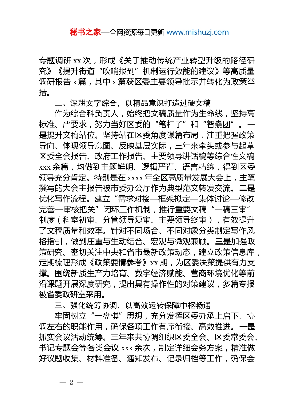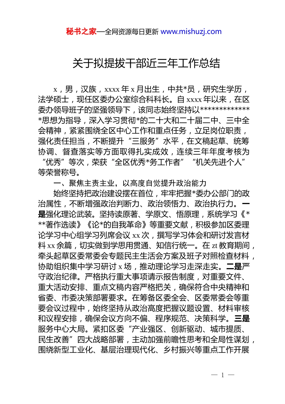 秘书之家—全网资源每日更新 www.mishuzj.com关于拟提拔干部近三年工作总结x,男,汉族,xxxx 年 x 月出生,中共*员,研究生学历,法学硕士,现任区委办公室综合科科长。自 xxxx 年以来,在区委办领导班子的坚强领导下,该同志始终坚持以**************思想为指导,深入学习贯彻*的二十大和二十届二中、三中全会精神,紧紧围绕全区中心工作和重点任务,立足岗位职责,强化责任担当,不断提升“三服务”水平,在文稿起草、统筹协调、督查落实等方面取得扎实成效,连续三年年度考核为“优秀”等次,荣获“全区优秀*务工作者”“机关先进个人”等荣誉称号。一、聚焦主责主业,以高度自觉提升政治能力始终坚持把政治建设摆在首位,牢牢把握*委办公部门的政治属性,不断增强政治判断力、政治领悟力、政治执行力。一是强化理论武装。坚持读原著、学原文、悟原理,系统学习《***著作选读》《论*的自我革命》等重要文献,积极参加区委理论学习中心组学习列席会议 xx 次,撰写学习体会和研讨发言材料 xx 余篇,切实做到学思用贯通、知信行统一。在 zt 教育期间,牵头起草区委常委会专题民主生活会方案及班子对照检查材料,协助组织集中学习研讨 x 场,推动理论学习走深走实。二是严守政治纪律。严格执行重大事项请示报告制度,对重要文件、重大活动安排、重点文稿内容严格把关,确保符合中央精神和省委、市委决策部署要求。在筹备区委全会、区委常委会等重要会议过程中,始终坚持从政治高度把握议题设置、材料审核和议程安排,确保会议方向不偏、程序规范、决策科学。三是服务中心大局。紧扣区委“产业强区、创新驱动、城市提质、民生改善”四大战略部署,主动加强前瞻性思考和全局性谋划,围绕新型工业化、基层治理现代化、乡村振兴等重点工作开展— 1 —秘书之家—全网资源每日更新 www.mishuzj.com专题调研 xx 次,形成《关于推动传统产业转型升级的路径研究》《提升街道“吹哨报到”机制运行效能的建议》等高质量调研报告 x 篇,其中 x 篇获区委主要领导批示并转化为政策举措。二、深耕文字综合,以精品意识打造过硬文稿作为综合科负责人,始终把文稿质量作为生命线,坚持高标准、严要求,努力当好区委的“笔杆子”和“智囊团”。一是提升文稿站位。坚持站在区委角度谋篇布局,注重把握政策导向、体现领导意图、反映基层实际,三年来牵头或参与起草区委全会报告、政府工作报告、主要领导讲话稿等综合性文稿xxx 余篇,均做到主题鲜明、逻辑严谨、语言精练,得到区委领导充分肯定。特别是在 xxxx 年全区高质量发展大会上,主笔撰写的大会主报告被市委办公厅作为典型范文转发交流。二是优化写作流程。建立“需求对接—框架拟定—集体讨论—修改完善—审核把关”闭环工作机制,推行重要文稿“一稿三审”制度(科室初审、分管领导复审、主要领导终审),有效提升了文稿质量和效率。针对不同场合、不同对象分类制定写作风格指引,做到庄重与生动结合、宏观与微观兼顾。三是加强政策研究。密切关注中央和省市最新政策动态,建立政策信息库,定期梳理形成《政策要情参考》xx 期,为区委决策提供有力支撑。围绕新质生产力培育、数字经济赋能、营商环境优化等前沿课题开展深度研究,提出具有操作性的对策建议,多篇专报被省委政研室采用。三、强化统筹协调,以高效运转保障中枢畅通牢固树立“一盘棋”思想,充分发挥区委办承上启下、协调左右的职能作用,确保各项工作有序衔接、高效推进。一是抓实会议活动统筹。三年来共协调组织区委全会、区委常委会、书记专题会等各类会议 xxx 余次,制定详细会务方案,精准做好议题收集、材料准备、通知发布、记录归档等工作,确保会— 2 —秘书之家—全网资源每日更新 www.mishuzj.com议组织零差错、服务保障无疏漏。牵头完成 xxxx 年市委主要领导调研我区接待任务,精心设计考察路线、周密安排座谈内容,将相关经验做法在全市*委办公室系统交流推广。二是加强部门联动协作。健全区委与人大、政府、政协及区直单位常态化沟通机制,牵头召开工作协调会 xx 次,推动解决跨部门事项 xx项。在文明城市创建、安全生产整治、...
