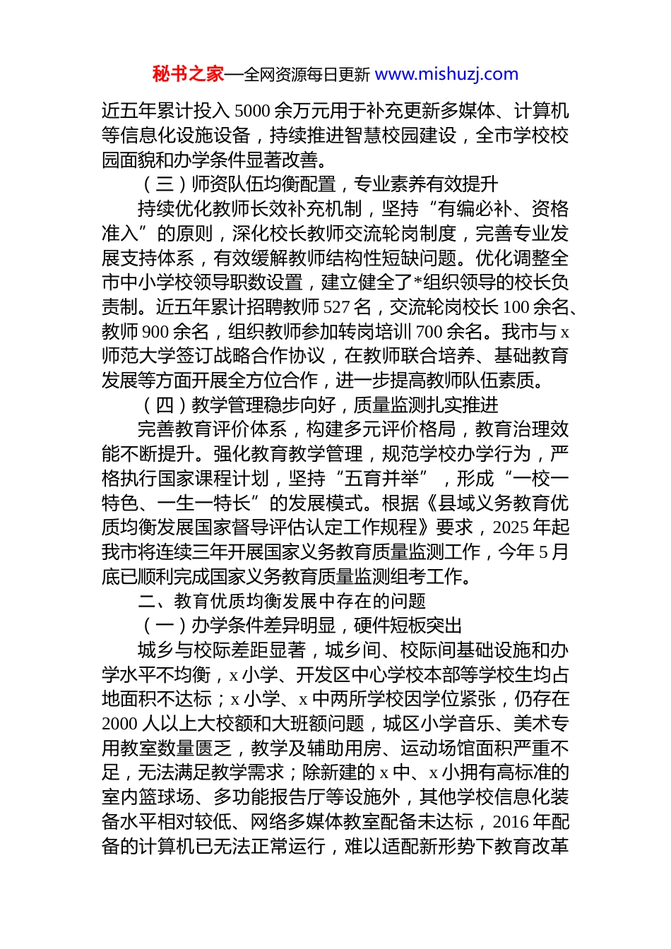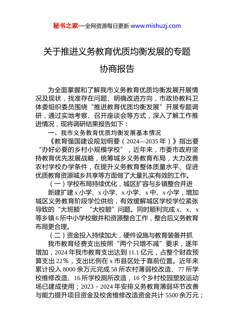 秘书之家—全网资源每日更新 www.mishuzj.com关于推进义务教育优质均衡发展的专题协商报告为全面掌握和了解我市义务教育优质均衡发展开展情况及现状,找准存在问题、明确改进方向,市政协教科卫体委组织委员围绕“推进教育优质均衡发展”开展专题调研,通过实地考察、召开座谈会等方式,深入了解工作推进情况,现将调研结果报告如下:一、我市义务教育优质均衡发展基本情况《教育强国建设规划纲要(2024—2035 年)》指出要“办好必要的乡村小规模学校”,近年来,市委市政府坚持教育优先发展战略,统筹城乡义务教育布局,大力改善农村学校办学条件,在提升义务教育整体质量水平、促进优质教育资源城乡共享等方面做了大量扎实有效的工作。(一)学校布局持续优化,城区扩容与乡镇整合并进新建扩建 x 小学、x 小学、x 小学、x 中、x 小学,增加城区义务教育阶段学位供给,有效缓解城区学校学位紧张导致的“大班额”“大校额”问题。同时顺利完成 x、x、x等乡镇 6 所中小学校撤并和资源整合工作,整合后义务教育布局更合理。(二)资金投入持续加大,硬件设施与教育装备并抓我市教育经费支出按照“两个只增不减”要求,逐年增加,2024 年我市教育支出达到 11.1 亿元,占整个财政预算支出 22%,支出比例在 x 市县区处于靠前位置。近年来累计投入 8000 余万元完成 58 所农村薄弱校改造、77 所学校维修改造、16 所学校厕所改造,16 个乡村校园塑胶运动场已建成使用;2023-2024 年安排义务教育薄弱环节改善与能力提升项目资金及校舍维修改造资金共计 5500 余万元;秘书之家—全网资源每日更新 www.mishuzj.com近五年累计投入 5000 余万元用于补充更新多媒体、计算机等信息化设施设备,持续推进智慧校园建设,全市学校校园面貌和办学条件显著改善。(三)师资队伍均衡配置,专业素养有效提升持续优化教师长效补充机制,坚持“有编必补、资格准入”的原则,深化校长教师交流轮岗制度,完善专业发展支持体系,有效缓解教师结构性短缺问题。优化调整全市中小学校领导职数设置,建立健全了*组织领导的校长负责制。近五年累计招聘教师 527 名,交流轮岗校长 100 余名、教师 900 余名,组织教师参加转岗培训 700 余名。我市与 x师范大学签订战略合作协议,在教师联合培养、基础教育发展等方面开展全方位合作,进一步提高教师队伍素质。(四)教学管理稳步向好,质量监测扎实推进完善教育评价体系,构建多元评价格局,教育治理效能不断提升。强化教育教学管理,规范学校办学行为,严格执行国家课程计划,坚持“五育并举”,形成“一校一特色、一生一特长”的发展模式。根据《县域义务教育优质均衡发展国家督导评估认定工作规程》要求,2025 年起我市将连续三年开展国家义务教育质量监测工作,今年 5 月底已顺利完成国家义务教育质量监测组考工作。二、教育优质均衡发展中存在的问题(一)办学条件差异明显,硬件短板突出城乡与校际差距显著,城乡间、校际间基础设施和办学水平不均衡,x 小学、开发区中心学校本部等学校生均占地面积不达标;x 小学、x 中两所学校因学位紧张,仍存在2000 人以上大校额和大班额问题,城区小学音乐、美术专用教室数量匮乏,教学及辅助用房、运动场馆面积严重不足,无法满足教学需求;除新建的 x 中、x 小拥有高标准的室内篮球场、多功能报告厅等设施外,其他学校信息化装备水平相对较低、网络多媒体教室配备未达标,2016 年配备的计算机已无法正常运行,难以适配新形势下教育改革秘书之家—全网资源每日更新 www.mishuzj.com发展要求。(二)教师队伍建设滞后,资源配置不优学科结构失衡,音乐、体育、美术、心理健康、地理、生物、信息技术等专任教师数量不足,部分义务教育学校体艺专业教师未达“每百名学生 0.9 人以上”标准,影响素质教育全面推进;交流与培养不足,骨干教师交流轮岗覆盖面较窄,优质师资难以有效辐射薄弱学校,农村学校教师信息化教学能力薄弱,缺乏系统培训,难以推动信息技术与教育教学深度融合;虽有教师补充计划,但针对紧缺学科的定向补充力度不足,全科教师优势未充分发挥,教师...