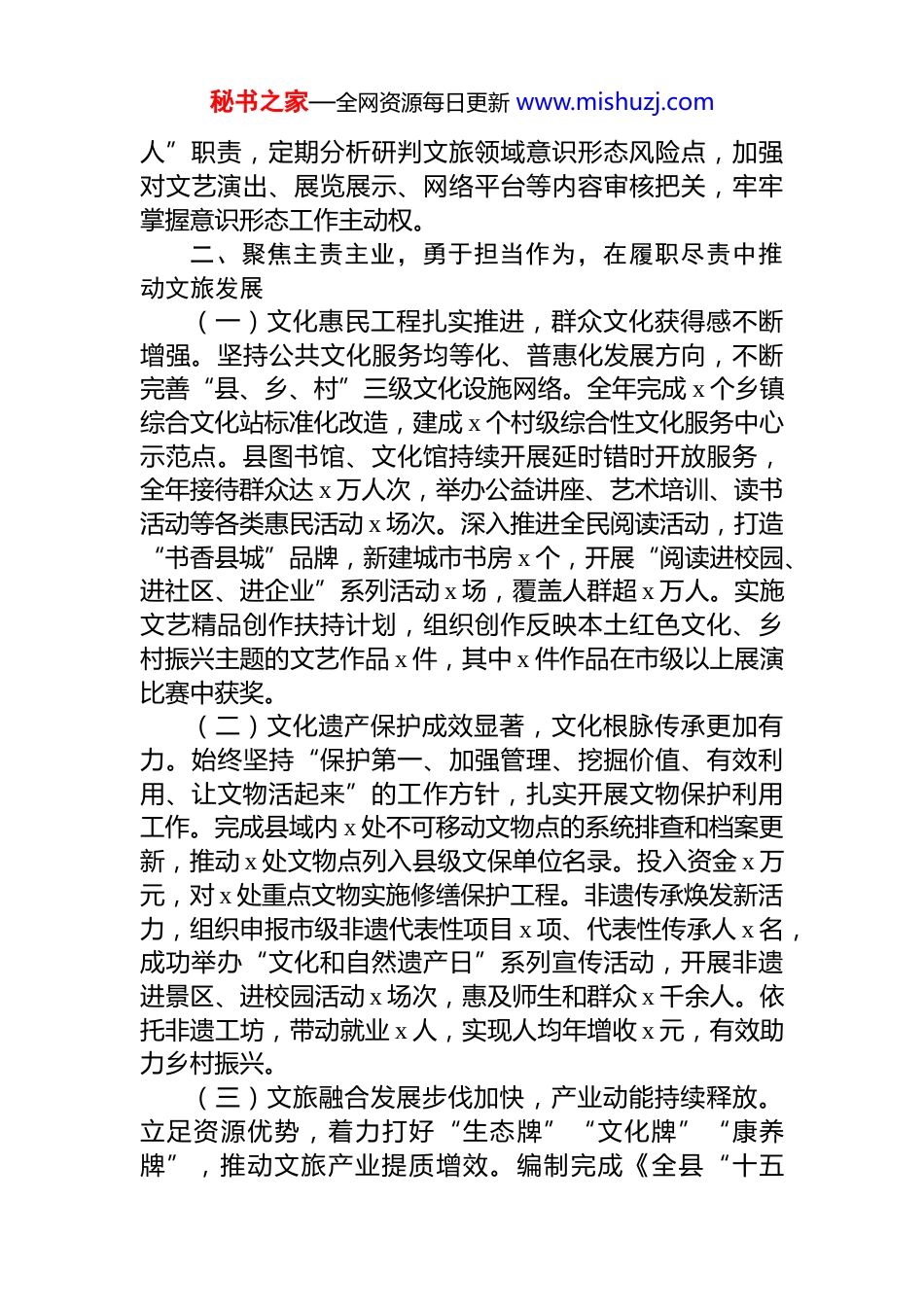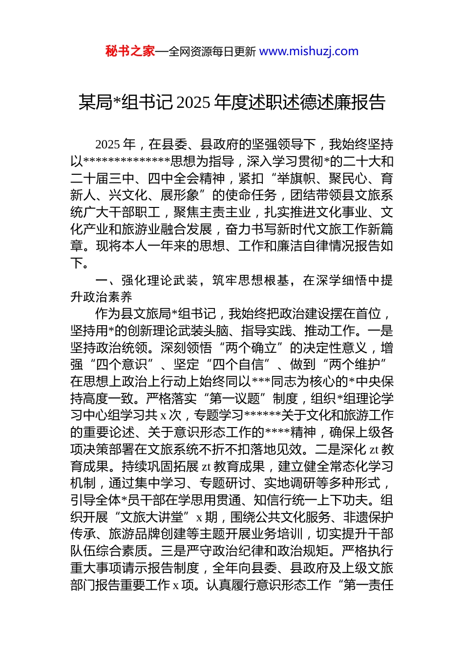 秘书之家—全网资源每日更新 www.mishuzj.com某局*组书记 2025 年度述职述德述廉报告2025 年,在县委、县政府的坚强领导下,我始终坚持以**************思想为指导,深入学习贯彻*的二十大和二十届三中、四中全会精神,紧扣“举旗帜、聚民心、育新人、兴文化、展形象”的使命任务,团结带领县文旅系统广大干部职工,聚焦主责主业,扎实推进文化事业、文化产业和旅游业融合发展,奋力书写新时代文旅工作新篇章。现将本人一年来的思想、工作和廉洁自律情况报告如下。一、强化理论武装,筑牢思想根基,在深学细悟中提升政治素养作为县文旅局*组书记,我始终把政治建设摆在首位,坚持用*的创新理论武装头脑、指导实践、推动工作。一是坚持政治统领。深刻领悟“两个确立”的决定性意义,增强“四个意识”、坚定“四个自信”、做到“两个维护”在思想上政治上行动上始终同以***同志为核心的*中央保持高度一致。严格落实“第一议题”制度,组织*组理论学习中心组学习共 x 次,专题学习******关于文化和旅游工作的重要论述、关于意识形态工作的****精神,确保上级各项决策部署在文旅系统不折不扣落地见效。二是深化 zt 教育成果。持续巩固拓展 zt 教育成果,建立健全常态化学习机制,通过集中学习、专题研讨、实地调研等多种形式,引导全体*员干部在学思用贯通、知信行统一上下功夫。组织开展“文旅大讲堂”x 期,围绕公共文化服务、非遗保护传承、旅游品牌创建等主题开展业务培训,切实提升干部队伍综合素质。三是严守政治纪律和政治规矩。严格执行重大事项请示报告制度,全年向县委、县政府及上级文旅部门报告重要工作 x 项。认真履行意识形态工作“第一责任秘书之家—全网资源每日更新 www.mishuzj.com人”职责,定期分析研判文旅领域意识形态风险点,加强对文艺演出、展览展示、网络平台等内容审核把关,牢牢掌握意识形态工作主动权。二、聚焦主责主业,勇于担当作为,在履职尽责中推动文旅发展(一)文化惠民工程扎实推进,群众文化获得感不断增强。坚持公共文化服务均等化、普惠化发展方向,不断完善“县、乡、村”三级文化设施网络。全年完成 x 个乡镇综合文化站标准化改造,建成 x 个村级综合性文化服务中心示范点。县图书馆、文化馆持续开展延时错时开放服务,全年接待群众达 x 万人次,举办公益讲座、艺术培训、读书活动等各类惠民活动 x 场次。深入推进全民阅读活动,打造“书香县城”品牌,新建城市书房 x 个,开展“阅读进校园、进社区、进企业”系列活动 x 场,覆盖人群超 x 万人。实施文艺精品创作扶持计划,组织创作反映本土红色文化、乡村振兴主题的文艺作品 x 件,其中 x 件作品在市级以上展演比赛中获奖。(二)文化遗产保护成效显著,文化根脉传承更加有力。始终坚持“保护第一、加强管理、挖掘价值、有效利用、让文物活起来”的工作方针,扎实开展文物保护利用工作。完成县域内 x 处不可移动文物点的系统排查和档案更新,推动 x 处文物点列入县级文保单位名录。投入资金 x 万元,对 x 处重点文物实施修缮保护工程。非遗传承焕发新活力,组织申报市级非遗代表性项目 x 项、代表性传承人 x 名,成功举办“文化和自然遗产日”系列宣传活动,开展非遗进景区、进校园活动 x 场次,惠及师生和群众 x 千余人。依托非遗工坊,带动就业 x 人,实现人均年增收 x 元,有效助力乡村振兴。(三)文旅融合发展步伐加快,产业动能持续释放。立足资源优势,着力打好“生态牌”“文化牌”“康养牌”,推动文旅产业提质增效。编制完成《全县“十五秘书之家—全网资源每日更新 www.mishuzj.com五”文旅发展规划》初稿,明确发展方向和重点任务。全年接待游客 x 万人次,实现旅游综合收入 x 亿元,同比分别增长 x%和 x%。持续打造“全域旅游”品牌,成功创建 x个省级乡村旅游重点村,新增 x 家星级农家乐、x 家精品民宿。举办“春赏花、夏避暑、秋采摘、冬民俗”四季文旅活动 x 项,其中“xx 民俗文化节”吸引游客超 x 万人次,带动周边消费 x 万元。加强文旅宣传推广,与主流媒体及新媒体平台合作开展专题宣传 x...