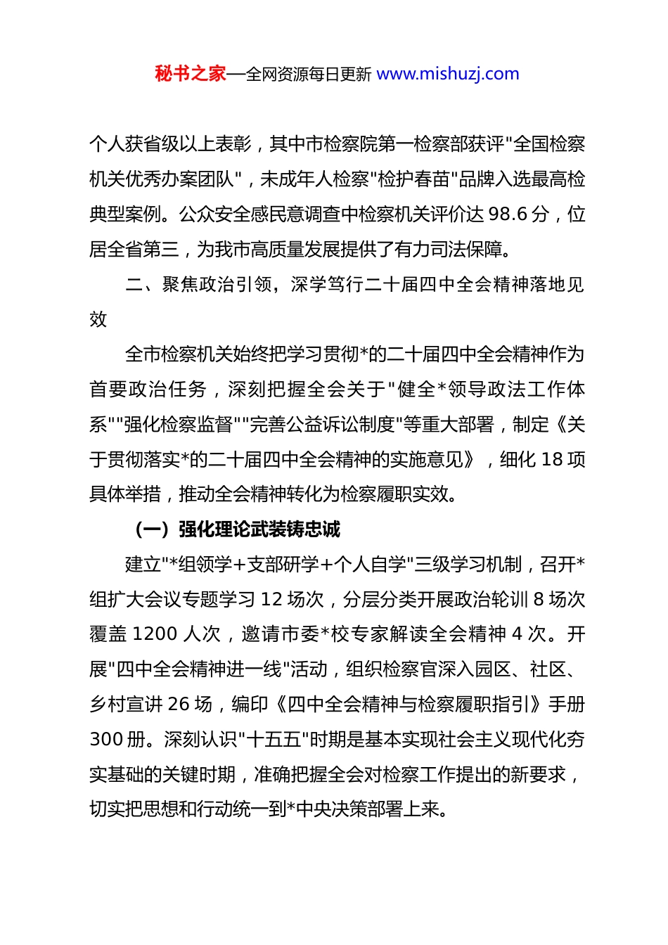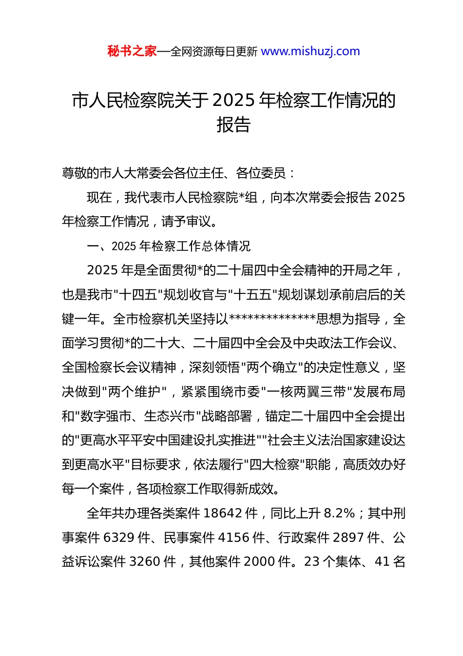 秘书之家—全网资源每日更新 www.mishuzj.com市人民检察院关于 2025 年检察工作情况的报告尊敬的市人大常委会各位主任、各位委员:现在,我代表市人民检察院*组,向本次常委会报告 2025年检察工作情况,请予审议。一、2025 年检察工作总体情况2025 年是全面贯彻*的二十届四中全会精神的开局之年,也是我市"十四五"规划收官与"十五五"规划谋划承前启后的关键一年。全市检察机关坚持以**************思想为指导,全面学习贯彻*的二十大、二十届四中全会及中央政法工作会议、全国检察长会议精神,深刻领悟"两个确立"的决定性意义,坚决做到"两个维护",紧紧围绕市委"一核两翼三带"发展布局和"数字强市、生态兴市"战略部署,锚定二十届四中全会提出的"更高水平平安中国建设扎实推进""社会主义法治国家建设达到更高水平"目标要求,依法履行"四大检察"职能,高质效办好每一个案件,各项检察工作取得新成效。全年共办理各类案件 18642 件,同比上升 8.2%;其中刑事案件 6329 件、民事案件 4156 件、行政案件 2897 件、公益诉讼案件 3260 件,其他案件 2000 件。23 个集体、41 名秘书之家—全网资源每日更新 www.mishuzj.com个人获省级以上表彰,其中市检察院第一检察部获评"全国检察机关优秀办案团队",未成年人检察"检护春苗"品牌入选最高检典型案例。公众安全感民意调查中检察机关评价达 98.6 分,位居全省第三,为我市高质量发展提供了有力司法保障。二、聚焦政治引领,深学笃行二十届四中全会精神落地见效全市检察机关始终把学习贯彻*的二十届四中全会精神作为首要政治任务,深刻把握全会关于"健全*领导政法工作体系""强化检察监督""完善公益诉讼制度"等重大部署,制定《关于贯彻落实*的二十届四中全会精神的实施意见》,细化 18 项具体举措,推动全会精神转化为检察履职实效。(一)强化理论武装铸忠诚建立"*组领学+支部研学+个人自学"三级学习机制,召开*组扩大会议专题学习 12 场次,分层分类开展政治轮训 8 场次覆盖 1200 人次,邀请市委*校专家解读全会精神 4 次。开展"四中全会精神进一线"活动,组织检察官深入园区、社区、乡村宣讲 26 场,编印《四中全会精神与检察履职指引》手册300 册。深刻认识"十五五"时期是基本实现社会主义现代化夯实基础的关键时期,准确把握全会对检察工作提出的新要求,切实把思想和行动统一到*中央决策部署上来。秘书之家—全网资源每日更新 www.mishuzj.com(二)坚持*的领导把方向严格执行重大事项请示报告制度,全年向市委、省检察院请示报告重大工作 32 件次,其中关于数字检察建设、公益诉讼重点领域拓展等 6 项工作获市委主要领导批示肯定。深化"红韵检察"dj 品牌建设,打造"一支部一特色"dj 项目 17 个,其中第三检察部"dj+知识产权保护"项目获评全省检察机关 dj 与业务融合优秀案例。建立 dj 与业务同部署、同考核机制,将贯彻全会精神情况纳入绩效考核核心指标,确保检察工作方向正确。(三)服务大局显担当主动将检察工作融入本市"十五五"发展规划谋划,围绕科技创新、先进制造业升级、生态环境保护等重点领域,制定《某某市检察机关服务保障高质量发展十项举措》。聚焦本市"数字政法"建设部署,启动新一轮数字检察三年规划,建成市级检察数据中心,接入政务数据、司法数据等 8 大类 23 项数据资源,研发的"医保基金监管""生态环境损害预警""涉企虚假诉讼识别"3 个大数据监督模型在省检察院平台上架,其中"医保基金监管模型"被最高检作为典型案例推广,累计发现违规线索 127 条,追缴医保资金 2100 余万元。三、聚焦主责主业,以高质效检察履职服务发展大局秘书之家—全网资源每日更新 www.mishuzj.com(一)坚决维护安全稳定,护航更高水平平安某某1. 严惩严重刑事犯罪。全面贯彻总体国家安全观,依法从严惩治故意杀人、抢劫等严重暴力犯罪,起诉 189 人;常态化开展扫黑除恶,做到"不漏不凑",一体推进"破网打伞",办理了社会高度关注的李某某等人涉黑案,起诉 12 人,查封扣押冻结涉案资产 1.2 亿元。深入推进打击涉缅北电诈专项行动,全链条惩治电信网络诈骗及其...