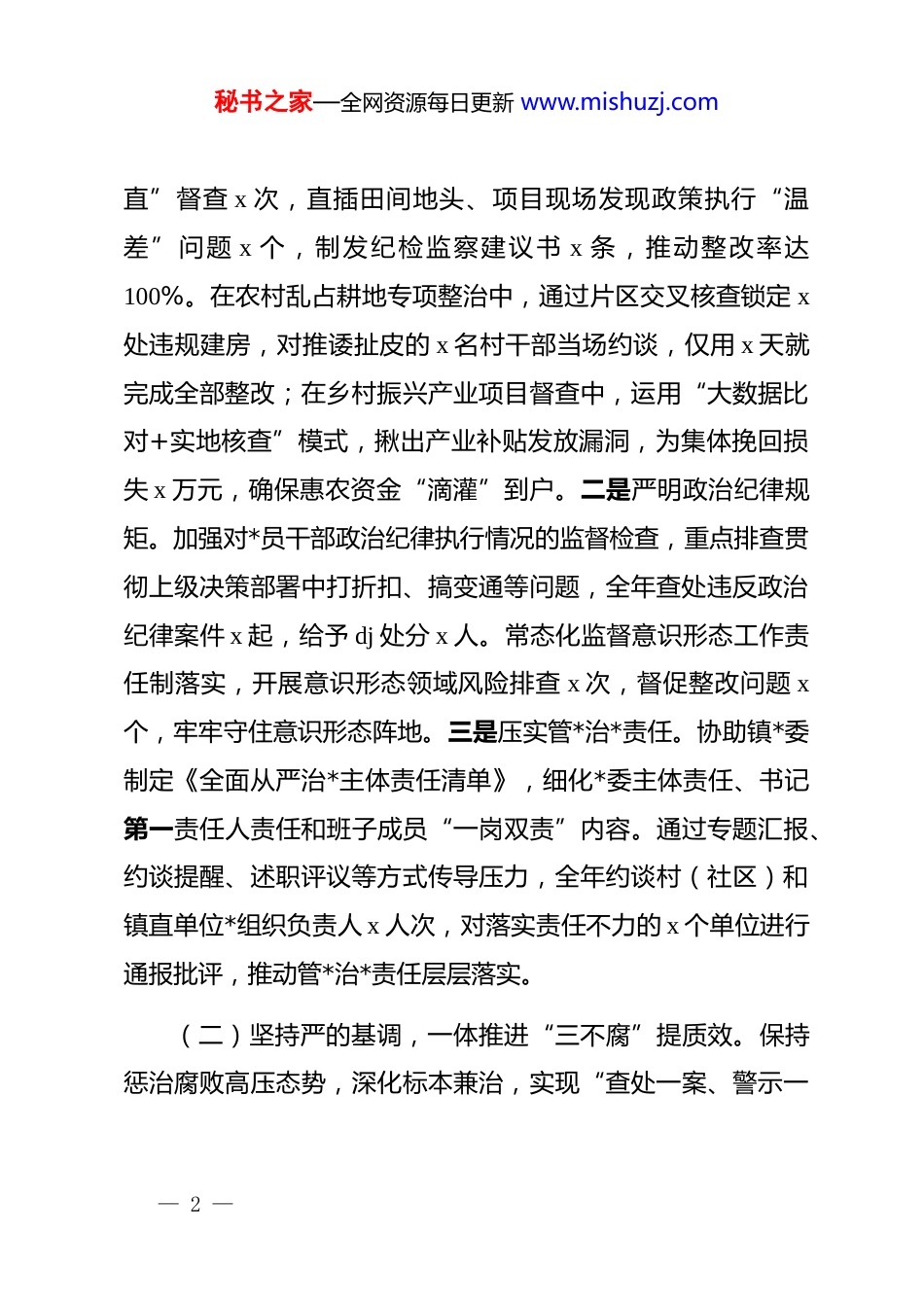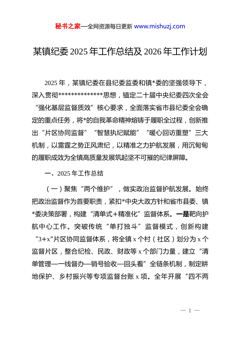 秘书之家—全网资源每日更新 www.mishuzj.com某镇纪委 2025 年工作总结及 2026 年工作计划2025 年,某镇纪委在县纪委监委和镇*委的坚强领导下,深入贯彻**************思想,锚定二十届中央纪委四次全会“强化基层监督质效”核心要求,全面落实省市县纪委全会确定的重点任务,将*的自我革命精神熔铸于履职全过程,创新推出“片区协同监督”“智慧执纪赋能”“暖心回访重塑”三大机制,以雷霆之势正风肃纪,以精准之力护航发展,用沉甸甸的履职成效为全镇高质量发展筑起坚不可摧的纪律屏障。一、2025 年工作总结(一)聚焦“两个维护”,做实政治监督护航发展。始终把政治监督作为首要职责,紧扣*中央大政方针和省市县委、镇*委决策部署,构建“清单式+精准化”监督体系。一是靶向护航中心工作。突破传统“单打独斗”监督模式,创新构建“3+x”片区协同监督体系,将全镇 x 个村(社区)划分为 x 个监督片区,整合纪检、民政、财政等 x 个部门力量,建立“清单管理—一线督办—销号验收—回头看”全链条机制,制定耕地保护、乡村振兴等专项监督台账 x 项。全年开展“四不两— 1 —秘书之家—全网资源每日更新 www.mishuzj.com直”督查 x 次,直插田间地头、项目现场发现政策执行“温差”问题 x 个,制发纪检监察建议书 x 条,推动整改率达100%。在农村乱占耕地专项整治中,通过片区交叉核查锁定 x处违规建房,对推诿扯皮的 x 名村干部当场约谈,仅用 x 天就完成全部整改;在乡村振兴产业项目督查中,运用“大数据比对+实地核查”模式,揪出产业补贴发放漏洞,为集体挽回损失 x 万元,确保惠农资金“滴灌”到户。二是严明政治纪律规矩。加强对*员干部政治纪律执行情况的监督检查,重点排查贯彻上级决策部署中打折扣、搞变通等问题,全年查处违反政治纪律案件 x 起,给予 dj 处分 x 人。常态化监督意识形态工作责任制落实,开展意识形态领域风险排查 x 次,督促整改问题 x个,牢牢守住意识形态阵地。三是压实管*治*责任。协助镇*委制定《全面从严治*主体责任清单》,细化*委主体责任、书记第一责任人责任和班子成员“一岗双责”内容。通过专题汇报、约谈提醒、述职评议等方式传导压力,全年约谈村(社区)和镇直单位*组织负责人 x 人次,对落实责任不力的 x 个单位进行通报批评,推动管*治*责任层层落实。(二)坚持严的基调,一体推进“三不腐”提质效。保持惩治腐败高压态势,深化标本兼治,实现“查处一案、警示一— 2 —秘书之家—全网资源每日更新 www.mishuzj.com片、治理一域”的综合效果。一是强化惩治形成震慑。秉持“办案是最有力监督”理念,构建“以案挖案+巡察反馈+平台筛查+群众举报”四维线索体系,全年归集问题线索 x 件,其中通过智慧监督平台筛查发现 x 件,较去年增长 x%。创新推行“片区集中办案+县纪委协审”模式,破解基层办案力量薄弱难题,对集体“三资”、工程建设等领域开展“靶向执纪”,立案审查 x 件,给予 dj 处分 x 人,收缴违纪资金 x 万元。查办的 xx 村原支书 xx 侵占集体林地补偿款案中,通过跨片区调阅凭证、异地取证,仅用 x 天就固定完整证据链,该案被县纪委列为“基层快查快办典型案例”。全年通报曝光 x 起群众身边“微腐败”案例,在全镇干部大会上现场剖析,形成“查处一人、震慑一片”的强烈效应。二是深化以案促改促治。跳出“查处就完事”的惯性思维,创新“一案三书两公开”机制,对每起典型案件制发《案情剖析书》《风险预警书》《整改建议书》,公开整改方案和结果,接受群众监督。针对 xx 社区低保优亲厚友案暴露的漏洞,推动民政部门重构“申请—核查—公示—审批”全流程监管,新增“大数据比对低保与房产、车辆信息”环节,堵塞监管漏洞。打造“庭审课堂+流动警示展”教育矩阵,组织 x 名镇村干部旁听职务犯罪庭审,制作“身边案警示录”展板在各村巡展 x 场次,推动 x 个案发单位— 3 —秘书之家—全网资源每日更新 www.mishuzj.com开展专题整改,完善制度 x 项,实现“查处一案、治理一域”的治本效果。三是厚植廉洁文化根基。紧扣新时代廉...