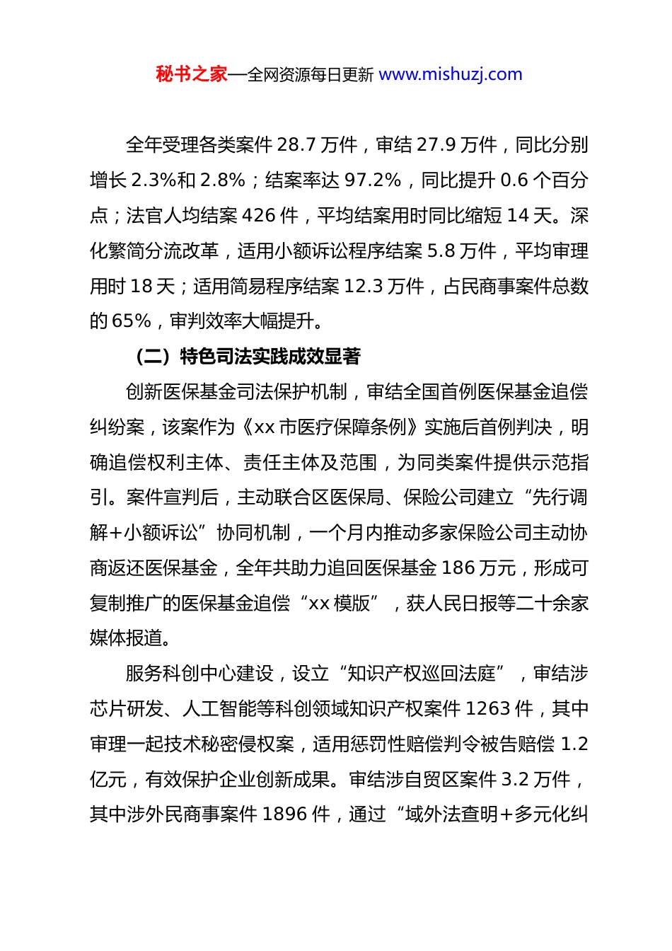 秘书之家—全网资源每日更新 www.mishuzj.comxx 市 xx 区人民法院 2025 年度工作总结2025 年,xx 市 xx 区人民法院在 xx 市高级人民法院和xx 区区委的坚强领导下,深入学习贯彻*的二十大及二十届三中、四中全会精神,紧扣 xx 高水平改革开放和社会主义现代化建设引领区定位,以“司法为民、公正司法”为主线,扎实推进审判执行各项工作,为区域经济社会发展提供有力司法保障。现将全年工作情况总结如下:一、强化政治引领,筑牢思想根基坚持把学习贯彻*的二十大及二十届三中、四中全会精神作为首要政治任务,制定“分阶段、全覆盖”学习计划,通过*组理论学习中心组学习 12 次、专题读书班 4 期、支部学习 68次,推动干警深刻领会全会关于“基层司法能力现代化”“矛盾纠纷源头化解”的部署要求。开展“引领区司法担当”主题实践活动,组织干警深入自贸区、科创园区开展调研 26 次,形成《司法服务科创企业发展白皮书》,将学习成果转化为服务区域发展的具体举措。建立“政治督查+绩效考评”机制,确保*中央决策部署在基层法院落地见效。二、聚焦审判执行,提升司法质效(一)审判工作核心指标稳中有进秘书之家—全网资源每日更新 www.mishuzj.com全年受理各类案件 28.7 万件,审结 27.9 万件,同比分别增长 2.3%和 2.8%;结案率达 97.2%,同比提升 0.6 个百分点;法官人均结案 426 件,平均结案用时同比缩短 14 天。深化繁简分流改革,适用小额诉讼程序结案 5.8 万件,平均审理用时 18 天;适用简易程序结案 12.3 万件,占民商事案件总数的 65%,审判效率大幅提升。(二)特色司法实践成效显著创新医保基金司法保护机制,审结全国首例医保基金追偿纠纷案,该案作为《xx 市医疗保障条例》实施后首例判决,明确追偿权利主体、责任主体及范围,为同类案件提供示范指引。案件宣判后,主动联合区医保局、保险公司建立“先行调解+小额诉讼”协同机制,一个月内推动多家保险公司主动协商返还医保基金,全年共助力追回医保基金 186 万元,形成可复制推广的医保基金追偿“xx 模版”,获人民日报等二十余家媒体报道。服务科创中心建设,设立“知识产权巡回法庭”,审结涉芯片研发、人工智能等科创领域知识产权案件 1263 件,其中审理一起技术秘密侵权案,适用惩罚性赔偿判令被告赔偿 1.2亿元,有效保护企业创新成果。审结涉自贸区案件 3.2 万件,其中涉外民商事案件 1896 件,通过“域外法查明+多元化纠秘书之家—全网资源每日更新 www.mishuzj.com纷解决”机制,高效化解跨境纠纷,提升涉外司法公信力。严惩各类刑事犯罪,审结严重暴力犯罪案件 326 件,涉黑恶案件 18 件 103 人,电信网络诈骗案件 489 件 967 人;审结医保骗保、食品安全等民生领域犯罪案件 127 件,其中审理一起超市销售有毒有害食品案,判处被告人有期徒刑七年并处罚金 50 万元,切实维护群众切身利益。(三)执行工作攻坚成效突出全年受理执行案件 8.9 万件,执结 8.5 万件,执行完毕率40.8%,执行到位率 52.6%,均位居全市基层法院前列。创新“执行+医保”联动机制,依托医保基金追偿案例经验,推动建立被执行人医保信息查询通道,成功执结“老赖”案件 126件。网络司法拍卖成交 46.8 亿元,成交率 64.2%,同比上升2.1 个百分点。深化信用修复机制,为 86 家小微企业办理信用修复,助力企业恢复经营。三、深化改革创新,激发基层活力推进基层司法服务模式创新,在 12 个街道(镇)设立“法官工作室”,吸纳社区调解员、法律顾问等 120 人参与纠纷化解,全年诉前调解成功案件 3.2 万件,调解成功率达68%。深化智慧法院建设,升级“xx 法院诉讼服务平台”,实现立案、缴费、阅卷等 18 项业务全流程线上办理,线上立案秘书之家—全网资源每日更新 www.mishuzj.com率达 82%,电子送达成功率提升至 93%。建立“类案智审”系统,针对劳动争议、房屋租赁等高频案件,自动生成裁判文书准确率达 88%,办案效率提升 35%。四、坚持司法为民,增强群众福祉优化诉讼服务中心“一站式”建设,设立“老年人绿色通道”“涉外服务窗口...