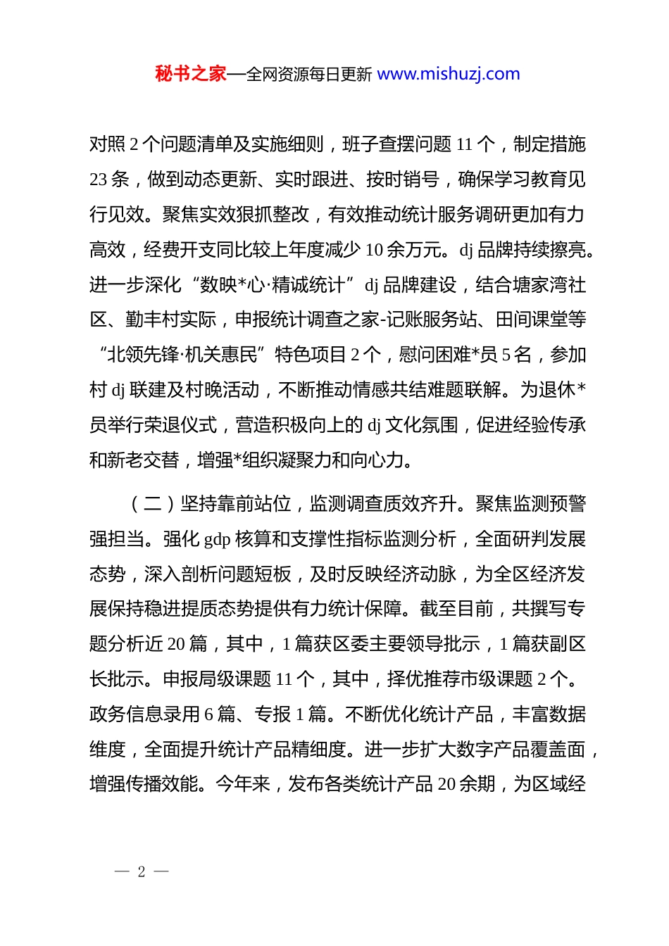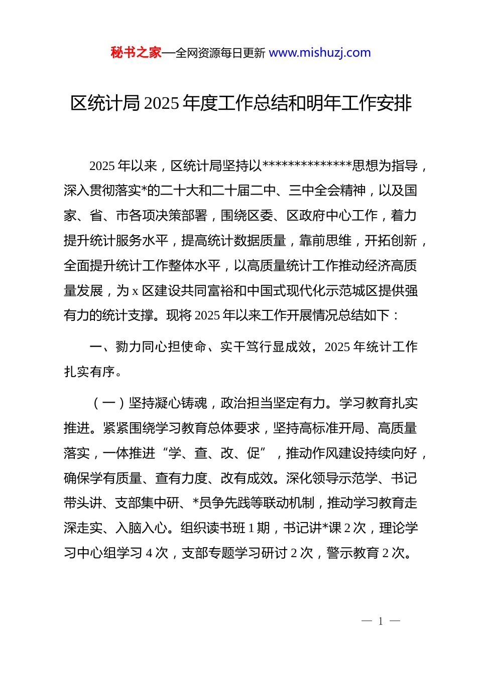 秘书之家—全网资源每日更新 www.mishuzj.com区统计局 2025 年度工作总结和明年工作安排2025 年以来,区统计局坚持以**************思想为指导,深入贯彻落实*的二十大和二十届二中、三中全会精神,以及国家、省、市各项决策部署,围绕区委、区政府中心工作,着力提升统计服务水平,提高统计数据质量,靠前思维,开拓创新,全面提升统计工作整体水平,以高质量统计工作推动经济高质量发展,为 x 区建设共同富裕和中国式现代化示范城区提供强有力的统计支撑。现将 2025 年以来工作开展情况总结如下:一、勠力同心担使命、实干笃行显成效,2025 年统计工作扎实有序。(一)坚持凝心铸魂,政治担当坚定有力。学习教育扎实推进。紧紧围绕学习教育总体要求,坚持高标准开局、高质量落实,一体推进“学、查、改、促”,推动作风建设持续向好,确保学有质量、查有力度、改有成效。深化领导示范学、书记带头讲、支部集中研、*员争先践等联动机制,推动学习教育走深走实、入脑入心。组织读书班 1 期,书记讲*课 2 次,理论学习中心组学习 4 次,支部专题学习研讨 2 次,警示教育 2 次。— 1 —秘书之家—全网资源每日更新 www.mishuzj.com对照 2 个问题清单及实施细则,班子查摆问题 11 个,制定措施23 条,做到动态更新、实时跟进、按时销号,确保学习教育见行见效。聚焦实效狠抓整改,有效推动统计服务调研更加有力高效,经费开支同比较上年度减少 10 余万元。dj 品牌持续擦亮。进一步深化“数映*心·精诚统计”dj 品牌建设,结合塘家湾社区、勤丰村实际,申报统计调查之家-记账服务站、田间课堂等“北领先锋·机关惠民”特色项目 2 个,慰问困难*员 5 名,参加村 dj 联建及村晚活动,不断推动情感共结难题联解。为退休*员举行荣退仪式,营造积极向上的 dj 文化氛围,促进经验传承和新老交替,增强*组织凝聚力和向心力。(二)坚持靠前站位,监测调查质效齐升。聚焦监测预警强担当。强化 gdp 核算和支撑性指标监测分析,全面研判发展态势,深入剖析问题短板,及时反映经济动脉,为全区经济发展保持稳进提质态势提供有力统计保障。截至目前,共撰写专题分析近 20 篇,其中,1 篇获区委主要领导批示,1 篇获副区长批示。申报局级课题 11 个,其中,择优推荐市级课题 2 个。政务信息录用 6 篇、专报 1 篇。不断优化统计产品,丰富数据维度,全面提升统计产品精细度。进一步扩大数字产品覆盖面,增强传播效能。今年来,发布各类统计产品 20 余期,为区域经— 2 —秘书之家—全网资源每日更新 www.mishuzj.com济稳进提质提供坚实统计支撑。聚焦普查调查重实效。不断深化拓展五经普成果,修订全区普查年度 gdp 历史数据,高质量编撰我区“五经普”公报,并完成后续发布工作,认真编纂《五经普年鉴》,全面加强对普查成果的解读分析,深入开展服务零售额、x 与强区发展比较分析、城乡收入差距等重点课题研究。按照上级统一部署,顺利完成 1%人口抽样调查工作协调小组和办公室组建,分层分批培训,破解业务难点。精准标绘建筑物、划分调查小区、核实住房单元,预计将在 11 月开展入户调查。建立并完善进度公布与质量监督机制,及时解决问题,筑牢调查基础。认真做好第四次全国农业普查的前期准备及预算编制工作,为下阶段农普工作打下良好基础。此外,稳步推进住户调查周期内样本轮换工作,从根本上保障调查数据的真实性与样本代表性。(三)坚持固本夯基,基层基础高效赋能。聚力推进队伍建设。为进一步夯实统计基层基础,推进基层统计工作高效能运行。我局立足 x 实际,深入调研基层统计机构、人员现状、存在问题以及运行状况,形成《关于基层统计力量建设情况的报告》,获区委主要领导批示,并转区委编办、区人社局等部门研办。6 月,区委编办印发《关于完善街道(镇)履职机制— 3 —秘书之家—全网资源每日更新 www.mishuzj.com和优化调整人员岗位设置的通知》(北区编办【2025】25 号),要求完善岗位管理体系,明确了进一步加强统计岗人员力量相关要求及岗位职责,为有效推进统计基层力量建设提供了有力支撑。大力...