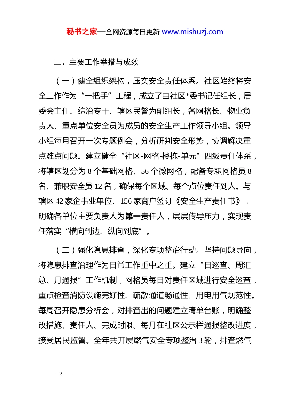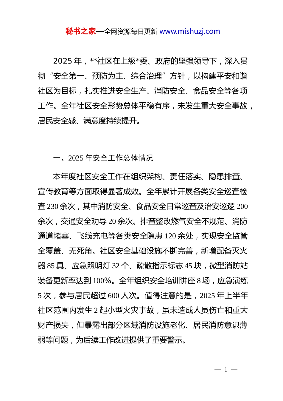 秘书之家—全网资源每日更新 www.mishuzj.com2025 年,**社区在上级*委、政府的坚强领导下,深入贯彻“安全第一、预防为主、综合治理”方针,以构建平安和谐社区为目标,扎实推进安全生产、消防安全、食品安全等各项工作。全年社区安全形势总体平稳有序,未发生重大安全事故,居民安全感、满意度持续提升。一、2025 年安全工作总体情况本年度社区安全工作在组织架构、责任落实、隐患排查、宣传教育等方面取得显著成效。全年累计开展各类安全巡查检查 230 余次,其中消防安全、食品安全日常巡查及治安巡逻 200余次,交通安全劝导 20 余次。排查整改燃气安全不规范、消防通道堵塞、飞线充电等各类安全隐患 120 余处,实现安全监管全覆盖、无死角。社区安全基础设施不断完善,新增配备灭火器 85 具、应急照明灯 32 个、疏散指示标志 45 块,微型消防站装备更新率达到 100%。全年组织安全培训讲座 8 场,应急演练5 次,参与居民超过 600 人次。值得注意的是,2025 年上半年社区范围内发生 2 起小型火灾事故,虽未造成人员伤亡和重大财产损失,但暴露出部分区域消防设施老化、居民消防意识薄弱等问题,为后续工作改进提供了重要警示。— 1 —秘书之家—全网资源每日更新 www.mishuzj.com二、主要工作举措与成效(一)健全组织架构,压实安全责任体系。社区始终将安全工作作为“一把手”工程,成立了由社区*委书记任组长,居委会主任、综治专干、辖区民警为副组长,各网格长、物业负责人、重点单位安全员为成员的安全生产工作领导小组。领导小组每月召开一次专题例会,分析研判安全形势,协调解决重点难点问题。建立健全“社区-网格-楼栋-单元”四级责任体系,将辖区划分为 8 个基础网格、56 个微网格,配备专职网格员 8名、兼职安全员 12 名,确保每个区域、每个点位责任到人。与辖区 42 家企事业单位、156 家商户签订《安全生产责任书》,明确各单位主要负责人为第一责任人,层层传导压力,实现责任落实“横向到边、纵向到底”。(二)强化隐患排查,深化专项整治行动。坚持问题导向,将隐患排查治理作为日常工作重中之重。建立“日巡查、周汇总、月通报”工作机制,网格员每日对责任区域进行安全巡查,重点检查消防设施完好性、疏散通道畅通性、用电用气规范性。每周召开隐患分析会,对排查出的问题建立清单台账,明确整改措施、责任人、完成时限。每月在社区公示栏通报整改进度,接受居民监督。全年共开展燃气安全专项整治 3 轮,排查燃气— 2 —秘书之家—全网资源每日更新 www.mishuzj.com用户 2100 余户,更换老旧软管 560 根,加装燃气报警装置 380个;开展“飞线充电”集中整治行动 4 次,清理违规充电线 120余根,新建集中充电棚 6 处,安装充电桩 48 个;开展消防通道专项整治,清理占用、堵塞消防通道车辆 35 辆,划线标识消防通道 12 条,设置警示标牌 28 块。对排查出的 120 余处隐患,已全部整改完毕,整改率达到 100%,形成隐患排查、登记、整改、销号的闭环管理。(三)创新宣传形式,提升全民安全意识。针对社区人口结构复杂、安全意识参差不齐的特点,社区采取“线上+线下”相结合方式,全方位、多角度开展安全宣传教育。线上依托社区微信公众号、居民微信群,定期推送安全提示、案例警示、应急知识等内容,全年发布安全信息 180 余条,阅读量超过 8000 次。线下利用宣传栏、电子显示屏、横幅标语等传统媒介,营造浓厚安全氛围。全年发放《居民安全手册》2500 余份,张贴宣传海报 300 余张,悬挂横幅 18 条。重点抓好特殊人群安全教育,为 60 岁以上老年人、残障人士等特殊群体开展“敲门行动”,上门讲解用电用气安全知识,帮助排查家庭隐患,覆盖特殊人群 280 户。组织青少年暑期安全夏令营活动,通过游戏互动、情景模拟等方式,向 200 余名中小学生传授防溺水、— 3 —秘书之家—全网资源每日更新 www.mishuzj.com防火灾、防触电等安全常识,实现“教育一个孩子、带动一个家庭、影响整个社区”的效果。(四)加强培训演练,提高应急处置能力。社区深刻认识到,应急处置能力是检...