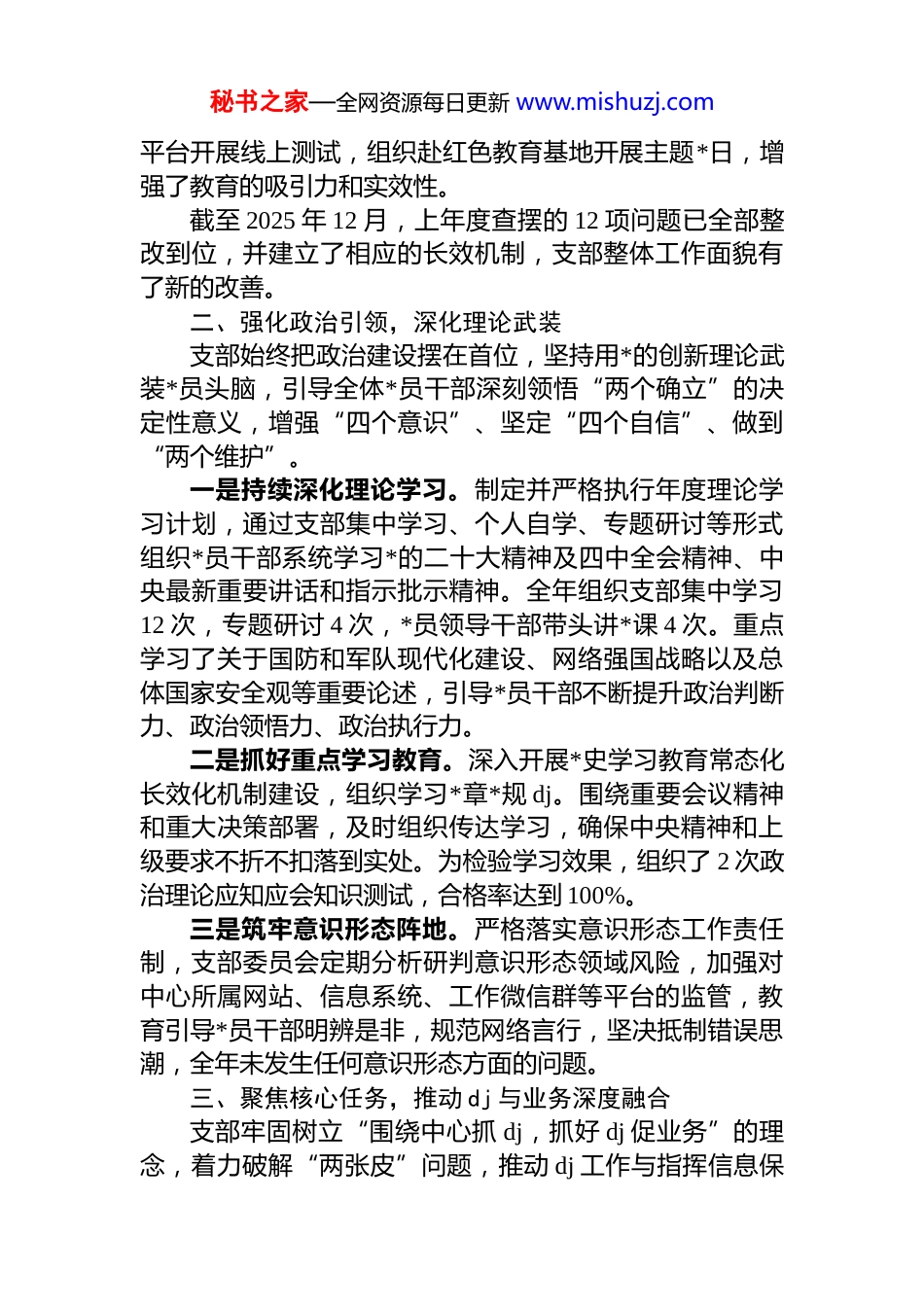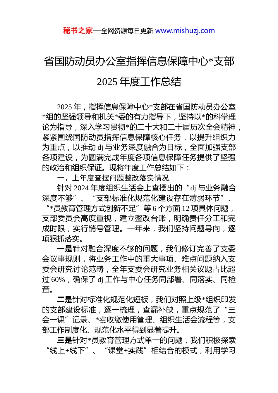 秘书之家—全网资源每日更新 www.mishuzj.com省国防动员办公室指挥信息保障中心*支部2025 年度工作总结2025 年,指挥信息保障中心*支部在省国防动员办公室*组的坚强领导和机关*委的有力指导下,坚持以*的科学理论为指导,深入学习贯彻*的二十大和二十届历次全会精神,紧紧围绕国防动员指挥信息保障核心任务,以提升组织力为重点,以推动 dj 与业务深度融合为目标,全面加强支部各项建设,为圆满完成年度各项信息保障任务提供了坚强的政治和组织保证。现将年度工作总结如下:一、上年度查摆问题整改落实情况针对 2024 年度组织生活会上查摆出的“dj 与业务融合深度不够”、“支部标准化规范化建设存在薄弱环节”、“*员教育管理方式创新不足”等 6 个方面 12 项具体问题,支部委员会高度重视,建立整改台账,明确责任分工和完成时限,实行销号管理。一年来,我们坚持问题导向,逐项狠抓落实。一是针对融合深度不够的问题,我们修订完善了支委会议事规则,将业务工作中的重大事项、难点问题纳入支委会研究讨论范畴,全年支委会研究业务相关议题占比超过 60%,确保了 dj 工作与中心任务同部署、同落实、同检查。二是针对标准化规范化短板,我们对照上级*组织印发的支部建设标准,逐一梳理,查漏补缺,重点规范了“三会一课”记录、*费收缴使用管理、组织生活会流程等,支部工作制度化、规范化水平得到显著提升。三是针对*员教育管理方式单一的问题,我们积极探索“线上+线下”、“课堂+实践”相结合的模式,利用学习秘书之家—全网资源每日更新 www.mishuzj.com平台开展线上测试,组织赴红色教育基地开展主题*日,增强了教育的吸引力和实效性。截至 2025 年 12 月,上年度查摆的 12 项问题已全部整改到位,并建立了相应的长效机制,支部整体工作面貌有了新的改善。二、强化政治引领,深化理论武装支部始终把政治建设摆在首位,坚持用*的创新理论武装*员头脑,引导全体*员干部深刻领悟“两个确立”的决定性意义,增强“四个意识”、坚定“四个自信”、做到“两个维护”。一是持续深化理论学习。制定并严格执行年度理论学习计划,通过支部集中学习、个人自学、专题研讨等形式组织*员干部系统学习*的二十大精神及四中全会精神、中央最新重要讲话和指示批示精神。全年组织支部集中学习12 次,专题研讨 4 次,*员领导干部带头讲*课 4 次。重点学习了关于国防和军队现代化建设、网络强国战略以及总体国家安全观等重要论述,引导*员干部不断提升政治判断力、政治领悟力、政治执行力。二是抓好重点学习教育。深入开展*史学习教育常态化长效化机制建设,组织学习*章*规 dj。围绕重要会议精神和重大决策部署,及时组织传达学习,确保中央精神和上级要求不折不扣落到实处。为检验学习效果,组织了 2 次政治理论应知应会知识测试,合格率达到 100%。三是筑牢意识形态阵地。严格落实意识形态工作责任制,支部委员会定期分析研判意识形态领域风险,加强对中心所属网站、信息系统、工作微信群等平台的监管,教育引导*员干部明辨是非,规范网络言行,坚决抵制错误思潮,全年未发生任何意识形态方面的问题。三、聚焦核心任务,推动 dj 与业务深度融合支部牢固树立“围绕中心抓 dj,抓好 dj 促业务”的理念,着力破解“两张皮”问题,推动 dj 工作与指挥信息保秘书之家—全网资源每日更新 www.mishuzj.com障业务同频共振、相互促进。一是机制融合。坚持支委会研究讨论业务重大事项机制,在谋划年度工作、部署重大任务、攻克技术难题时,首先从政治角度考量,发挥*支部的战斗堡垒作用。例如,在承担“xx-2025”联合演习信息保障任务前,支部专门召开动员会,成立*员突击队,将 dj 要求融入任务全过程。二是载体融合。广泛开展“*员先锋岗”、“技术攻关小组”等活动,引导*员在应急通信保障、网络安全防护、信息系统运维等关键岗位和急难险重任务中亮身份、当先锋、作表率。2025 年,在应对 xx 区域突发自然灾害应急通信保障中,*员技术骨干连续奋战 36 小时,确保了指挥链路畅通,发挥了决定性作用。三是能力融合。将政治理论学习与业务技能提升相结合,...