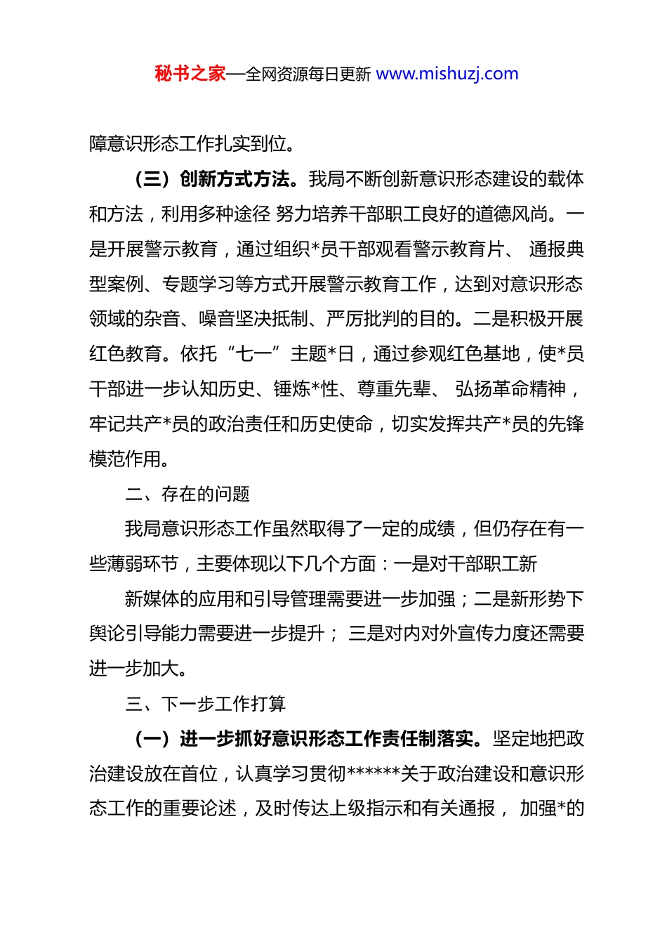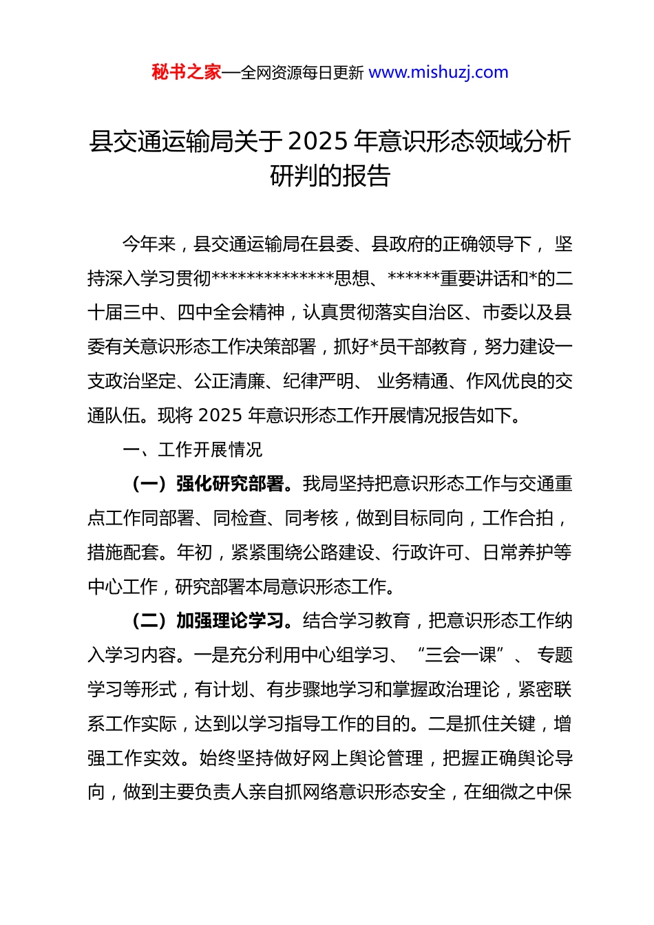 秘书之家—全网资源每日更新 www.mishuzj.com县交通运输局关于 2025 年意识形态领域分析研判的报告今年来,县交通运输局在县委、县政府的正确领导下, 坚持深入学习贯彻**************思想、******重要讲话和*的二十届三中、四中全会精神,认真贯彻落实自治区、市委以及县委有关意识形态工作决策部署,抓好*员干部教育,努力建设一支政治坚定、公正清廉、纪律严明、 业务精通、作风优良的交通队伍。现将 2025 年意识形态工作开展情况报告如下。一、工作开展情况(一)强化研究部署。我局坚持把意识形态工作与交通重点工作同部署、同检查、同考核,做到目标同向,工作合拍,措施配套。年初,紧紧围绕公路建设、行政许可、日常养护等中心工作,研究部署本局意识形态工作。(二)加强理论学习。结合学习教育,把意识形态工作纳入学习内容。一是充分利用中心组学习、“三会一课”、 专题学习等形式,有计划、有步骤地学习和掌握政治理论,紧密联系工作实际,达到以学习指导工作的目的。二是抓住关键,增强工作实效。始终坚持做好网上舆论管理,把握正确舆论导向,做到主要负责人亲自抓网络意识形态安全,在细微之中保秘书之家—全网资源每日更新 www.mishuzj.com障意识形态工作扎实到位。(三)创新方式方法。我局不断创新意识形态建设的载体和方法,利用多种途径 努力培养干部职工良好的道德风尚。一是开展警示教育,通过组织*员干部观看警示教育片、 通报典型案例、专题学习等方式开展警示教育工作,达到对意识形态领域的杂音、噪音坚决抵制、严厉批判的目的。二是积极开展红色教育。依托“七一”主题*日,通过参观红色基地,使*员干部进一步认知历史、锤炼*性、尊重先辈、 弘扬革命精神,牢记共产*员的政治责任和历史使命,切实发挥共产*员的先锋模范作用。二、存在的问题我局意识形态工作虽然取得了一定的成绩,但仍存在有一些薄弱环节,主要体现以下几个方面:一是对干部职工新新媒体的应用和引导管理需要进一步加强;二是新形势下舆论引导能力需要进一步提升; 三是对内对外宣传力度还需要进一步加大。三、下一步工作打算(一)进一步抓好意识形态工作责任制落实。坚定地把政治建设放在首位,认真学习贯彻******关于政治建设和意识形态工作的重要论述,及时传达上级指示和有关通报, 加强*的秘书之家—全网资源每日更新 www.mishuzj.com宣传和舆情监督,主动做好政治教育阵地建设,督导各股室、二级单位抓好责任制落实,确保政治安全。(二)进一步加强*的理论武装。严格落实好每周二、周四集中学习制度,不断深化全局干部职工的理论学习。(三)进一步加强舆情管控。加强网络正面宣传,切实用主旋律凝聚人感染人。加强网络舆情监测和应急处置, 减少负面影响,发挥和谐向上的正能量。
