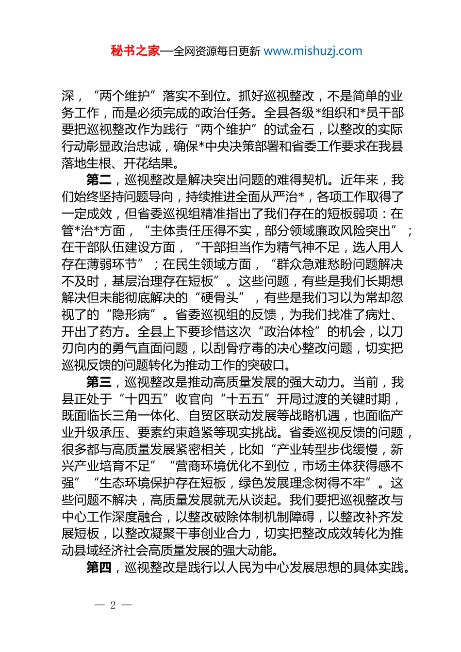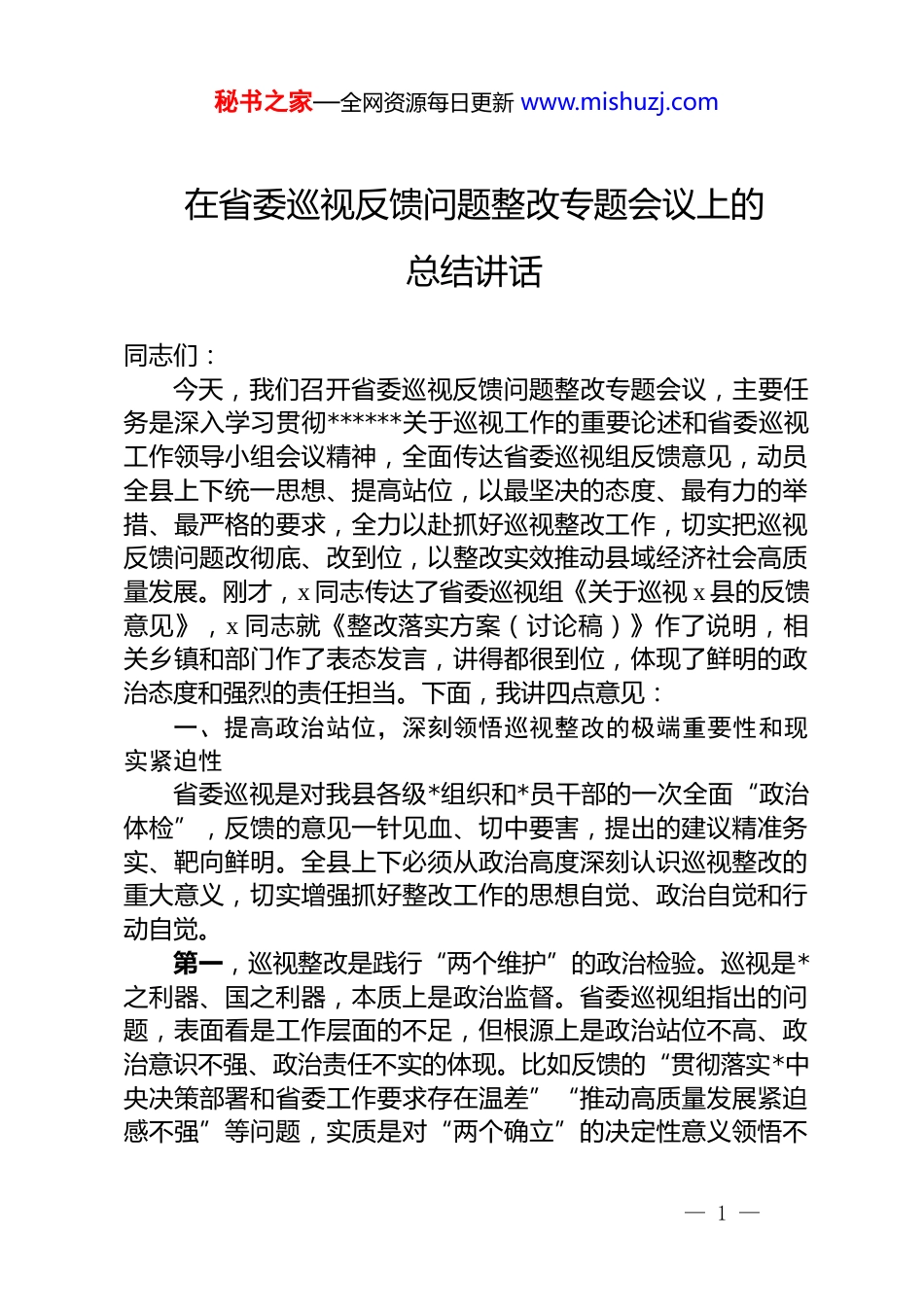 秘书之家—全网资源每日更新 www.mishuzj.com在省委巡视反馈问题整改专题会议上的总结讲话同志们:今天,我们召开省委巡视反馈问题整改专题会议,主要任务是深入学习贯彻******关于巡视工作的重要论述和省委巡视工作领导小组会议精神,全面传达省委巡视组反馈意见,动员全县上下统一思想、提高站位,以最坚决的态度、最有力的举措、最严格的要求,全力以赴抓好巡视整改工作,切实把巡视反馈问题改彻底、改到位,以整改实效推动县域经济社会高质量发展。刚才,x 同志传达了省委巡视组《关于巡视 x 县的反馈意见》,x 同志就《整改落实方案(讨论稿)》作了说明,相关乡镇和部门作了表态发言,讲得都很到位,体现了鲜明的政治态度和强烈的责任担当。下面,我讲四点意见:一、提高政治站位,深刻领悟巡视整改的极端重要性和现实紧迫性省委巡视是对我县各级*组织和*员干部的一次全面“政治体检”,反馈的意见一针见血、切中要害,提出的建议精准务实、靶向鲜明。全县上下必须从政治高度深刻认识巡视整改的重大意义,切实增强抓好整改工作的思想自觉、政治自觉和行动自觉。第一,巡视整改是践行“两个维护”的政治检验。巡视是*之利器、国之利器,本质上是政治监督。省委巡视组指出的问题,表面看是工作层面的不足,但根源上是政治站位不高、政治意识不强、政治责任不实的体现。比如反馈的“贯彻落实*中央决策部署和省委工作要求存在温差”“推动高质量发展紧迫感不强”等问题,实质是对“两个确立”的决定性意义领悟不— 1 —秘书之家—全网资源每日更新 www.mishuzj.com深,“两个维护”落实不到位。抓好巡视整改,不是简单的业务工作,而是必须完成的政治任务。全县各级*组织和*员干部要把巡视整改作为践行“两个维护”的试金石,以整改的实际行动彰显政治忠诚,确保*中央决策部署和省委工作要求在我县落地生根、开花结果。第二,巡视整改是解决突出问题的难得契机。近年来,我们始终坚持问题导向,持续推进全面从严治*,各项工作取得了一定成效,但省委巡视组精准指出了我们存在的短板弱项:在管*治*方面,“主体责任压得不实,部分领域廉政风险突出”;在干部队伍建设方面,“干部担当作为精气神不足,选人用人存在薄弱环节”;在民生领域方面,“群众急难愁盼问题解决不及时,基层治理存在短板”。这些问题,有些是我们长期想解决但未能彻底解决的“硬骨头”,有些是我们习以为常却忽视了的“隐形病”。省委巡视组的反馈,为我们找准了病灶、开出了药方。全县上下要珍惜这次“政治体检”的机会,以刀刃向内的勇气直面问题,以刮骨疗毒的决心整改问题,切实把巡视反馈的问题转化为推动工作的突破口。第三,巡视整改是推动高质量发展的强大动力。当前,我县正处于“十四五”收官向“十五五”开局过渡的关键时期,既面临长三角一体化、自贸区联动发展等战略机遇,也面临产业升级承压、要素约束趋紧等现实挑战。省委巡视反馈的问题,很多都与高质量发展紧密相关,比如“产业转型步伐缓慢,新兴产业培育不足”“营商环境优化不到位,市场主体获得感不强”“生态环境保护存在短板,绿色发展理念树得不牢”。这些问题不解决,高质量发展就无从谈起。我们要把巡视整改与中心工作深度融合,以整改破除体制机制障碍,以整改补齐发展短板,以整改凝聚干事创业合力,切实把整改成效转化为推动县域经济社会高质量发展的强大动能。第四,巡视整改是践行以人民为中心发展思想的具体实践。— 2 —秘书之家—全网资源每日更新 www.mishuzj.com巡视反馈的问题中,不少涉及群众切身利益,比如“农村饮水安全巩固提升工程推进缓慢”“老旧小区改造配套设施不完善”“教育医疗资源均衡配置不足”“信访积案化解不彻底”等。这些问题看似小事,却直接关系到群众的获得感、幸福感、安全感。我们*的根本宗旨是全心全意为人民服务,抓好巡视整改,就是要解决好群众最关心、最直接、最现实的利益问题。全县各级*组织要始终坚持以人民为中心的发展思想,把群众满意作为整改的出发点和落脚点,用整改的实际成效回应群众期盼,不断夯实*的执政根基。二、聚焦问题靶心,以精准有力举措推动巡视整改落...
