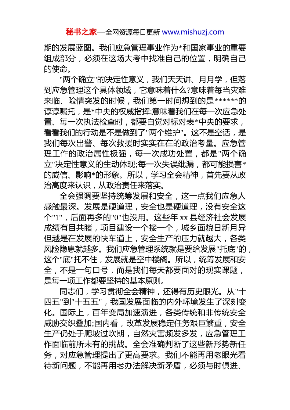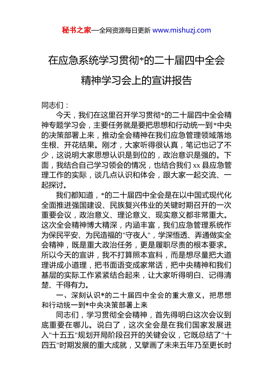 秘书之家—全网资源每日更新 www.mishuzj.com在应急系统学习贯彻*的二十届四中全会精神学习会上的宣讲报告同志们:今天,我们在这里召开学习贯彻*的二十届四中全会精神专题学习会,主要任务就是要把思想和行动统一到*中央的决策部署上来,推动全会精神在我们应急管理领域落地生根、开花结果。刚才,大家听得很认真,笔记也记了不少,这说明大家思想认识是到位的,政治意识是强的。下面,我结合自己学习领会的情况,也结合我们 xx 县应急管理工作的实际,谈几点认识和体会,跟大家一起交流、一起探讨。我们都知道,*的二十届四中全会是在以中国式现代化全面推进强国建设、民族复兴伟业的关键时期召开的一次重要会议,政治意义、理论意义、现实意义都非常重大。这次全会精神博大精深,内涵丰富,我们应急管理系统作为保民平安、为民造福的"守夜人",学深悟透、弄通做实全会精神,既是重大政治任务,更是履职尽责的根本要求。所以今天的宣讲,我不打算照本宣科,而是想尽量把大道理讲成小道理,把书面语变成家常话,把中央精神和我们基层的实际工作紧紧结合起来,让大家听得明白、记得清楚、干得有力。一、深刻认识*的二十届四中全会的重大意义,把思想和行动统一到*中央决策部署上来同志们,学习贯彻全会精神,首先得明白这次会议到底重要在哪儿。说白了,这次全会是在我们国家发展进入"十五五"规划开局阶段召开的关键会议,它既总结了"十四五"时期发展的重大成就,又擘画了未来五年乃至更长时秘书之家—全网资源每日更新 www.mishuzj.com期的发展蓝图。我们应急管理事业作为*和国家事业的重要组成部分,必须在这场大考中找准自己的位置,明确自己的使命。"两个确立"的决定性意义,我们天天讲、月月学,但落到应急管理这个具体领域,它意味着什么?意味着每当灾难来临、险情突发的时候,我们第一时间想到的是******的谆谆嘱托,是*中央的权威指挥;意味着我们在每一次应急处置、每一次执法检查时,都要自觉对标对表*中央的要求,看看我们的行动是不是做到了"两个维护"。这不是空话,是我们每次出警、每次救援时实实在在的政治考量。应急管理工作的政治属性极强,每一次成功处置,都是"两个确立"决定性意义的生动体现;每一次失误纰漏,都可能损害*的威信、影响*的形象。所以,学习全会精神,首先要从政治高度来认识,从政治责任来落实。全会强调要坚持统筹发展和安全,这一点我们应急人感触最深。发展是硬道理,安全也是硬道理,没有安全这个"1",后面再多的"0"也没用。这些年 xx 县经济社会发展成绩有目共睹,项目建设一个接一个,城乡面貌日新月异但越是在发展的快车道上,安全生产的压力就越大,各类风险隐患就越多。我们应急管理系统就是要给发展"托底"的,这个"底"托不住,发展就是空中楼阁。所以,统筹发展和安全,不是一句口号,而是我们每天都要面对的现实课题,是每一项工作都要坚持的基本原则。同志们,学习贯彻全会精神,还得有历史眼光。从"十四五"到"十五五",我国发展面临的内外环境发生了深刻变化。国际上,百年变局加速演进,各类传统和非传统安全威胁交织叠加;国内看,改革发展稳定任务艰巨繁重,安全生产仍处于爬坡过坎期,自然灾害频发多发,应急管理工作面临前所未有的挑战。全会准确判断了这些新形势新任务,对应急管理提出了更高要求。我们不能再用老眼光看待新问题,不能再用老办法解决新矛盾,必须与时俱进、秘书之家—全网资源每日更新 www.mishuzj.com开拓创新,以更高标准、更严要求、更实举措,推动应急管理事业高质量发展。二、准确把握"十五五"时期应急管理事业发展的战略定位和目标方向进入"十五五"时期,应急管理事业怎么定位?往哪儿去?全会精神给出了明确答案。我们要深刻领会,应急管理现代化是国家治理体系和治理能力现代化的重要内容,是中国式现代化不可或缺的安全保障。这就要求我们必须跳出应急看应急,站在*和国家事业全局的高度来谋划推进工作。首先,要准确把握"保民平安、为民造福"这个初心使命。应急管理部门因人民而生、为人民而设,人民至上、生命至上是我们一切工作的出发点和落脚点。说白了,老百姓过日子图什么?图的就是平平安...