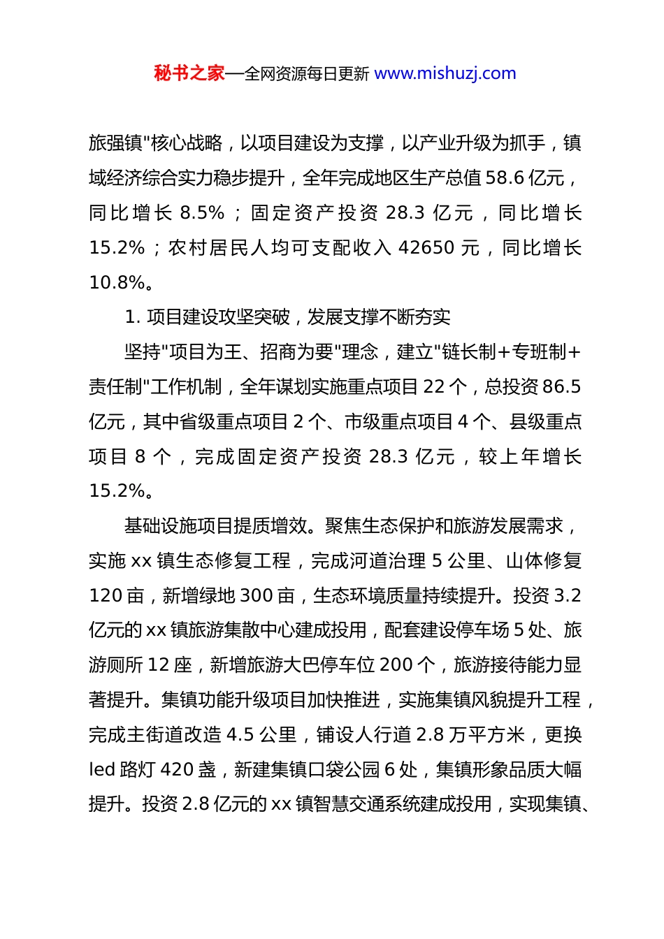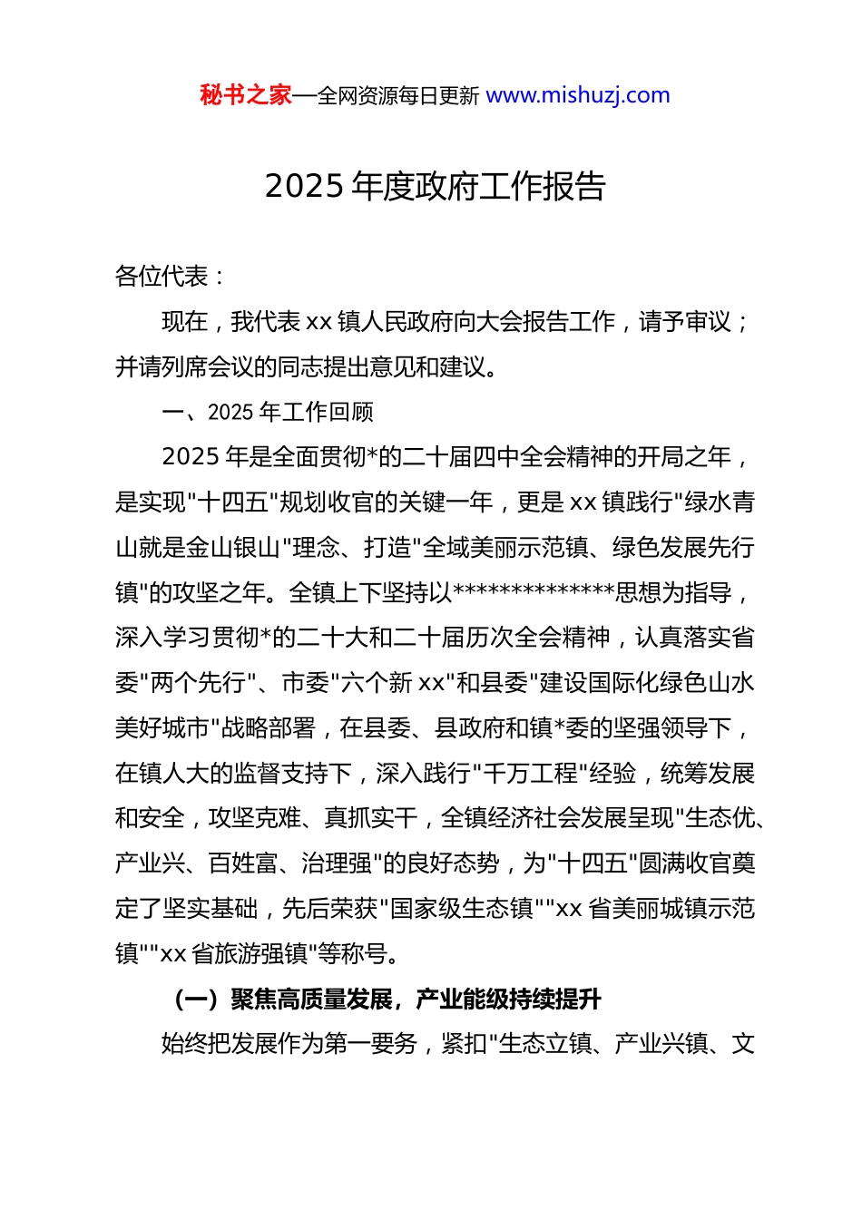 秘书之家—全网资源每日更新 www.mishuzj.com2025 年度政府工作报告各位代表:现在,我代表 xx 镇人民政府向大会报告工作,请予审议;并请列席会议的同志提出意见和建议。一、2025 年工作回顾2025 年是全面贯彻*的二十届四中全会精神的开局之年,是实现"十四五"规划收官的关键一年,更是 xx 镇践行"绿水青山就是金山银山"理念、打造"全域美丽示范镇、绿色发展先行镇"的攻坚之年。全镇上下坚持以**************思想为指导,深入学习贯彻*的二十大和二十届历次全会精神,认真落实省委"两个先行"、市委"六个新 xx"和县委"建设国际化绿色山水美好城市"战略部署,在县委、县政府和镇*委的坚强领导下,在镇人大的监督支持下,深入践行"千万工程"经验,统筹发展和安全,攻坚克难、真抓实干,全镇经济社会发展呈现"生态优、产业兴、百姓富、治理强"的良好态势,为"十四五"圆满收官奠定了坚实基础,先后荣获"国家级生态镇""xx 省美丽城镇示范镇""xx 省旅游强镇"等称号。(一)聚焦高质量发展,产业能级持续提升始终把发展作为第一要务,紧扣"生态立镇、产业兴镇、文秘书之家—全网资源每日更新 www.mishuzj.com旅强镇"核心战略,以项目建设为支撑,以产业升级为抓手,镇域经济综合实力稳步提升,全年完成地区生产总值 58.6 亿元,同 比 增 长 8.5% ; 固 定 资 产 投 资 28.3 亿 元 , 同 比 增 长15.2% ;农村居民人均可支配收入 42650 元,同比增长10.8%。1. 项目建设攻坚突破,发展支撑不断夯实坚持"项目为王、招商为要"理念,建立"链长制+专班制+责任制"工作机制,全年谋划实施重点项目 22 个,总投资 86.5亿元,其中省级重点项目 2 个、市级重点项目 4 个、县级重点项 目 8 个 , 完 成 固 定 资 产 投 资 28.3 亿 元 , 较 上 年 增 长15.2%。基础设施项目提质增效。聚焦生态保护和旅游发展需求,实施 xx 镇生态修复工程,完成河道治理 5 公里、山体修复120 亩,新增绿地 300 亩,生态环境质量持续提升。投资 3.2亿元的 xx 镇旅游集散中心建成投用,配套建设停车场 5 处、旅游厕所 12 座,新增旅游大巴停车位 200 个,旅游接待能力显著提升。集镇功能升级项目加快推进,实施集镇风貌提升工程,完成主街道改造 4.5 公里,铺设人行道 2.8 万平方米,更换led 路灯 420 盏,新建集镇口袋公园 6 处,集镇形象品质大幅提升。投资 2.8 亿元的 xx 镇智慧交通系统建成投用,实现集镇、秘书之家—全网资源每日更新 www.mishuzj.com景区交通信号智能调控,有效缓解了旅游旺季交通拥堵问题。产业项目落地见效。成功引进投资 12.5 亿元的 xx 绿谷新能源项目、投资 8.6 亿元的 xx 县 xx 文旅综合体项目等亿元级项目 8 个,千万元级项目 12 个,完成招商引资到位资金 36.8亿元,完成率达 122%。其中 xx 绿谷新能源项目总投资 12.5亿元,当年开工建设并实现部分投产,预计年产值可达 25 亿元,带动就业 800 余人。积极争取上级政策支持,申报 2026年国家乡村旅游重点村建设项目等储备项目 8 个,前期手续已完成 6 项,为后续发展积蓄动能。投资 5.2 亿元的 xx 镇数字经济产业园建成投用,新增标准化厂房 12 万平方米,入驻企业24 家,年产值新增 8.5 亿元。2. 产业结构优化升级,增收动能持续增强坚决扛牢粮食安全政治责任,严格落实耕地保护制度,完成粮食播种面积 1.8 万亩,总产量达 1.08 万吨,其中水稻种植1.2 万亩、小麦种植 0.6 万亩,粮食产量连续 10 年稳定在 1 万吨以上。依托良好生态环境,发展生态农业,建成绿色食品基地 1.5 万亩,认证绿色食品 28 个、有机食品 12 个,生态农业产值达 3.2 亿元。特色农业提质增效。依托本地资源禀赋,培育壮大 xx 白茶、高山蔬菜、林下经济等特色产业,建成 xx 白茶种植基地 3.2 万秘书之家—全网资源每日更新 www.mishuzj.com亩、高山蔬菜种植基地 0.8 万亩、林下中药材种植基地 0.5 万亩,发展特色种植专业合作社 48 家,家庭农场 32 家。其中xx 镇白茶专业合作社培育的...