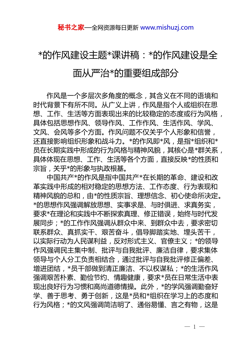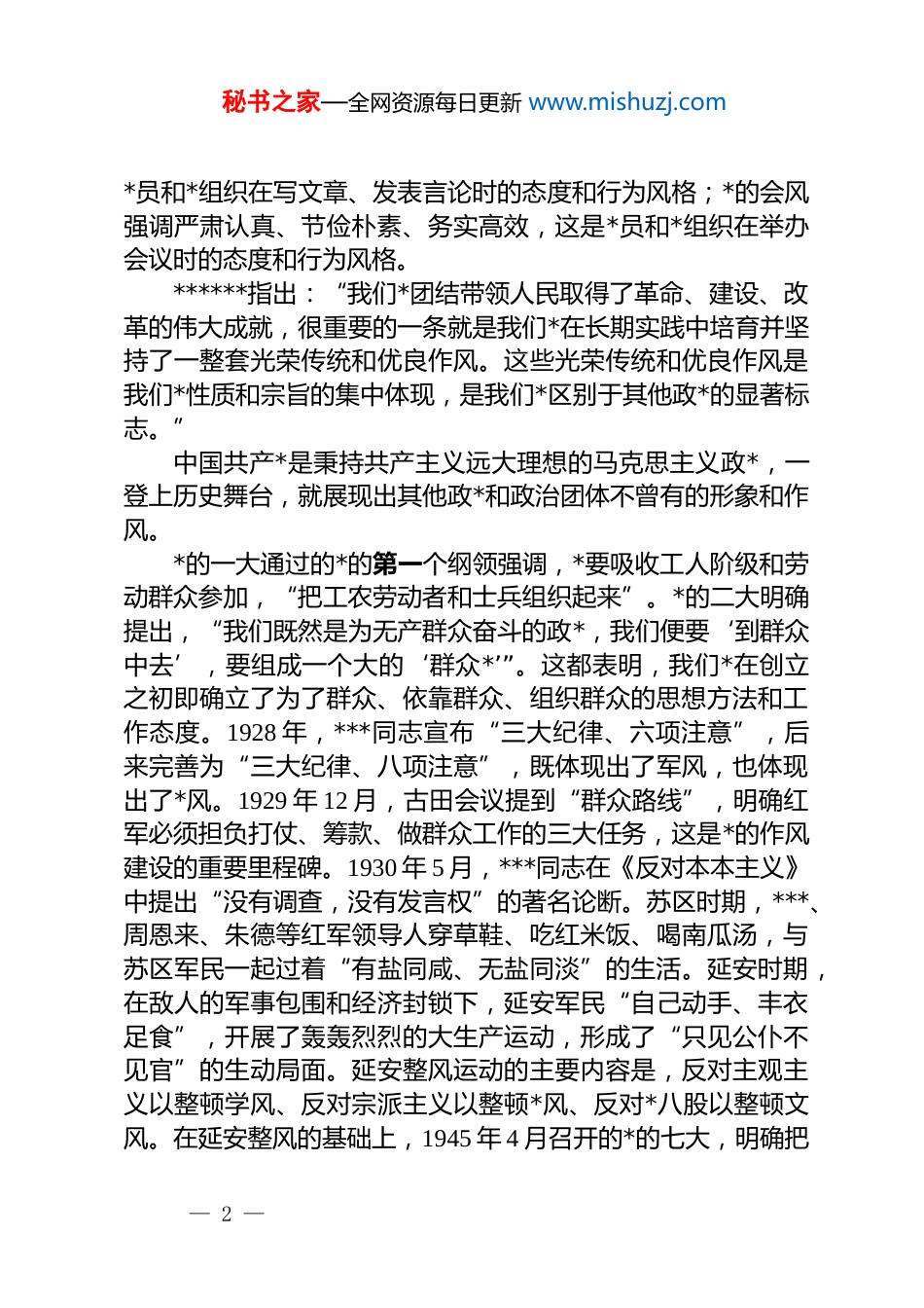 秘书之家—全网资源每日更新 www.mishuzj.com*的作风建设主题*课讲稿:*的作风建设是全面从严治*的重要组成部分作风是一个多层次多角度的概念,其含义在不同的语境和时代背景下有所不同。从广义上讲,作风是指个人或组织在思想、工作、生活等方面表现出来的比较稳定的态度或行为风格,具体包括思想作风、领导作风、工作作风、生活作风、学风、文风、会风等多个方面。作风问题不仅关乎个人形象和信誉,还直接影响组织形象和战斗力。*的作风即*风,是指*组织和*员在长期实践中形成的行为风格与精神风貌,其核心是*群关系,具体体现在思想、工作、生活等各个方面,直接反映*的性质和宗旨,关乎*的形象与执政根基。中国共产*的作风是指中国共产*在长期的革命、建设和改革实践中形成的相对稳定的思想方法、工作态度、行为表现和精神风貌的总和,由*的性质宗旨、理想信念、初心使命所决定。*的思想作风强调解放思想、实事求是、与时俱进、求真务实,要求*在理论和实践中不断探索真理、修正错误,始终与时代发展同步;*的工作作风强调从群众中来、到群众中去,要求密切联系群众、真抓实干、艰苦奋斗,倡导脚踏实地、埋头苦干,以实际行动为人民谋利益,反对形式主义、官僚主义;*的领导作风强调民主集中制、批评与自我批评、廉洁自律,要求集体领导与个人分工负责相结合,通过批评与自我批评修正偏差、增进团结,*员干部做到清正廉洁、不以权谋私;*的生活作风强调艰苦朴素、勤俭节约、情趣健康,要求*员在日常生活中表现出良好行为习惯和高尚道德情操。此外,*的学风强调勤奋好学、善于思考、勇于创新,这是*员和*组织在学习上的态度和行为风格;*的文风强调简洁明了、通俗易懂、言之有物,这是— 1 —秘书之家—全网资源每日更新 www.mishuzj.com*员和*组织在写文章、发表言论时的态度和行为风格;*的会风强调严肃认真、节俭朴素、务实高效,这是*员和*组织在举办会议时的态度和行为风格。******指出:“我们*团结带领人民取得了革命、建设、改革的伟大成就,很重要的一条就是我们*在长期实践中培育并坚持了一整套光荣传统和优良作风。这些光荣传统和优良作风是我们*性质和宗旨的集中体现,是我们*区别于其他政*的显著标志。”中国共产*是秉持共产主义远大理想的马克思主义政*,一登上历史舞台,就展现出其他政*和政治团体不曾有的形象和作风。*的一大通过的*的第一个纲领强调,*要吸收工人阶级和劳动群众参加,“把工农劳动者和士兵组织起来”。*的二大明确提出,“我们既然是为无产群众奋斗的政*,我们便要‘到群众中去’,要组成一个大的‘群众*’”。这都表明,我们*在创立之初即确立了为了群众、依靠群众、组织群众的思想方法和工作态度。1928 年,***同志宣布“三大纪律、六项注意”,后来完善为“三大纪律、八项注意”,既体现出了军风,也体现出了*风。1929 年 12 月,古田会议提到“群众路线”,明确红军必须担负打仗、筹款、做群众工作的三大任务,这是*的作风建设的重要里程碑。1930 年 5 月,***同志在《反对本本主义》中提出“没有调查,没有发言权”的著名论断。苏区时期,***、周恩来、朱德等红军领导人穿草鞋、吃红米饭、喝南瓜汤,与苏区军民一起过着“有盐同咸、无盐同淡”的生活。延安时期,在敌人的军事包围和经济封锁下,延安军民“自己动手、丰衣足食”,开展了轰轰烈烈的大生产运动,形成了“只见公仆不见官”的生动局面。延安整风运动的主要内容是,反对主观主义以整顿学风、反对宗派主义以整顿*风、反对*八股以整顿文风。在延安整风的基础上,1945 年 4 月召开的*的七大,明确把— 2 —秘书之家—全网资源每日更新 www.mishuzj.com理论联系实际、密切联系群众、批评与自我批评确立为*的三大优良作风。新中国成立前夕,***同志在*的七届二中全会上提出:“务必使同志们继续地保持谦虚、谨慎、不骄、不躁的作风,务必使同志们继续地保持艰苦奋斗的作风”。除了“两个务必”,*的七届二中全会还强调了六条规定:“一、不做寿;二、不送礼;三、少敬酒;四、少拍掌;五、不以人名作地名;六、不要把中国同志同马恩列斯平列。”这些都加强了*的作...