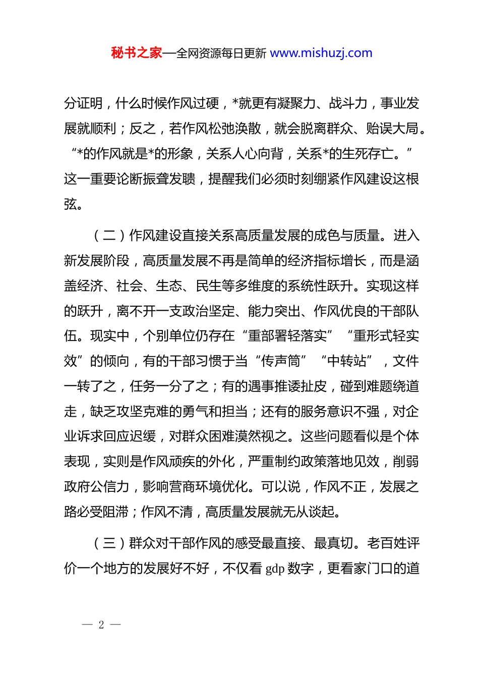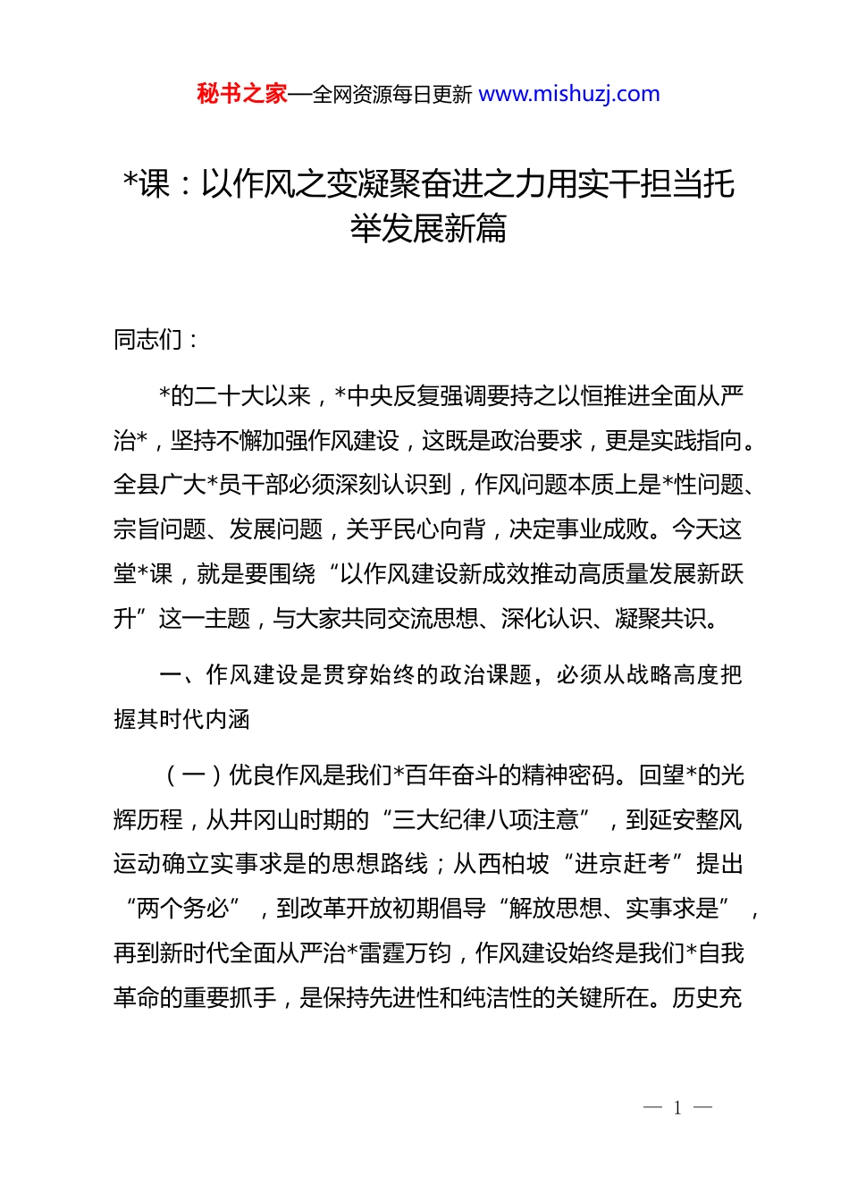 秘书之家—全网资源每日更新 www.mishuzj.com*课:以作风之变凝聚奋进之力用实干担当托举发展新篇同志们:*的二十大以来,*中央反复强调要持之以恒推进全面从严治*,坚持不懈加强作风建设,这既是政治要求,更是实践指向。全县广大*员干部必须深刻认识到,作风问题本质上是*性问题、宗旨问题、发展问题,关乎民心向背,决定事业成败。今天这堂*课,就是要围绕“以作风建设新成效推动高质量发展新跃升”这一主题,与大家共同交流思想、深化认识、凝聚共识。一、作风建设是贯穿始终的政治课题,必须从战略高度把握其时代内涵(一)优良作风是我们*百年奋斗的精神密码。回望*的光辉历程,从井冈山时期的“三大纪律八项注意”,到延安整风运动确立实事求是的思想路线;从西柏坡“进京赶考”提出“两个务必”,到改革开放初期倡导“解放思想、实事求是”,再到新时代全面从严治*雷霆万钧,作风建设始终是我们*自我革命的重要抓手,是保持先进性和纯洁性的关键所在。历史充— 1 —秘书之家—全网资源每日更新 www.mishuzj.com分证明,什么时候作风过硬,*就更有凝聚力、战斗力,事业发展就顺利;反之,若作风松弛涣散,就会脱离群众、贻误大局。“*的作风就是*的形象,关系人心向背,关系*的生死存亡。”这一重要论断振聋发聩,提醒我们必须时刻绷紧作风建设这根弦。(二)作风建设直接关系高质量发展的成色与质量。进入新发展阶段,高质量发展不再是简单的经济指标增长,而是涵盖经济、社会、生态、民生等多维度的系统性跃升。实现这样的跃升,离不开一支政治坚定、能力突出、作风优良的干部队伍。现实中,个别单位仍存在“重部署轻落实”“重形式轻实效”的倾向,有的干部习惯于当“传声筒”“中转站”,文件一转了之,任务一分了之;有的遇事推诿扯皮,碰到难题绕道走,缺乏攻坚克难的勇气和担当;还有的服务意识不强,对企业诉求回应迟缓,对群众困难漠然视之。这些问题看似是个体表现,实则是作风顽疾的外化,严重制约政策落地见效,削弱政府公信力,影响营商环境优化。可以说,作风不正,发展之路必受阻滞;作风不清,高质量发展就无从谈起。(三)群众对干部作风的感受最直接、最真切。老百姓评价一个地方的发展好不好,不仅看 gdp 数字,更看家门口的道— 2 —秘书之家—全网资源每日更新 www.mishuzj.com路是否畅通、孩子上学是否方便、看病就医是否快捷、办事流程是否顺畅。这些具体而微的生活体验,背后折射的是干部的工作态度和服务水平。一位退休教师曾感慨:“现在去政务大厅办事,窗口人员笑脸相迎,材料一次告知,不用来回跑,心里踏实多了。”这样朴素的话语,正是对我们作风建设成果最真实的肯定。相反,如果群众反映的问题长期得不到回应,合理诉求被敷衍塞责,哪怕经济发展再快,也难以赢得真心拥护。因此,作风建设不是抽象概念,而是体现在每一次接待来访、每一份审批办理、每一项惠民政策落实之中,它连接着*心与民心,承载着信任与期待。二、对标新形势新要求,准确识别当前作风建设中的突出问题(一)思想层面仍需进一步破除惯性思维。一是存在“路径依赖”现象。部分干部习惯于按老办法办事,面对新形势新任务缺乏创新意识,在工作中满足于“过得去”,不愿动脑筋想办法,导致一些改革举措停留在纸面,未能转化为实际成效。二是存在“本位主义”倾向。有的部门只顾自己“一亩三分地”,协调配合意识不强,跨领域、跨层级事项推进缓慢,形成“中梗阻”。三是存在“畏难情绪”。面对复杂矛盾和历史— 3 —秘书之家—全网资源每日更新 www.mishuzj.com遗留问题,个别干部怕担责任、怕惹麻烦,宁可“不干事”也不愿“干错事”,缺乏应有的斗争精神和担当魄力。(二)工作落实中仍有“虚浮空”现象。一是调研不够深入。有的干部下基层走马观花,坐在车上转、隔着玻璃看,听汇报多、问群众少,掌握情况不全面,制定政策脱离实际。某乡镇在推进农村改厕过程中,未充分征求村民意见,统一安装型号不符合使用习惯,结果建成后闲置率高,造成资源浪费。二是执行打折扣。上级决策部署到了基层出现“层层衰减”,有的选择性落实、象征性推进,甚至搞“上有政策...