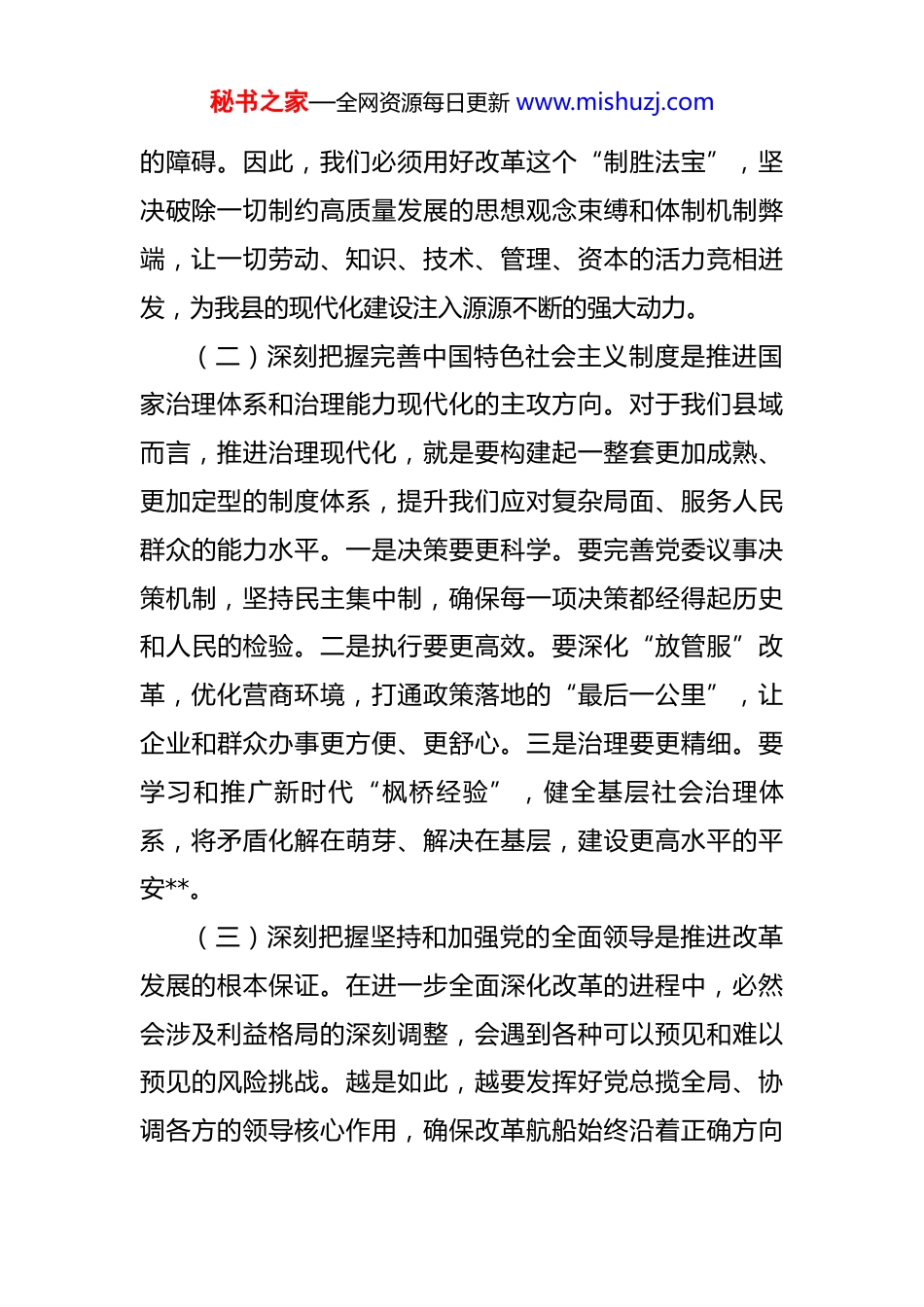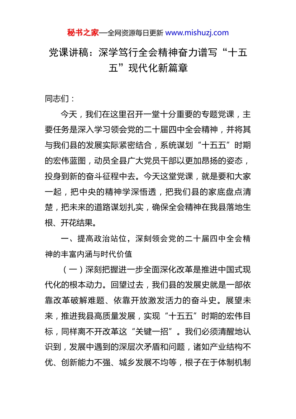 秘书之家—全网资源每日更新 www.mishuzj.com党课讲稿:深学笃行全会精神奋力谱写“十五五”现代化新篇章 同志们:今天,我们在这里召开一堂十分重要的专题党课,主要任务是深入学习领会党的二十届四中全会精神,并将其与我们县的发展实际紧密结合,系统谋划“十五五”时期的宏伟蓝图,动员全县广大党员干部以更加昂扬的姿态,投身到新的奋斗征程中去。今天这堂党课,就是要和大家一起,把中央的精神学深悟透,把我们县的家底盘点清楚,把未来的道路谋划扎实,确保全会精神在我县落地生根、开花结果。一、提高政治站位,深刻领会党的二十届四中全会精神的丰富内涵与时代价值(一)深刻把握进一步全面深化改革是推进中国式现代化的根本动力。回望过去,我们县的发展史就是一部依靠改革破解难题、依靠开放激发活力的奋斗史。展望未来,推进我县高质量发展,实现“十五五”时期的宏伟目标,同样离不开改革这“关键一招”。我们必须清醒地认识到,发展中遇到的深层次矛盾和问题,诸如产业结构不优、创新能力不强、城乡发展不均等,根子在于体制机制秘书之家—全网资源每日更新 www.mishuzj.com的障碍。因此,我们必须用好改革这个“制胜法宝”,坚决破除一切制约高质量发展的思想观念束缚和体制机制弊端,让一切劳动、知识、技术、管理、资本的活力竞相迸发,为我县的现代化建设注入源源不断的强大动力。(二)深刻把握完善中国特色社会主义制度是推进国家治理体系和治理能力现代化的主攻方向。对于我们县域而言,推进治理现代化,就是要构建起一整套更加成熟、更加定型的制度体系,提升我们应对复杂局面、服务人民群众的能力水平。一是决策要更科学。要完善党委议事决策机制,坚持民主集中制,确保每一项决策都经得起历史和人民的检验。二是执行要更高效。要深化“放管服”改革,优化营商环境,打通政策落地的“最后一公里”,让企业和群众办事更方便、更舒心。三是治理要更精细。要学习和推广新时代“枫桥经验”,健全基层社会治理体系,将矛盾化解在萌芽、解决在基层,建设更高水平的平安**。(三)深刻把握坚持和加强党的全面领导是推进改革发展的根本保证。在进一步全面深化改革的进程中,必然会涉及利益格局的深刻调整,会遇到各种可以预见和难以预见的风险挑战。越是如此,越要发挥好党总揽全局、协调各方的领导核心作用,确保改革航船始终沿着正确方向秘书之家—全网资源每日更新 www.mishuzj.com行稳致远。全县各级党组织和广大党员干部必须深刻领悟“两个确立”的决定性意义,坚决做到“两个维护”,自觉在思想上政治上行动上同以习近平同志为核心的党中央保持高度一致,确保中央的各项改革决策部署在我县不折不扣得到贯彻执行。二、坚持实事求是,准确把握我县承前启后迈向“十五五”的发展态势(一)“十四五”成就斐然,为新征程奠定了坚实基础。“十四五”以来,面对复杂严峻的外部环境和艰巨繁重的改革发展稳定任务,我们团结带领全县人民,攻坚克难,砥砺奋进,推动县域经济社会发展取得了显著成就。根据县统计局数据,截至 2024 年底,我县地区生产总值历史性突破**亿元大关,年均增长达到 6.5%;一般公共预算收入稳步增长至**亿元。我们成功引进了以新能源新材料为主导的龙头企业,战略性新兴产业产值占比稳步提升。我们大力推进乡村振兴,以**镇的现代农业产业园为例,通过“龙头企业+合作社+农户”模式,不仅带动了当地3000 多名群众稳定增收,更成为全省知名的绿色农产品供应基地。这些成绩的取得,为我们开启“十五五”新征程积累了宝贵经验,奠定了坚实基础。(二)短板挑战客观存在,对新征程提出了更高要秘书之家—全网资源每日更新 www.mishuzj.com求。在肯定成绩的同时,我们必须正视发展中的问题与不足。一是产业转型升级的步伐还不够快。传统产业占比依然偏高,新兴产业尚未形成强有力的集群效应,科技创新对经济增长的贡献率有待进一步提高。二是城乡公共服务供给仍不均衡。特别是在优质教育、高端医疗资源方面,与人民日益增长的美好生活需要相比,还存在明显差距。三是部分干部的思想观念和能力素质还不能完全适应新形势新任务的要求。少数干...