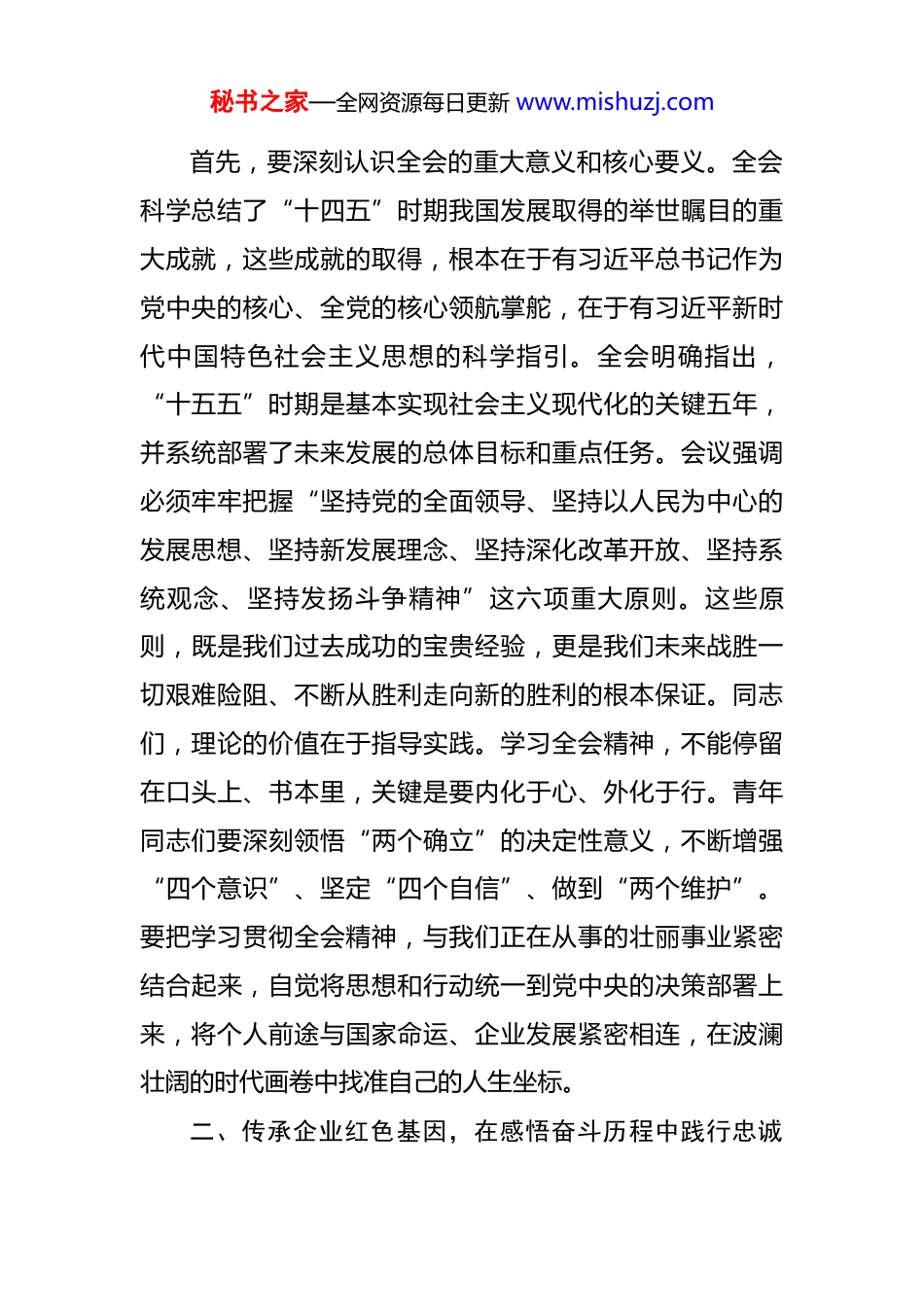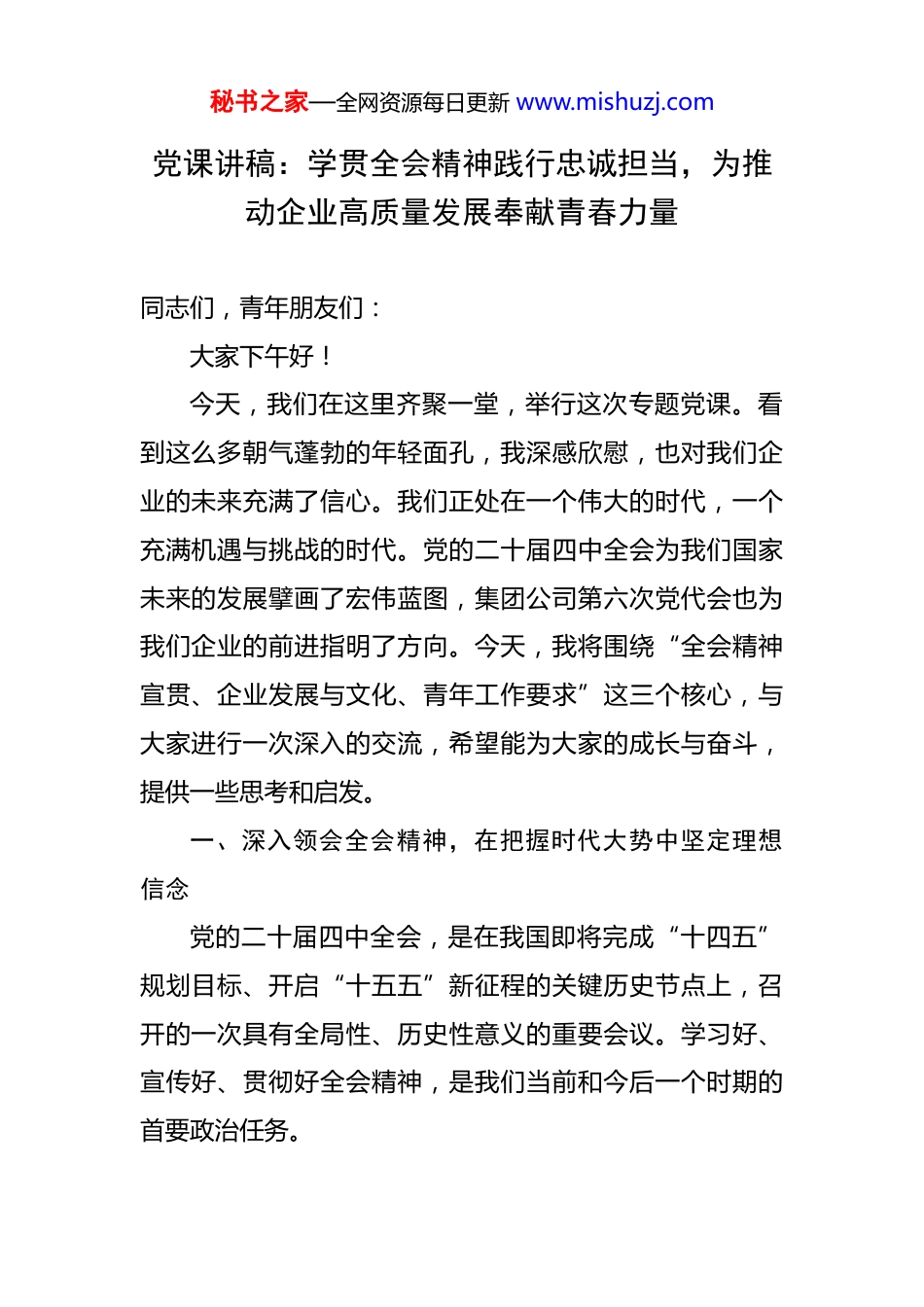 秘书之家—全网资源每日更新 www.mishuzj.com党课讲稿:学贯全会精神践行忠诚担当,为推动企业高质量发展奉献青春力量 同志们,青年朋友们:大家下午好!今天,我们在这里齐聚一堂,举行这次专题党课。看到这么多朝气蓬勃的年轻面孔,我深感欣慰,也对我们企业的未来充满了信心。我们正处在一个伟大的时代,一个充满机遇与挑战的时代。党的二十届四中全会为我们国家未来的发展擘画了宏伟蓝图,集团公司第六次党代会也为我们企业的前进指明了方向。今天,我将围绕“全会精神宣贯、企业发展与文化、青年工作要求”这三个核心,与大家进行一次深入的交流,希望能为大家的成长与奋斗,提供一些思考和启发。一、深入领会全会精神,在把握时代大势中坚定理想信念党的二十届四中全会,是在我国即将完成“十四五”规划目标、开启“十五五”新征程的关键历史节点上,召开的一次具有全局性、历史性意义的重要会议。学习好、宣传好、贯彻好全会精神,是我们当前和今后一个时期的首要政治任务。秘书之家—全网资源每日更新 www.mishuzj.com首先,要深刻认识全会的重大意义和核心要义。全会科学总结了“十四五”时期我国发展取得的举世瞩目的重大成就,这些成就的取得,根本在于有习近平总书记作为党中央的核心、全党的核心领航掌舵,在于有习近平新时代中国特色社会主义思想的科学指引。全会明确指出,“十五五”时期是基本实现社会主义现代化的关键五年,并系统部署了未来发展的总体目标和重点任务。会议强调必须牢牢把握“坚持党的全面领导、坚持以人民为中心的发展思想、坚持新发展理念、坚持深化改革开放、坚持系统观念、坚持发扬斗争精神”这六项重大原则。这些原则,既是我们过去成功的宝贵经验,更是我们未来战胜一切艰难险阻、不断从胜利走向新的胜利的根本保证。同志们,理论的价值在于指导实践。学习全会精神,不能停留在口头上、书本里,关键是要内化于心、外化于行。青年同志们要深刻领悟“两个确立”的决定性意义,不断增强“四个意识”、坚定“四个自信”、做到“两个维护”。要把学习贯彻全会精神,与我们正在从事的壮丽事业紧密结合起来,自觉将思想和行动统一到党中央的决策部署上来,将个人前途与国家命运、企业发展紧密相连,在波澜壮阔的时代画卷中找准自己的人生坐标。二、传承企业红色基因,在感悟奋斗历程中践行忠诚秘书之家—全网资源每日更新 www.mishuzj.com担当我们企业的发展史,本身就是一部践行忠诚担当、书写家国情怀的壮丽史诗。了解我们从哪里来,才能更清楚地知道我们要到哪里去。我们的根,深植于战火纷飞的年代。1940 年,在*根据地,我们的前身——一支抗日武装侦察队宣告成立。在民族危亡之际,先辈们用忠诚和热血,为民族独立和人民解放事业作出了不可磨灭的贡献。新中国成立后,我们响应党的号召,整编为光荣的铁道兵部队,成为国家铁路建设的开路先锋。在*铁路建设中,我们的前辈们“逢山开路,遇水架桥”,用生命和汗水铸就了钢铁大动脉;在艰苦卓绝的*铁路建设中,面对“地无三尺平”的艰险环境,一代代建设者栉风沐雨、战天斗地,孕育形成了伟大的“三线精神”。习近平总书记曾高度赞誉参与*铁路建设的青年们,称赞他们展现出的“忠诚担当”精神。这份至高无上的荣誉,不仅是对前辈功绩的肯定,更是镌刻在我们企业血脉中的精神底色,是代代相传的宝贵财富。改革开放的春风吹来,我们顺应时代潮流,从军队集体转改为企业。转制初期,我们面临着市场的严峻考验,经历了“找米下锅”的困境。但我们骨子里的“亮剑精神”没有丢,我们永不服输的英雄气概没有减。面对挑秘书之家—全网资源每日更新 www.mishuzj.com战,我们没有退缩,而是以“二次创业”的决心,主动融入市场经济大潮,爬坡过坎、滚石上山,最终实现了“凤凰涅槃”,企业规模、效益和综合实力均实现了跨越式发展。进入新时代,我们紧跟国家战略步伐,积极投身于高速铁路、城市轨道交通、高速公路、市政工程等一大批国家重点工程建设,创造了一项又一项骄人业绩。截至 2025 年 11 月,公司年度新签合同额已突破 520亿元,营业收入达到 450 亿元,利润总额超过 13 亿元,在...