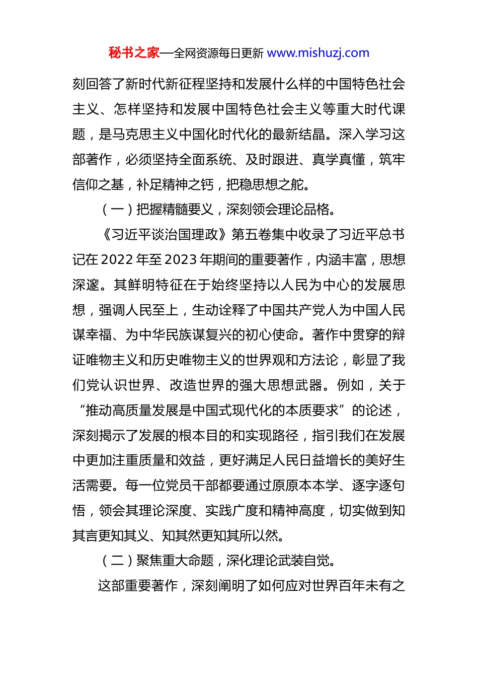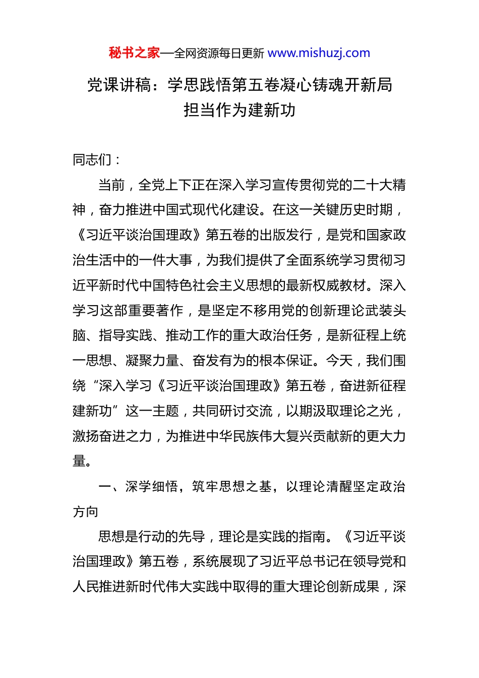 秘书之家—全网资源每日更新 www.mishuzj.com党课讲稿:学思践悟第五卷凝心铸魂开新局担当作为建新功 同志们:当前,全党上下正在深入学习宣传贯彻党的二十大精神,奋力推进中国式现代化建设。在这一关键历史时期,《习近平谈治国理政》第五卷的出版发行,是党和国家政治生活中的一件大事,为我们提供了全面系统学习贯彻习近平新时代中国特色社会主义思想的最新权威教材。深入学习这部重要著作,是坚定不移用党的创新理论武装头脑、指导实践、推动工作的重大政治任务,是新征程上统一思想、凝聚力量、奋发有为的根本保证。今天,我们围绕“深入学习《习近平谈治国理政》第五卷,奋进新征程建新功”这一主题,共同研讨交流,以期汲取理论之光,激扬奋进之力,为推进中华民族伟大复兴贡献新的更大力量。一、深学细悟,筑牢思想之基,以理论清醒坚定政治方向思想是行动的先导,理论是实践的指南。《习近平谈治国理政》第五卷,系统展现了习近平总书记在领导党和人民推进新时代伟大实践中取得的重大理论创新成果,深秘书之家—全网资源每日更新 www.mishuzj.com刻回答了新时代新征程坚持和发展什么样的中国特色社会主义、怎样坚持和发展中国特色社会主义等重大时代课题,是马克思主义中国化时代化的最新结晶。深入学习这部著作,必须坚持全面系统、及时跟进、真学真懂,筑牢信仰之基,补足精神之钙,把稳思想之舵。(一)把握精髓要义,深刻领会理论品格。《习近平谈治国理政》第五卷集中收录了习近平总书记在 2022 年至 2023 年期间的重要著作,内涵丰富,思想深邃。其鲜明特征在于始终坚持以人民为中心的发展思想,强调人民至上,生动诠释了中国共产党人为中国人民谋幸福、为中华民族谋复兴的初心使命。著作中贯穿的辩证唯物主义和历史唯物主义的世界观和方法论,彰显了我们党认识世界、改造世界的强大思想武器。例如,关于“推动高质量发展是中国式现代化的本质要求”的论述,深刻揭示了发展的根本目的和实现路径,指引我们在发展中更加注重质量和效益,更好满足人民日益增长的美好生活需要。每一位党员干部都要通过原原本本学、逐字逐句悟,领会其理论深度、实践广度和精神高度,切实做到知其言更知其义、知其然更知其所以然。(二)聚焦重大命题,深化理论武装自觉。这部重要著作,深刻阐明了如何应对世界百年未有之秘书之家—全网资源每日更新 www.mishuzj.com大变局、如何推进中国式现代化、如何以伟大自我革命引领伟大社会革命等一系列重大理论和实践问题。它不仅对中国之问、世界之问、人民之问、时代之问”给出了系统性回答,更提供了解决这些问题的中国智慧和中国方案。党的十八大以来,我国经济总量迈上百万亿元台阶,如期全面建成小康社会,历史性解决了绝对贫困问题,这一切成就的取得,正是因为有习近平新时代中国特色社会主义思想的科学指引。党员干部要结合自身工作实际,带着问题学,带着思考学,把自己摆进去、把职责摆进去、把工作摆进去,真正用党的创新理论武装头脑、指导实践、推动工作,不断提高政治判断力、政治领悟力、政治执行力。(三)汲取历史智慧,坚定历史自信和主动。《习近平谈治国理政》第五卷饱含着对历史规律的深刻洞察和对未来发展的战略谋划,深刻揭示了“两个确立”的决定性意义,强调坚持和加强党的全面领导是实现中华民族伟大复兴的根本保证。书中一系列重要论述,使我们深刻认识到,中国特色社会主义道路是历史的选择、人民的选择,是行得通、走得稳的康庄大道。在前进道路上,我们面临的风险挑战只会越来越复杂。越是面对困难,越要从党的创新理论中汲取精神力量、坚定斗争意秘书之家—全网资源每日更新 www.mishuzj.com志,以史为鉴、开创未来,增强忧患意识,保持战略定力,确保我们党在各种风浪考验面前始终成为坚强领导核心。二、笃信躬行,激发奋进之力,以实干担当回应时代召唤学之愈深,信之愈笃,行之愈坚。学习《习近平谈治国理政》第五卷的最终目的,在于将其转化为指导实践、推动工作的强大力量,在新的赶考之路上展现新担当新作为,奋力建功新时代。这要求我们必须将理论学习与实际工作紧密结合,做到学思用贯通、知...