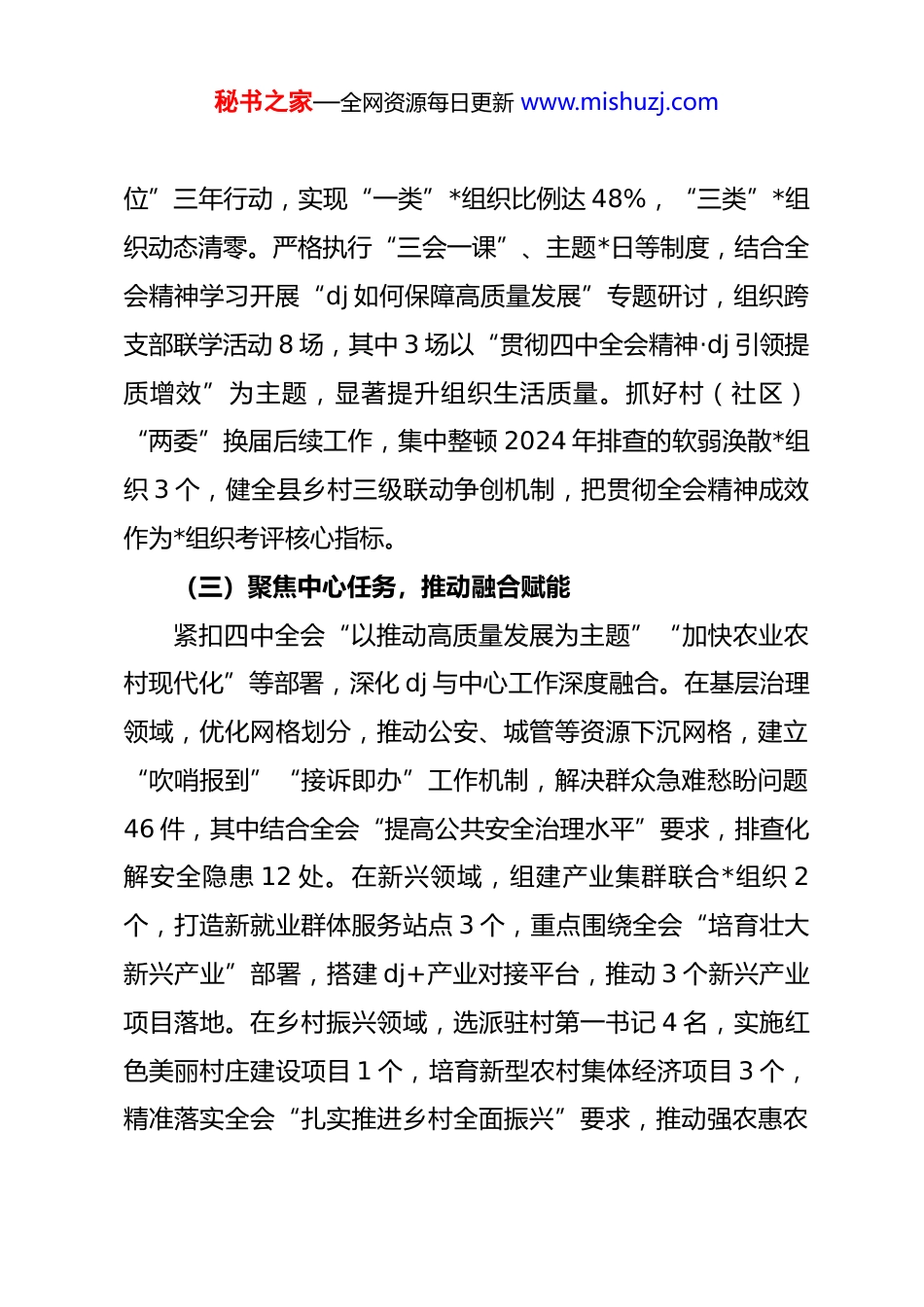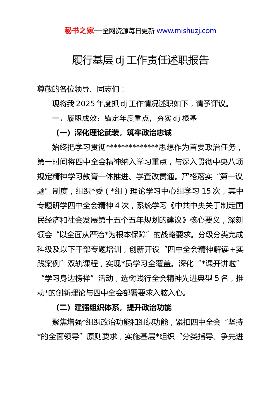 秘书之家—全网资源每日更新 www.mishuzj.com履行基层 dj 工作责任述职报告尊敬的各位领导、同志们:现将我 2025 年度抓 dj 工作情况述职如下,请予评议。一、履职成效:锚定年度重点,夯实 dj 根基(一)深化理论武装,筑牢政治忠诚始终把学习贯彻**************思想作为首要政治任务,第一时间将四中全会精神纳入学习重点,与深入贯彻中央八项规定精神学习教育一体推进、学查改贯通。严格落实“第一议题”制度,组织*委(*组)理论学习中心组学习 15 次,其中专题研学四中全会精神 4 次,系统学习《中共中央关于制定国民经济和社会发展第十五个五年规划的建议》核心要义,深刻领会“以全面从严治*为根本保障”的战略要求。分级分类完成科级及以下干部专题培训,创新开设“四中全会精神解读+实践案例”双轨课程,实现*员学习全覆盖。深化“*课开讲啦”“学习身边榜样”活动,选树践行全会精神先进典型 5 名,推动*的创新理论与四中全会部署要求入脑入心。(二)建强组织体系,提升政治功能聚焦增强*组织政治功能和组织功能,紧扣四中全会“坚持*的全面领导”原则要求,实施基层*组织“分类指导、争先进秘书之家—全网资源每日更新 www.mishuzj.com位”三年行动,实现“一类”*组织比例达 48%,“三类”*组织动态清零。严格执行“三会一课”、主题*日等制度,结合全会精神学习开展“dj 如何保障高质量发展”专题研讨,组织跨支部联学活动 8 场,其中 3 场以“贯彻四中全会精神·dj 引领提质增效”为主题,显著提升组织生活质量。抓好村(社区)“两委”换届后续工作,集中整顿 2024 年排查的软弱涣散*组织 3 个,健全县乡村三级联动争创机制,把贯彻全会精神成效作为*组织考评核心指标。(三)聚焦中心任务,推动融合赋能紧扣四中全会“以推动高质量发展为主题”“加快农业农村现代化”等部署,深化 dj 与中心工作深度融合。在基层治理领域,优化网格划分,推动公安、城管等资源下沉网格,建立“吹哨报到”“接诉即办”工作机制,解决群众急难愁盼问题46 件,其中结合全会“提高公共安全治理水平”要求,排查化解安全隐患 12 处。在新兴领域,组建产业集群联合*组织 2个,打造新就业群体服务站点 3 个,重点围绕全会“培育壮大新兴产业”部署,搭建 dj+产业对接平台,推动 3 个新兴产业项目落地。在乡村振兴领域,选派驻村第一书记 4 名,实施红色美丽村庄建设项目 1 个,培育新型农村集体经济项目 3 个,精准落实全会“扎实推进乡村全面振兴”要求,推动强农惠农秘书之家—全网资源每日更新 www.mishuzj.com富农政策落地见效。(四)从严正风肃纪,涵养清朗生态巩固拓展 dj 学习教育常态化长效化成果,以四中全会“纵深推进全面从严治*”要求为指引,开展违规吃喝、加重基层负担等专项整治,查处“四风”问题 3 起。加强廉洁文化建设,结合全会“健全国家安全体系”要求,开展“廉洁从政+风险防控”警示教育 4 次,覆盖*员干部 300 余人次,重点强化关键岗位廉政风险防控。落实基层减负要求,精简会议文件30%,清理不必要考核评比 12 项,坚决杜绝形式主义,以务实作风保障全会部署落地生根。二、存在问题:对照要求检视,正视短板不足1.理论武装深度不够,四中全会精神学习存在“温差”,部分*员对“十五五”时期发展目标与 dj 工作的内在联系把握不深,学用转化的实效性不强,对全会提出的“以全面从严治*为根本保障”研究阐释不够深入。2.组织建设不均衡,新兴领域 dj 有效覆盖仍有短板,部分基层*组织围绕全会“高质量发展”主题开展活动的思路不宽,活动形式单一,与产业升级、科技自立自强等中心工作融合不够紧密,“两张皮”问题尚未完全破解。3.队伍建设有待加强,年轻干部、新提拔干部纪律教育针秘书之家—全网资源每日更新 www.mishuzj.com对性不足,特别是结合全会“统筹教育科技人才发展”要求,*务干部与业务干部双向交流机制不健全,懂 dj、通业务的复合型人才储备不足,履职能力有待提升。4.作风建设仍需发力,个别*员干部担当作为意识不强,对照全会“积极识变应变求变,敢于斗争、善于斗争”要求...