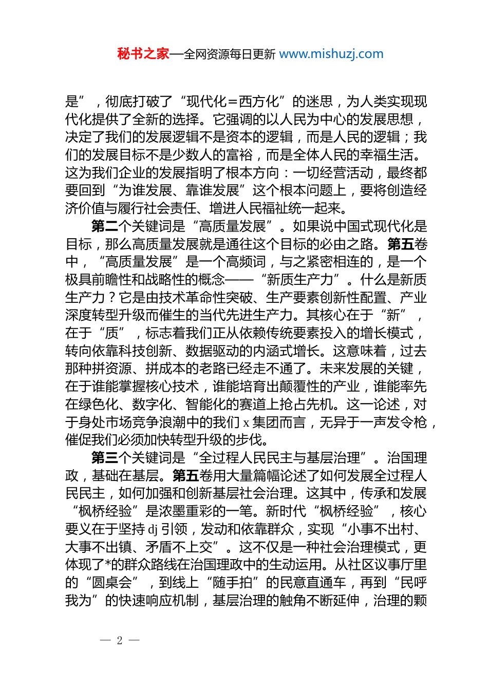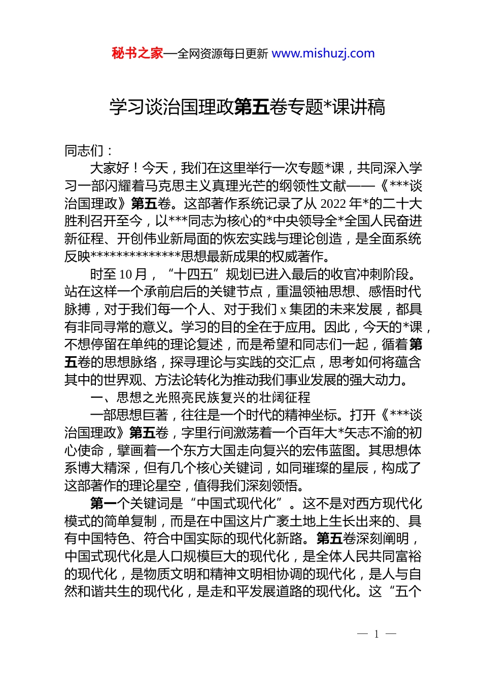 秘书之家—全网资源每日更新 www.mishuzj.com学习谈治国理政第五卷专题*课讲稿同志们:大家好!今天,我们在这里举行一次专题*课,共同深入学习一部闪耀着马克思主义真理光芒的纲领性文献——《***谈治国理政》第五卷。这部著作系统记录了从 2022 年*的二十大胜利召开至今,以***同志为核心的*中央领导全*全国人民奋进新征程、开创伟业新局面的恢宏实践与理论创造,是全面系统反映**************思想最新成果的权威著作。时至 10 月,“十四五”规划已进入最后的收官冲刺阶段。站在这样一个承前启后的关键节点,重温领袖思想、感悟时代脉搏,对于我们每一个人、对于我们 x 集团的未来发展,都具有非同寻常的意义。学习的目的全在于应用。因此,今天的*课,不想停留在单纯的理论复述,而是希望和同志们一起,循着第五卷的思想脉络,探寻理论与实践的交汇点,思考如何将蕴含其中的世界观、方法论转化为推动我们事业发展的强大动力。一、思想之光照亮民族复兴的壮阔征程一部思想巨著,往往是一个时代的精神坐标。打开《***谈治国理政》第五卷,字里行间激荡着一个百年大*矢志不渝的初心使命,擘画着一个东方大国走向复兴的宏伟蓝图。其思想体系博大精深,但有几个核心关键词,如同璀璨的星辰,构成了这部著作的理论星空,值得我们深刻领悟。第一个关键词是“中国式现代化”。这不是对西方现代化模式的简单复制,而是在中国这片广袤土地上生长出来的、具有中国特色、符合中国实际的现代化新路。第五卷深刻阐明,中国式现代化是人口规模巨大的现代化,是全体人民共同富裕的现代化,是物质文明和精神文明相协调的现代化,是人与自然和谐共生的现代化,是走和平发展道路的现代化。这“五个— 1 —秘书之家—全网资源每日更新 www.mishuzj.com是”,彻底打破了“现代化=西方化”的迷思,为人类实现现代化提供了全新的选择。它强调的以人民为中心的发展思想,决定了我们的发展逻辑不是资本的逻辑,而是人民的逻辑;我们的发展目标不是少数人的富裕,而是全体人民的幸福生活。这为我们企业的发展指明了根本方向:一切经营活动,最终都要回到“为谁发展、靠谁发展”这个根本问题上,要将创造经济价值与履行社会责任、增进人民福祉统一起来。第二个关键词是“高质量发展”。如果说中国式现代化是目标,那么高质量发展就是通往这个目标的必由之路。第五卷中,“高质量发展”是一个高频词,与之紧密相连的,是一个极具前瞻性和战略性的概念——“新质生产力”。什么是新质生产力?它是由技术革命性突破、生产要素创新性配置、产业深度转型升级而催生的当代先进生产力。其核心在于“新”,在于“质”,标志着我们正从依赖传统要素投入的增长模式,转向依靠科技创新、数据驱动的内涵式增长。这意味着,过去那种拼资源、拼成本的老路已经走不通了。未来发展的关键,在于谁能掌握核心技术,谁能培育出颠覆性的产业,谁能率先在绿色化、数字化、智能化的赛道上抢占先机。这一论述,对于身处市场竞争浪潮中的我们 x 集团而言,无异于一声发令枪,催促我们必须加快转型升级的步伐。第三个关键词是“全过程人民民主与基层治理”。治国理政,基础在基层。第五卷用大量篇幅论述了如何发展全过程人民民主,如何加强和创新基层社会治理。这其中,传承和发展“枫桥经验”是浓墨重彩的一笔。新时代“枫桥经验”,核心要义在于坚持 dj 引领,发动和依靠群众,实现“小事不出村、大事不出镇、矛盾不上交”。这不仅是一种社会治理模式,更体现了*的群众路线在治国理政中的生动运用。从社区议事厅里的“圆桌会”,到线上“随手拍”的民意直通车,再到“民呼我为”的快速响应机制,基层治理的触角不断延伸,治理的颗— 2 —秘书之家—全网资源每日更新 www.mishuzj.com粒度越来越精细。这启示我们,无论是企业管理还是社区服务,都要学会倾听,善于发动,将管理的过程变为凝聚共识、汇聚力量的过程,让每一位员工、每一位居民都成为参与者、建设者和受益者。二、实践伟力擘画可感可及的幸福图景理论的价值在于指导实践,思想的魅力在于改变世界。学习《***谈治国理政》第五卷,我们不仅要“知其然”...