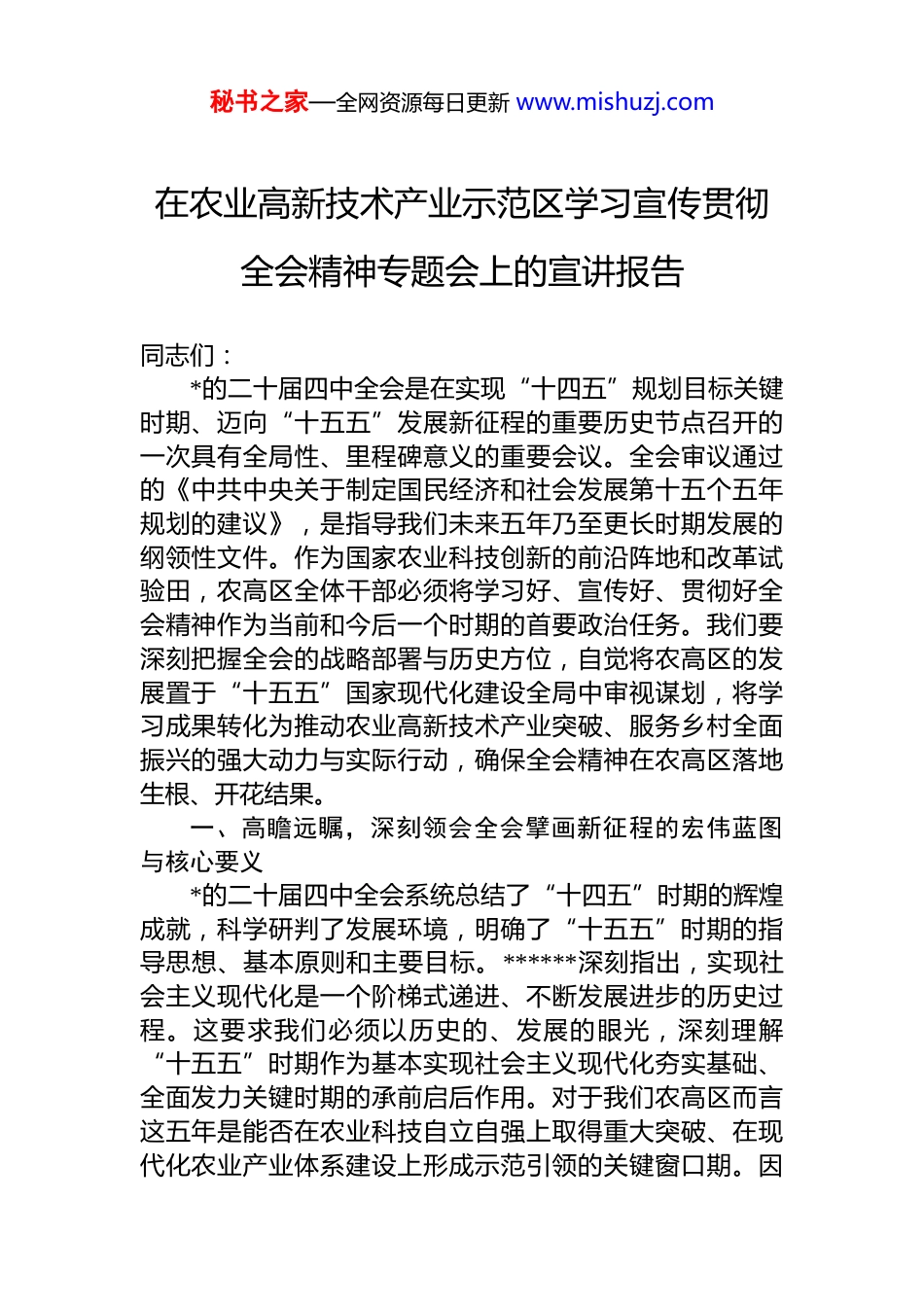 秘书之家—全网资源每日更新 www.mishuzj.com在农业高新技术产业示范区学习宣传贯彻全会精神专题会上的宣讲报告同志们:*的二十届四中全会是在实现“十四五”规划目标关键时期、迈向“十五五”发展新征程的重要历史节点召开的一次具有全局性、里程碑意义的重要会议。全会审议通过的《中共中央关于制定国民经济和社会发展第十五个五年规划的建议》,是指导我们未来五年乃至更长时期发展的纲领性文件。作为国家农业科技创新的前沿阵地和改革试验田,农高区全体干部必须将学习好、宣传好、贯彻好全会精神作为当前和今后一个时期的首要政治任务。我们要深刻把握全会的战略部署与历史方位,自觉将农高区的发展置于“十五五”国家现代化建设全局中审视谋划,将学习成果转化为推动农业高新技术产业突破、服务乡村全面振兴的强大动力与实际行动,确保全会精神在农高区落地生根、开花结果。一、高瞻远瞩,深刻领会全会擘画新征程的宏伟蓝图与核心要义*的二十届四中全会系统总结了“十四五”时期的辉煌成就,科学研判了发展环境,明确了“十五五”时期的指导思想、基本原则和主要目标。******深刻指出,实现社会主义现代化是一个阶梯式递进、不断发展进步的历史过程。这要求我们必须以历史的、发展的眼光,深刻理解“十五五”时期作为基本实现社会主义现代化夯实基础、全面发力关键时期的承前启后作用。对于我们农高区而言这五年是能否在农业科技自立自强上取得重大突破、在现代化农业产业体系建设上形成示范引领的关键窗口期。因秘书之家—全网资源每日更新 www.mishuzj.com此,首要任务在于深学细悟,精准把握全会精神蕴含的理论逻辑、历史逻辑和实践逻辑,为精准贯彻落实筑牢思想根基。(一)深刻把握“十四五”非凡成就与“十五五”历史方位,坚定发展信心与战略定力。全会高度评价了“十四五”时期我国发展取得的重大成就,这些成就是在应对世纪疫情和诸多风险挑战中取得的,极不寻常、极不平凡为我国经济社会持续健康发展奠定了坚实基础。这充分印证了*中央决策部署的科学性、预见性,彰显了中国特色社会主义制度的显著优势。全会同时指出,“十五五”时期我国发展环境面临深刻复杂变化,战略机遇和风险挑战并存。我们必须清醒认识到,外部环境的不确定性增多与国内改革发展稳定任务的艰巨性并存。然而,我国经济基础稳、优势多、韧性强、潜能大,长期向好的支撑条件和基本趋势没有变。具体到农高区,我们的信心来源于国家坚定不移推进农业强国建设的战略决心,来源于科技革命与产业变革为农业带来的历史性机遇,更来源于我们多年来在特色产业培育、创新平台搭建、人才资源聚集等方面积累的独特优势。面对新形势,全体干部必须保持战略定力增强必胜信心,发扬历史主动精神,积极识变应变求变,集中力量办好农高区自己的事。我们要将思想和行动统一到*中央对形势的科学判断上来,既看到风险挑战,做好应对预案,更看到光明前景,把握战略主动。要善于从国家发展全局中找准农高区的定位,将国家超大规模市场优势完整产业体系优势转化为农高区科技成果转化和产业升级的具体动能。要坚定贯彻新发展理念,决不因暂时的困难而动摇高质量发展的决心,而是要将压力转化为深化改革推动创新的动力,在“十五五”这个关键时期展现农高区的担当作为。(二)精准锚定“十五五”核心目标与基本原则,把准发展方向与行动遵循。全会提出了“十五五”时期经济秘书之家—全网资源每日更新 www.mishuzj.com社会发展的七大主要目标,涵盖高质量发展、科技自立自强、深化改革、社会文明、人民生活、美丽中国、国家安全等方方面面。这七大目标相互关联、有机统一,构成了“十五五”发展的全景图。同时,全会明确了必须遵循的六项基本原则:坚持*的全面领导、坚持人民至上、坚持高质量发展、坚持全面深化改革、坚持有效市场和有为政府相结合、坚持统筹发展和安全。这六项原则是改革开放以来特别是新时代宝贵经验的科学总结,是确保“十五五”发展行稳致远的根本保证。对农高区工作而言,这七大目标和六项原则就是我们一切工作的“指挥棒”和“坐标系”。我们必须将“高质量发展取得显著成效”和“科技自立自...