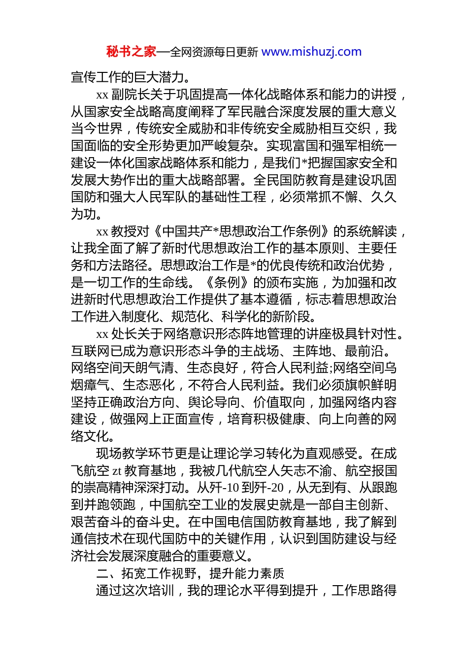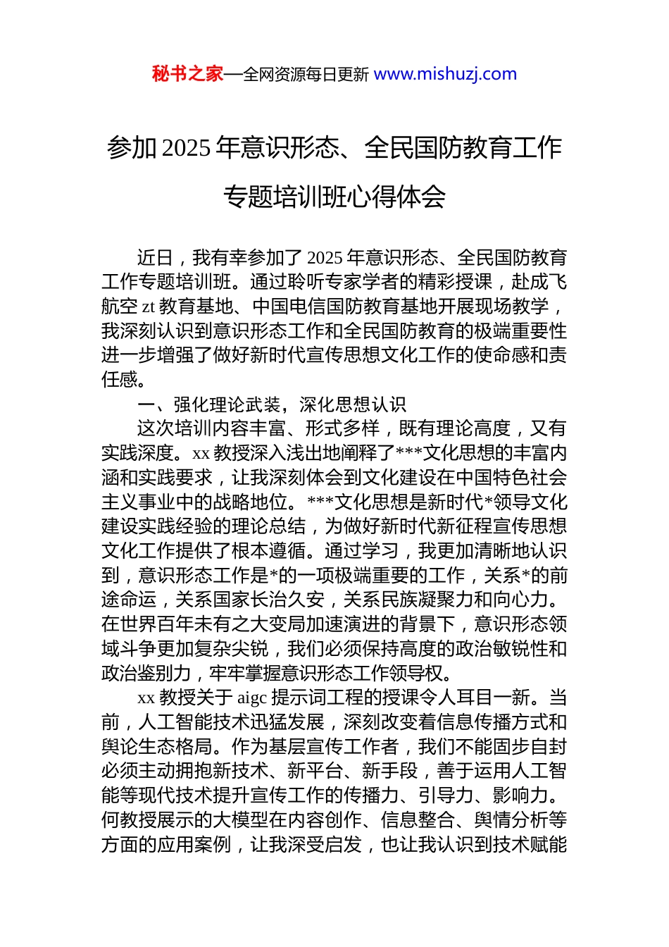 秘书之家—全网资源每日更新 www.mishuzj.com参加 2025 年意识形态、全民国防教育工作专题培训班心得体会近日,我有幸参加了 2025 年意识形态、全民国防教育工作专题培训班。通过聆听专家学者的精彩授课,赴成飞航空 zt 教育基地、中国电信国防教育基地开展现场教学,我深刻认识到意识形态工作和全民国防教育的极端重要性进一步增强了做好新时代宣传思想文化工作的使命感和责任感。一、强化理论武装,深化思想认识这次培训内容丰富、形式多样,既有理论高度,又有实践深度。xx 教授深入浅出地阐释了***文化思想的丰富内涵和实践要求,让我深刻体会到文化建设在中国特色社会主义事业中的战略地位。***文化思想是新时代*领导文化建设实践经验的理论总结,为做好新时代新征程宣传思想文化工作提供了根本遵循。通过学习,我更加清晰地认识到,意识形态工作是*的一项极端重要的工作,关系*的前途命运,关系国家长治久安,关系民族凝聚力和向心力。在世界百年未有之大变局加速演进的背景下,意识形态领域斗争更加复杂尖锐,我们必须保持高度的政治敏锐性和政治鉴别力,牢牢掌握意识形态工作领导权。xx 教授关于 aigc 提示词工程的授课令人耳目一新。当前,人工智能技术迅猛发展,深刻改变着信息传播方式和舆论生态格局。作为基层宣传工作者,我们不能固步自封必须主动拥抱新技术、新平台、新手段,善于运用人工智能等现代技术提升宣传工作的传播力、引导力、影响力。何教授展示的大模型在内容创作、信息整合、舆情分析等方面的应用案例,让我深受启发,也让我认识到技术赋能秘书之家—全网资源每日更新 www.mishuzj.com宣传工作的巨大潜力。xx 副院长关于巩固提高一体化战略体系和能力的讲授,从国家安全战略高度阐释了军民融合深度发展的重大意义当今世界,传统安全威胁和非传统安全威胁相互交织,我国面临的安全形势更加严峻复杂。实现富国和强军相统一建设一体化国家战略体系和能力,是我们*把握国家安全和发展大势作出的重大战略部署。全民国防教育是建设巩固国防和强大人民军队的基础性工程,必须常抓不懈、久久为功。xx 教授对《中国共产*思想政治工作条例》的系统解读,让我全面了解了新时代思想政治工作的基本原则、主要任务和方法路径。思想政治工作是*的优良传统和政治优势,是一切工作的生命线。《条例》的颁布实施,为加强和改进新时代思想政治工作提供了基本遵循,标志着思想政治工作进入制度化、规范化、科学化的新阶段。xx 处长关于网络意识形态阵地管理的讲座极具针对性。互联网已成为意识形态斗争的主战场、主阵地、最前沿。网络空间天朗气清、生态良好,符合人民利益;网络空间乌烟瘴气、生态恶化,不符合人民利益。我们必须旗帜鲜明坚持正确政治方向、舆论导向、价值取向,加强网络内容建设,做强网上正面宣传,培育积极健康、向上向善的网络文化。现场教学环节更是让理论学习转化为直观感受。在成飞航空 zt 教育基地,我被几代航空人矢志不渝、航空报国的崇高精神深深打动。从歼-10 到歼-20,从无到有、从跟跑到并跑领跑,中国航空工业的发展史就是一部自主创新、艰苦奋斗的奋斗史。在中国电信国防教育基地,我了解到通信技术在现代国防中的关键作用,认识到国防建设与经济社会发展深度融合的重要意义。二、拓宽工作视野,提升能力素质通过这次培训,我的理论水平得到提升,工作思路得秘书之家—全网资源每日更新 www.mishuzj.com以拓展,能力素质有了新的增强。一是思想认识有了新高度。我更加深刻地理解了“两个确立”的决定性意义,更加自觉地增强“四个意识”、坚定“四个自信”、做到“两个维护”。意识形态工作和国防教育工作都是政治性极强的工作,必须始终坚持*的全面领导,坚持以**************思想为指导,确保工作始终沿着正确政治方向前进。作为*办工作人员,我要始终保持清醒的政治头脑,善于从政治上看问题,在大是大非面前旗帜鲜明,在风浪考验面前无所畏惧,在各种诱惑面前立场坚定。二是专业素养有了新提升。培训涵盖了理论阐释、技术应用、政策解读、案例分析等多个维度,既有宏观层面的战略思考,又有微观层面的实践指导。我学...