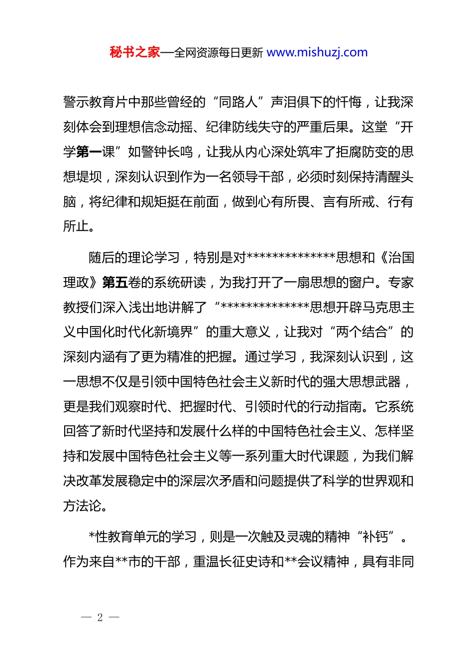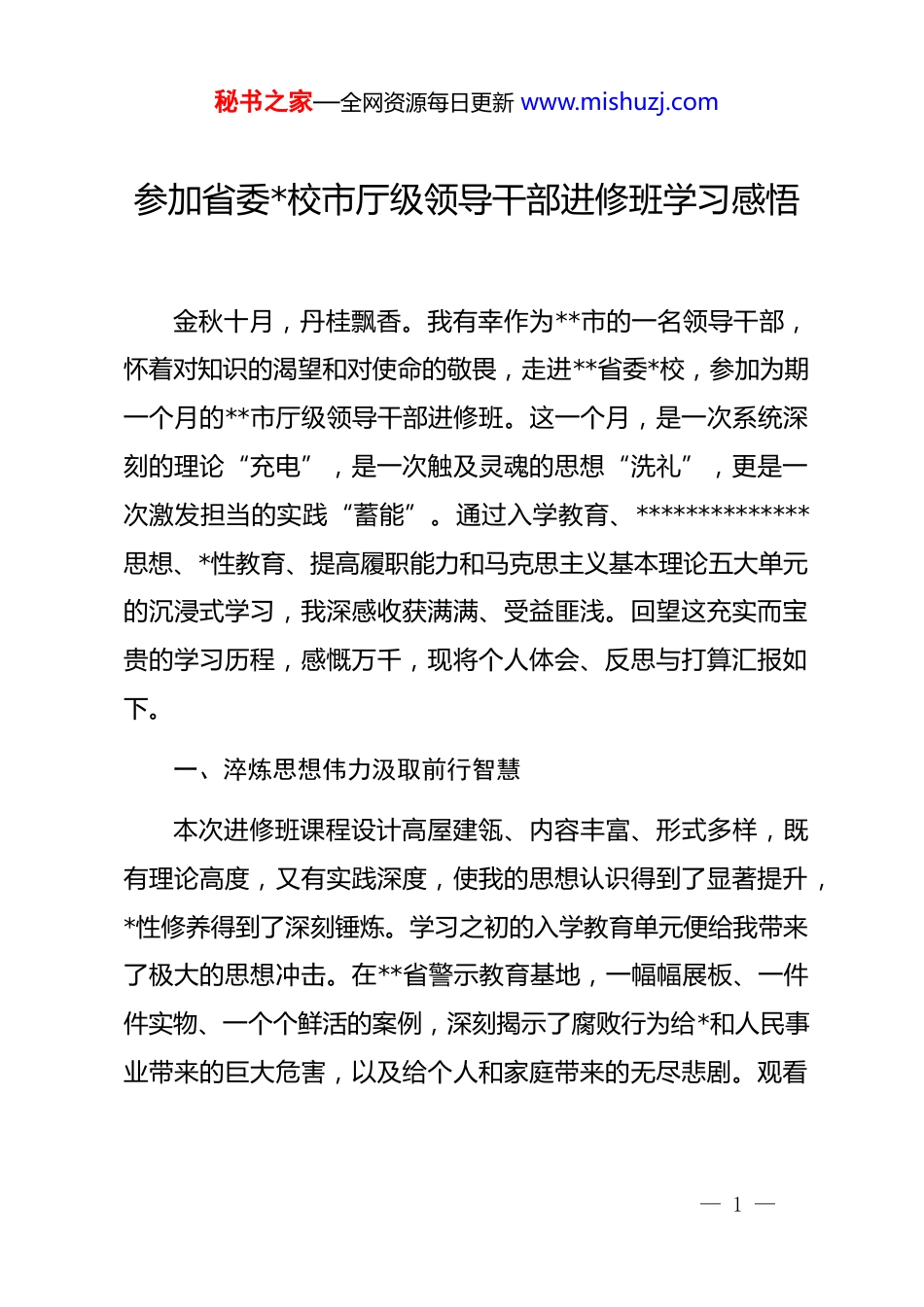 秘书之家—全网资源每日更新 www.mishuzj.com参加省委*校市厅级领导干部进修班学习感悟金秋十月,丹桂飘香。我有幸作为**市的一名领导干部,怀着对知识的渴望和对使命的敬畏,走进**省委*校,参加为期一个月的**市厅级领导干部进修班。这一个月,是一次系统深刻的理论“充电”,是一次触及灵魂的思想“洗礼”,更是一次激发担当的实践“蓄能”。通过入学教育、**************思想、*性教育、提高履职能力和马克思主义基本理论五大单元的沉浸式学习,我深感收获满满、受益匪浅。回望这充实而宝贵的学习历程,感慨万千,现将个人体会、反思与打算汇报如下。一、淬炼思想伟力汲取前行智慧本次进修班课程设计高屋建瓴、内容丰富、形式多样,既有理论高度,又有实践深度,使我的思想认识得到了显著提升,*性修养得到了深刻锤炼。学习之初的入学教育单元便给我带来了极大的思想冲击。在**省警示教育基地,一幅幅展板、一件件实物、一个个鲜活的案例,深刻揭示了腐败行为给*和人民事业带来的巨大危害,以及给个人和家庭带来的无尽悲剧。观看— 1 —秘书之家—全网资源每日更新 www.mishuzj.com警示教育片中那些曾经的“同路人”声泪俱下的忏悔,让我深刻体会到理想信念动摇、纪律防线失守的严重后果。这堂“开学第一课”如警钟长鸣,让我从内心深处筑牢了拒腐防变的思想堤坝,深刻认识到作为一名领导干部,必须时刻保持清醒头脑,将纪律和规矩挺在前面,做到心有所畏、言有所戒、行有所止。随后的理论学习,特别是对**************思想和《治国理政》第五卷的系统研读,为我打开了一扇思想的窗户。专家教授们深入浅出地讲解了“**************思想开辟马克思主义中国化时代化新境界”的重大意义,让我对“两个结合”的深刻内涵有了更为精准的把握。通过学习,我深刻认识到,这一思想不仅是引领中国特色社会主义新时代的强大思想武器,更是我们观察时代、把握时代、引领时代的行动指南。它系统回答了新时代坚持和发展什么样的中国特色社会主义、怎样坚持和发展中国特色社会主义等一系列重大时代课题,为我们解决改革发展稳定中的深层次矛盾和问题提供了科学的世界观和方法论。*性教育单元的学习,则是一次触及灵魂的精神“补钙”。作为来自**市的干部,重温长征史诗和**会议精神,具有非同— 2 —秘书之家—全网资源每日更新 www.mishuzj.com寻常的意义。通过现场教学,我们仿佛“穿越”时空,回到了那个战火纷飞的年代,在**会议会址前,我们重温入*誓词,深刻感悟老一辈革命家在危急关头实事求是、敢于斗争、独立自主挽救革命的伟大创举。这种沉浸式的*性教育,远比书本上的文字描述来得真切、震撼。它让我深刻理解了“坚定信念、坚持真理、独立自主、团结统一”的**会议精神的时代价值。这不仅是对历史的缅怀,更是对初心的叩问,让我从红色基因中汲取了源源不断的奋进力量,更加坚定了为人民服务的根本宗旨。二、躬身自省笃行知行合一求实学习的目的全在于应用。通过一个月的深入学习和反思,我对照先进理论、对照*章*规、对照身边榜样,深刻检视了自身在思想、工作、作风等方面存在的差距和不足。首先,在理论联系实际上存在“温差”。过去,虽然也重视理论学习,但有时满足于“学过了”“知道了”,对于如何运用马克思主义的立场、观点、方法来分析和解决**市经济社会发展中的具体问题,思考得不够深入,行动上不够有力。比如,在推动传统产业转型升级和培育壮大新兴产业方面,虽然认识到其重要性,但在运用新发展理念,特别是将创新、协调、— 3 —秘书之家—全网资源每日更新 www.mishuzj.com绿色、开放、共享的发展理念完整、准确、全面地贯彻到项目谋划、政策制定和工作推进的全过程中,还存在一定的惯性思维和路径依赖。此次马克思主义基本理论单元的学习,让我重新认识到,只有真正掌握了辩证唯物主义和历史唯物主义这个“看家本领”,才能在复杂多变的形势面前保持战略定力,找到破解难题的“金钥匙”。其次,在深入基层调查研究上存在“偏差”。提高履职能力单元的课程,特别强调了调查研究的重要性,提倡“蹲下去看蚂蚁”的求实作风。反思自身,虽然也经常下基层...