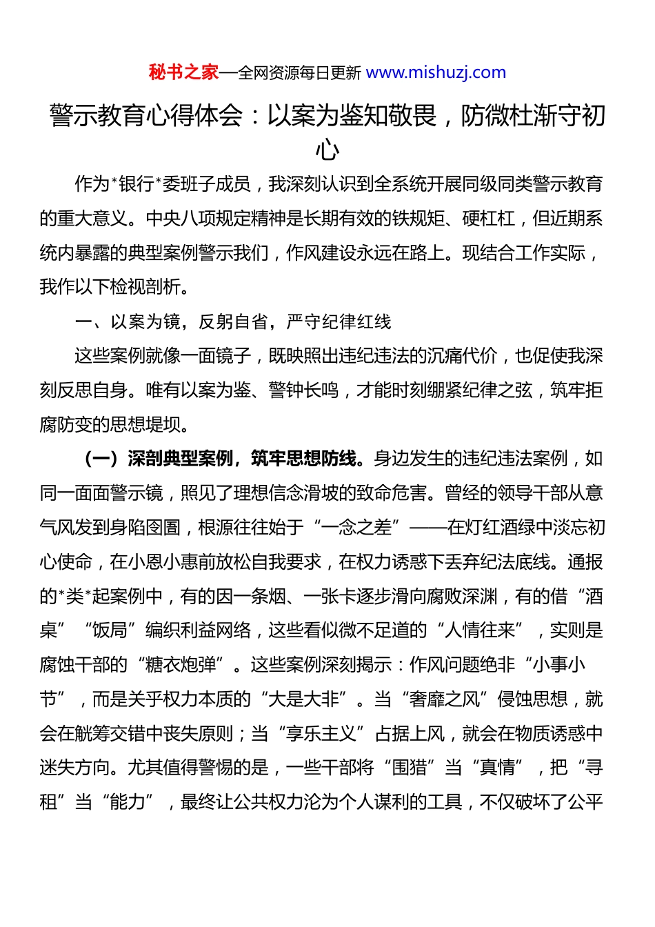 秘书之家—全网资源每日更新 www.mishuzj.com警示教育心得体会:以案为鉴知敬畏,防微杜渐守初心作为*银行*委班子成员,我深刻认识到全系统开展同级同类警示教育的重大意义。中央八项规定精神是长期有效的铁规矩、硬杠杠,但近期系统内暴露的典型案例警示我们,作风建设永远在路上。现结合工作实际,我作以下检视剖析。一、以案为镜,反躬自省,严守纪律红线这些案例就像一面镜子,既映照出违纪违法的沉痛代价,也促使我深刻反思自身。唯有以案为鉴、警钟长鸣,才能时刻绷紧纪律之弦,筑牢拒腐防变的思想堤坝。(一)深剖典型案例,筑牢思想防线。身边发生的违纪违法案例,如同一面面警示镜,照见了理想信念滑坡的致命危害。曾经的领导干部从意气风发到身陷囹圄,根源往往始于“一念之差”——在灯红酒绿中淡忘初心使命,在小恩小惠前放松自我要求,在权力诱惑下丢弃纪法底线。通报的*类*起案例中,有的因一条烟、一张卡逐步滑向腐败深渊,有的借“酒桌”“饭局”编织利益网络,这些看似微不足道的“人情往来”,实则是腐蚀干部的“糖衣炮弹”。这些案例深刻揭示:作风问题绝非“小事小节”,而是关乎权力本质的“大是大非”。当“奢靡之风”侵蚀思想,就会在觥筹交错中丧失原则;当“享乐主义”占据上风,就会在物质诱惑中迷失方向。尤其值得警惕的是,一些干部将“围猎”当“真情”,把“寻租”当“能力”,最终让公共权力沦为个人谋利的工具,不仅破坏了公平秘书之家—全网资源每日更新 www.mishuzj.com公正的社会生态,更严重损害了*和政府的公信力。深入剖析这些案例,就是要让每一名*员干部看清“小错酿大祸”的演变逻辑,从思想深处筑牢“不敢腐、不能腐、不想腐”的防线。(二)破除错误认知,严守纪律红线。作风建设的最大障碍,往往是思想上的“不以为然”。当前,仍有少数干部存在“吃吃喝喝无伤大雅”“行业特殊可以例外”等错误观念,将中央八项规定精神视为“一阵风”,把纪律红线当作“稻草人”。这种认知偏差,正是“四风”问题屡禁不止的重要原因。******反复强调“作风建设永远在路上”,就是要警示全*:“四风”问题具有顽固性、反复性,稍有松懈就会卷土重来。违规吃喝、收送礼品礼金等行为,看似是“生活作风”问题,实则是权力异化的开端。从近年查处案例看,80%以上的腐败案件都与违规吃喝、利益输送相关,“酒桌”往往成为权钱交易的“遮羞布”,“人情往来”常常是权力寻租的“幌子”。尤其在婚丧喜庆等事宜中,一些干部借“礼尚往来”之名行敛财之实,不仅败坏社会风气,更触碰纪律红线。必须清醒认识到:作风问题无小事,纪律红线不可破。要通过常态化警示教育,让*员干部摒弃“侥幸心理”“特权思想”,树立正确的亲情观、交往观、义利观,在任何时候都做到知敬畏、存戒惧、守底线。(三)强化制度约束,构建长效机制。作风建设既要靠教育引导,更要靠制度保障。要针对典型案例暴露的漏洞,扎紧制度笼子,让“四风”问题无机可乘。一方面,要细化监督清单,将“违规收送礼品礼金”“违规吃喝”“大操大办婚丧喜庆”等行为纳入重点监督范围,明确禁止性规秘书之家—全网资源每日更新 www.mishuzj.com定和惩戒措施。例如,对公务接待实行“清单化管理”,注明接待对象、事由、标准等信息,杜绝“模糊账单”;对婚丧喜庆事宜推行“双报告”制度,既报告操办规模,也报告礼金收受情况,严防“化整为零”“分批操办”等规避行为。另一方面,要健全监督体系,形成“日常监督+专项检查+群众监督”的立体网络。发挥纪检监察机关的专责作用,运用大数据手段排查“异常消费”“频繁转账”等可疑线索;畅通群众举报渠道,通过“随手拍”“一键举报”等方式,让“隐形‘四风’”无处遁形。同时,强化制度执行力,对违反作风纪律的行为“零容忍”,发现一起、查处一起、通报一起,让纪律真正成为“带电的高压线”。只有将制度约束转化为行为自觉,将外在要求内化为价值追求,才能从根本上铲除“四风”滋生的土壤,推动作风建设不断走向深入。二、坚定立场,对照反思,筑牢思想根基这些典型违纪违法案例充分发挥了警示教育“正衣镜”和“提醒铃”的作用,特别是在...