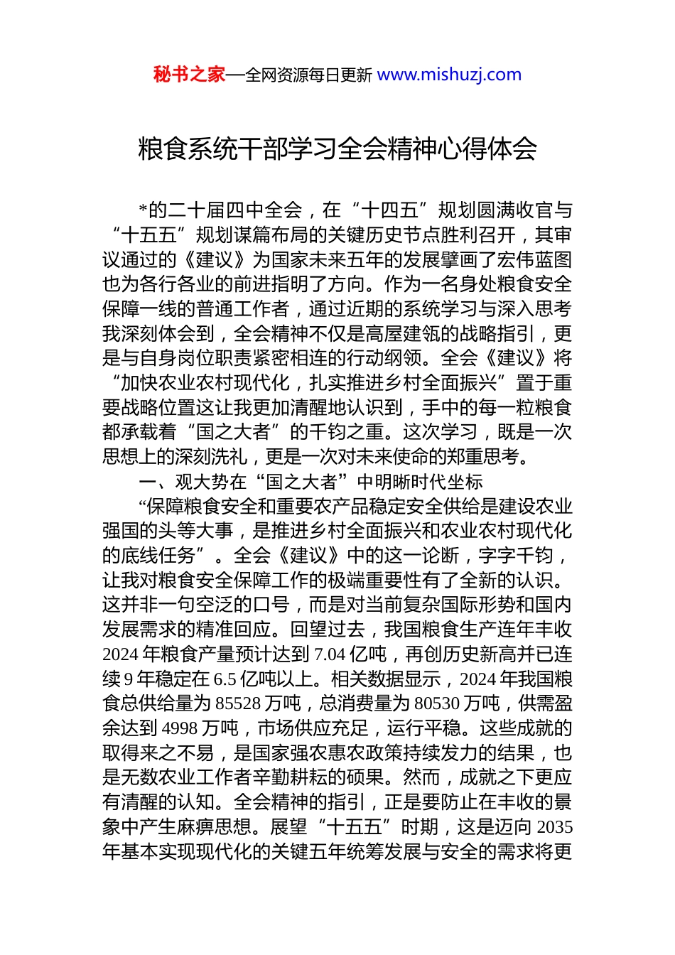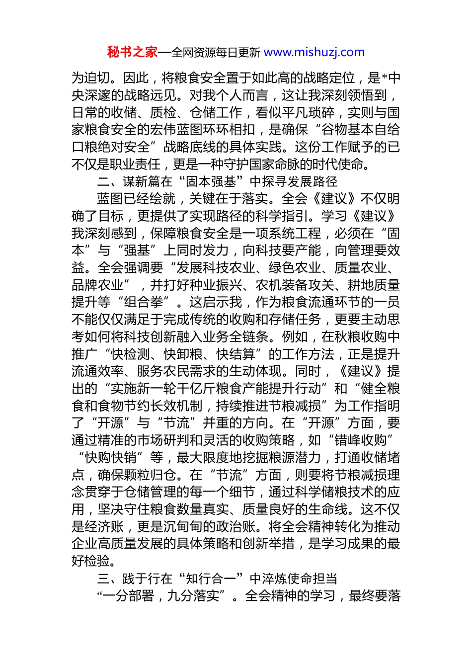 秘书之家—全网资源每日更新 www.mishuzj.com粮食系统干部学习全会精神心得体会*的二十届四中全会,在“十四五”规划圆满收官与“十五五”规划谋篇布局的关键历史节点胜利召开,其审议通过的《建议》为国家未来五年的发展擘画了宏伟蓝图也为各行各业的前进指明了方向。作为一名身处粮食安全保障一线的普通工作者,通过近期的系统学习与深入思考我深刻体会到,全会精神不仅是高屋建瓴的战略指引,更是与自身岗位职责紧密相连的行动纲领。全会《建议》将“加快农业农村现代化,扎实推进乡村全面振兴”置于重要战略位置这让我更加清醒地认识到,手中的每一粒粮食都承载着“国之大者”的千钧之重。这次学习,既是一次思想上的深刻洗礼,更是一次对未来使命的郑重思考。一、观大势在“国之大者”中明晰时代坐标“保障粮食安全和重要农产品稳定安全供给是建设农业强国的头等大事,是推进乡村全面振兴和农业农村现代化的底线任务”。全会《建议》中的这一论断,字字千钧,让我对粮食安全保障工作的极端重要性有了全新的认识。这并非一句空泛的口号,而是对当前复杂国际形势和国内发展需求的精准回应。回望过去,我国粮食生产连年丰收2024 年粮食产量预计达到 7.04 亿吨,再创历史新高并已连续 9 年稳定在 6.5 亿吨以上。相关数据显示,2024 年我国粮食总供给量为 85528 万吨,总消费量为 80530 万吨,供需盈余达到 4998 万吨,市场供应充足,运行平稳。这些成就的取得来之不易,是国家强农惠农政策持续发力的结果,也是无数农业工作者辛勤耕耘的硕果。然而,成就之下更应有清醒的认知。全会精神的指引,正是要防止在丰收的景象中产生麻痹思想。展望“十五五”时期,这是迈向 2035年基本实现现代化的关键五年统筹发展与安全的需求将更秘书之家—全网资源每日更新 www.mishuzj.com为迫切。因此,将粮食安全置于如此高的战略定位,是*中央深邃的战略远见。对我个人而言,这让我深刻领悟到,日常的收储、质检、仓储工作,看似平凡琐碎,实则与国家粮食安全的宏伟蓝图环环相扣,是确保“谷物基本自给口粮绝对安全”战略底线的具体实践。这份工作赋予的已不仅是职业责任,更是一种守护国家命脉的时代使命。二、谋新篇在“固本强基”中探寻发展路径蓝图已经绘就,关键在于落实。全会《建议》不仅明确了目标,更提供了实现路径的科学指引。学习《建议》我深刻感到,保障粮食安全是一项系统工程,必须在“固本”与“强基”上同时发力,向科技要产能,向管理要效益。全会强调要“发展科技农业、绿色农业、质量农业、品牌农业”,并打好种业振兴、农机装备攻关、耕地质量提升等“组合拳”。这启示我,作为粮食流通环节的一员不能仅仅满足于完成传统的收购和存储任务,更要主动思考如何将科技创新融入业务全链条。例如,在秋粮收购中推广“快检测、快卸粮、快结算”的工作方法,正是提升流通效率、服务农民需求的生动体现。同时,《建议》提出的“实施新一轮千亿斤粮食产能提升行动”和“健全粮食和食物节约长效机制,持续推进节粮减损”为工作指明了“开源”与“节流”并重的方向。在“开源”方面,要通过精准的市场研判和灵活的收购策略,如“错峰收购”“快购快销”等,最大限度地挖掘粮源潜力,打通收储堵点,确保颗粒归仓。在“节流”方面,则要将节粮减损理念贯穿于仓储管理的每一个细节,通过科学储粮技术的应用,坚决守住粮食数量真实、质量良好的生命线。这不仅是经济账,更是沉甸甸的政治账。将全会精神转化为推动企业高质量发展的具体策略和创新举措,是学习成果的最好检验。三、践于行在“知行合一”中淬炼使命担当“一分部署,九分落实”。全会精神的学习,最终要落秘书之家—全网资源每日更新 www.mishuzj.com脚于实践,体现于担当。理论的深度决定着实践的高度,只有将所学所思内化于心、外化于行,才能真正做到“知信行统一”。在学习过程中,我被基层一线同事们的实干精神深深触动。无论是面对连续阴雨天气、日夜坚守岗位的“秋收突击队”,还是为缓解农户燃眉之急而主动延长服务至深夜的仓储人员,他们用脚步丈量责任,用汗水诠释担当,让农民交售“明白粮”“放...