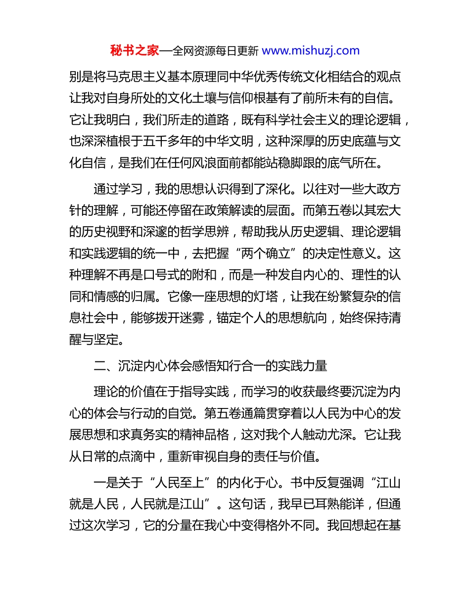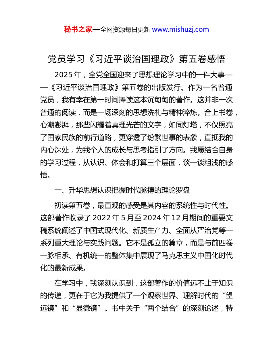 秘书之家—全网资源每日更新 www.mishuzj.com党员学习《习近平谈治国理政》第五卷感悟2025 年,全党全国迎来了思想理论学习中的一件大事——《习近平谈治国理政》第五卷的出版发行。作为一名普通党员,我有幸在第一时间捧读这本沉甸甸的著作。这并非一次普通的阅读,而是一场深刻的思想洗礼与精神淬炼。合上书卷,心潮澎湃,那些闪耀着真理光芒的文字,如同灯塔,不仅照亮了国家民族的前行道路,更穿透了纷繁世事的表象,直抵我的内心深处,为我个人的成长与思考指引了方向。我愿结合自身的学习过程,从认识、体会和打算三个层面,谈一谈粗浅的感悟。一、升华思想认识把握时代脉搏的理论罗盘初读第五卷,最直观的感受是其内容的系统性与时代性。这部著作收录了 2022 年 5 月至 2024 年 12 月期间的重要文稿系统阐述了中国式现代化、新质生产力、全面从严治党等一系列重大理论与实践问题。它不是孤立的篇章,而是与前四卷一脉相承、有机统一的整体集中展现了马克思主义中国化时代化的最新成果。在学习中,我深刻认识到,这部著作的价值远不止于知识的传递,更在于它为我提供了一个观察世界、理解时代的“望远镜”和“显微镜”。书中关于“两个结合”的深刻论述,特秘书之家—全网资源每日更新 www.mishuzj.com别是将马克思主义基本原理同中华优秀传统文化相结合的观点让我对自身所处的文化土壤与信仰根基有了前所未有的自信。它让我明白,我们所走的道路,既有科学社会主义的理论逻辑,也深深植根于五千多年的中华文明,这种深厚的历史底蕴与文化自信,是我们在任何风浪面前都能站稳脚跟的底气所在。通过学习,我的思想认识得到了深化。以往对一些大政方针的理解,可能还停留在政策解读的层面。而第五卷以其宏大的历史视野和深邃的哲学思辨,帮助我从历史逻辑、理论逻辑和实践逻辑的统一中,去把握“两个确立”的决定性意义。这种理解不再是口号式的附和,而是一种发自内心的、理性的认同和情感的归属。它像一座思想的灯塔,让我在纷繁复杂的信息社会中,能够拨开迷雾,锚定个人的思想航向,始终保持清醒与坚定。二、沉淀内心体会感悟知行合一的实践力量理论的价值在于指导实践,而学习的收获最终要沉淀为内心的体会与行动的自觉。第五卷通篇贯穿着以人民为中心的发展思想和求真务实的精神品格,这对我个人触动尤深。它让我从日常的点滴中,重新审视自身的责任与价值。一是关于“人民至上”的内化于心。书中反复强调“江山就是人民,人民就是江山”。这句话,我早已耳熟能详,但通过这次学习,它的分量在我心中变得格外不同。我回想起在基秘书之家—全网资源每日更新 www.mishuzj.com层单位参与志愿服务时的一次经历。当时,我与一位年迈的**阿姨交谈,她反复提及的,并非什么宏大的叙事,而是小区里一盏路灯忽明忽暗给她夜间出行带来的不便。那一刻,书中的理论与现实的场景瞬间重合。我体会到,宏伟的“国之大者”,最终都落实在一件件这样的“民生小事”上。推动解决这些群众的“急难愁盼”,不是一项需要刻意完成的工作任务,而是一种源于同理心与责任感的本能驱使。学习第五卷,让我更加深刻地体会到,只有真正把群众的安危冷暖放在心上,用脚步丈量民情,用真心倾听民意,才能让理论的温度真正传递到群众的心坎里,让自己的工作与生活更有价值和意义。二是关于“实干担当”的自我鞭策。第五卷彰显的“问题导向”和“系统观念”,以及“时时放心不下”的责任感,深深地激励着我。这让我反思,在日常的工作和生活中,是否存在眼高手低、抓不住关键的现象。书中求真务实、锐意进取的精神,像一面镜子,照出了我思想和行动上的不足。例如,在今年夏季持续高温天气下,我看到许多一线工作者不畏酷暑,深入田间地头,细致核查惠农政策的落实情况。他们的身影,正是对“实干担当”最生动的诠释。这让我感悟到,真正的成长,不在于说了多少豪言壮语,而在于能否在平凡的岗位上,以一种严谨细致、极端负责的态度,把每一件小事做好、做实。这种精神激励着我,要将学习的热情转化为一种内在的品格,秘书之家—全网资源每日更新 www.mishuzj.com一种“时时放心不下”的责任...