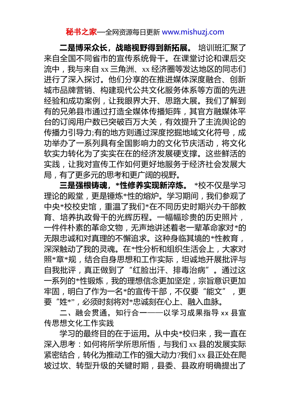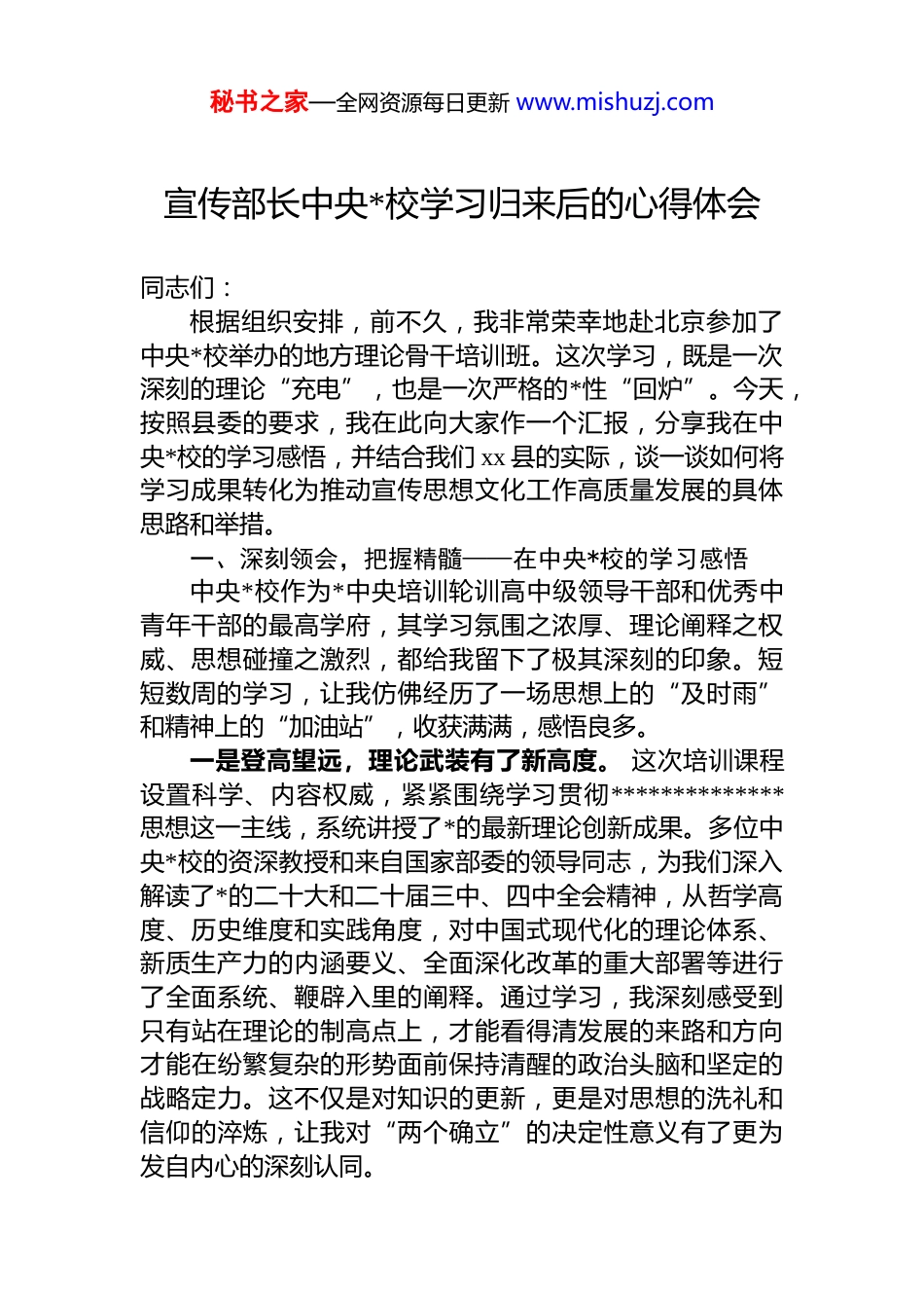 秘书之家—全网资源每日更新 www.mishuzj.com宣传部长中央*校学习归来后的心得体会同志们:根据组织安排,前不久,我非常荣幸地赴北京参加了中央*校举办的地方理论骨干培训班。这次学习,既是一次深刻的理论“充电”,也是一次严格的*性“回炉”。今天,按照县委的要求,我在此向大家作一个汇报,分享我在中央*校的学习感悟,并结合我们 xx 县的实际,谈一谈如何将学习成果转化为推动宣传思想文化工作高质量发展的具体思路和举措。一、深刻领会,把握精髓——在中央*校的学习感悟中央*校作为*中央培训轮训高中级领导干部和优秀中青年干部的最高学府,其学习氛围之浓厚、理论阐释之权威、思想碰撞之激烈,都给我留下了极其深刻的印象。短短数周的学习,让我仿佛经历了一场思想上的“及时雨”和精神上的“加油站”,收获满满,感悟良多。一是登高望远,理论武装有了新高度。 这次培训课程设置科学、内容权威,紧紧围绕学习贯彻**************思想这一主线,系统讲授了*的最新理论创新成果。多位中央*校的资深教授和来自国家部委的领导同志,为我们深入解读了*的二十大和二十届三中、四中全会精神,从哲学高度、历史维度和实践角度,对中国式现代化的理论体系、新质生产力的内涵要义、全面深化改革的重大部署等进行了全面系统、鞭辟入里的阐释。通过学习,我深刻感受到只有站在理论的制高点上,才能看得清发展的来路和方向才能在纷繁复杂的形势面前保持清醒的政治头脑和坚定的战略定力。这不仅是对知识的更新,更是对思想的洗礼和信仰的淬炼,让我对“两个确立”的决定性意义有了更为发自内心的深刻认同。秘书之家—全网资源每日更新 www.mishuzj.com二是博采众长,战略视野得到新拓展。 培训班汇聚了来自全国不同省市的宣传系统骨干。在课堂讨论和课后交流中,我与来自 xx 三角洲、xx 经济圈等发达地区的同志们进行了深入探讨。他们分享的在推进媒体深度融合、创新城市品牌营销、构建现代公共文化服务体系等方面的先进经验和成功案例,让我眼界大开、思路大展。我们了解到有的兄弟县市通过打造全媒体传播矩阵,其官方融媒体平台的订阅用户数已突破百万大关,有效提升了主流舆论的传播力引导力;有的地方则通过深度挖掘地域文化符号,成功举办了一系列具有全国影响力的文化节庆活动,将文化软实力转化为了实实在在的经济发展硬支撑。这些鲜活的实践,让我对宣传工作如何更好地服务于经济社会发展大局,有了更多元的思考和更广阔的视野。三是强根铸魂,*性修养实现新淬炼。 *校不仅是学习理论的殿堂,更是锤炼*性的熔炉。学习期间,我们参观了中央*校校史馆,重温了我们*在不同历史时期兴办干部教育、培养执政骨干的光辉历程。一幅幅珍贵的历史照片,一件件朴素的革命文物,无声地讲述着老一辈革命家对*的无限忠诚和对真理的不懈追求。这种身临其境的*性教育,深深触动了我的灵魂。在*性分析和组织生活会上,大家对照*章*规,结合自身思想和工作实际,坦诚地开展批评与自我批评,真正做到了“红脸出汗、排毒治病”。通过这一系列的*性锻炼,我的理想信念更加坚定,宗旨意识更加牢固,明白了作为一名*的宣传干部,不仅要“能文”,更要“姓*”,必须时刻将对*忠诚刻在心上、融入血脉。二、融会贯通,知行合一——以学习成果指导 xx 县宣传思想文化工作实践学习的最终目的在于运用。从中央*校归来,我一直在深入思考:如何将所学所思所悟,与我们 xx 县的发展实际紧密结合,转化为推动工作的强大动力?我们 xx 县正处在爬坡过坎、转型升级的关键时期,县委、县政府明确提出了秘书之家—全网资源每日更新 www.mishuzj.com奋力谱写“高品质发展、高水平安全”新篇章的宏伟目标宣传思想文化战线作为*的一条重要战线,使命光荣,责任重大。我认为,我们必须主动作为,积极应变,在服务全县发展大局中强化“六种意识”,当好“六种角色”。一是强化“领学”意识,当好理论武装的“领头羊”。宣传部门的首要职责是理论武装。我们要把学习宣传贯彻**************思想作为重中之重,巩固拓展 zt 教育成果,推动*的创新理论更加深入人心。首先,要建强县委理论学习中心组这个“龙...