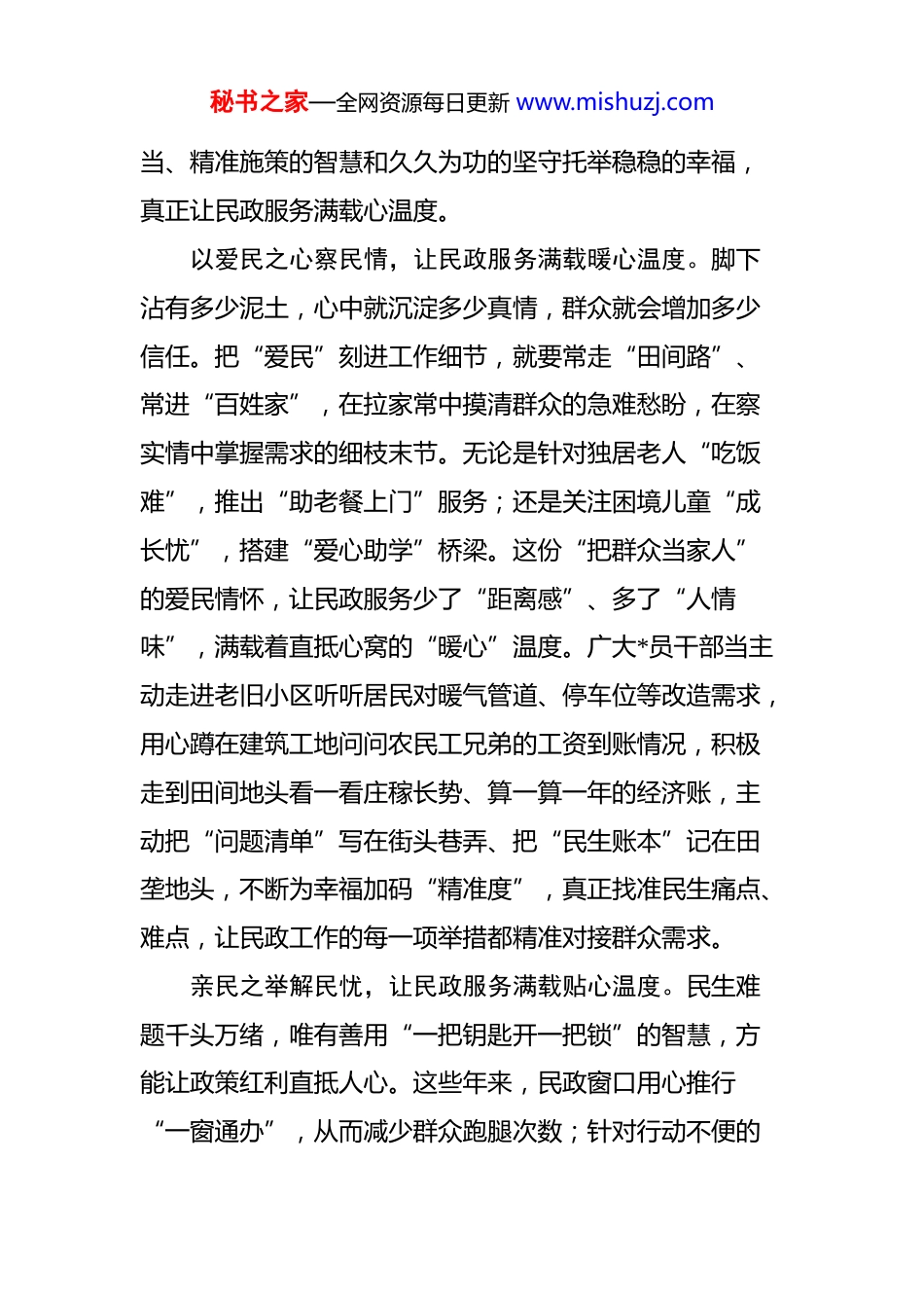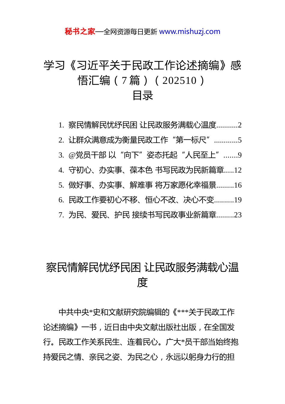 秘书之家—全网资源每日更新 www.mishuzj.com学习《习近平关于民政工作论述摘编》感悟汇编(7 篇)(202510)目录1. 察民情解民忧纾民困 让民政服务满载心温度...........22. 让群众满意成为衡量民政工作“第一标尺”............53. @党员干部 以“向下”姿态托起“人民至上”.......94. 守初心、办实事、葆本色 书写民政为民新篇章.....125. 做好事、办实事、解难事 将万家愿化幸福景.........166. 民政工作要初心不移、恒心不改、决心不变..........197. 为民、爱民、护民 接续书写民政事业新篇章.........23察民情解民忧纾民困 让民政服务满载心温度中共中央*史和文献研究院编辑的《***关于民政工作论述摘编》一书,近日由中央文献出版社出版,在全国发行。民政工作关系民生、连着民心。广大*员干部当始终抱持爱民之情、亲民之姿、为民之心,永远以躬身力行的担秘书之家—全网资源每日更新 www.mishuzj.com当、精准施策的智慧和久久为功的坚守托举稳稳的幸福,真正让民政服务满载心温度。以爱民之心察民情,让民政服务满载暖心温度。脚下沾有多少泥土,心中就沉淀多少真情,群众就会增加多少信任。把“爱民”刻进工作细节,就要常走“田间路”、常进“百姓家”,在拉家常中摸清群众的急难愁盼,在察实情中掌握需求的细枝末节。无论是针对独居老人“吃饭难”,推出“助老餐上门”服务;还是关注困境儿童“成长忧”,搭建“爱心助学”桥梁。这份“把群众当家人”的爱民情怀,让民政服务少了“距离感”、多了“人情味”,满载着直抵心窝的“暖心”温度。广大*员干部当主动走进老旧小区听听居民对暖气管道、停车位等改造需求,用心蹲在建筑工地问问农民工兄弟的工资到账情况,积极走到田间地头看一看庄稼长势、算一算一年的经济账,主动把“问题清单”写在街头巷弄、把“民生账本”记在田垄地头,不断为幸福加码“精准度”,真正找准民生痛点、难点,让民政工作的每一项举措都精准对接群众需求。亲民之举解民忧,让民政服务满载贴心温度。民生难题千头万绪,唯有善用“一把钥匙开一把锁”的智慧,方能让政策红利直抵人心。这些年来,民政窗口用心推行“一窗通办”,从而减少群众跑腿次数;针对行动不便的秘书之家—全网资源每日更新 www.mishuzj.com群体,开展“上门办、帮代办”服务,把流程化繁为简;同时用通俗易懂的“大白话”解读政策,让群众听得懂、用得上。这些“俯下身子贴近群众”的亲民举措,把服务送到群众身边、办进群众心坎,让民政服务满载着细致周到的“贴心”温度。我们深知做好工作从无“万能药方”,唯有做到精准施策、靶向施治,方能药到病除。广大*员干部当从各地实践中汲取经验和智慧启迪,深刻明白民生之“策”,在“一枝一叶总关情”的共鸣,在春风化雨的细腻。我们当始终以解题者的姿态,少一些照搬文件的机械、多一分解剖麻雀的钻研,始终以匠心、耐心为民生幸福加码“满意度”,真正温暖万家的心。为民之责纾民困,让民政服务满载安心温度。民生改善非一日之功,扛牢“为民”的使命担当,就要做到在民生兜底上“不打折扣”、在为民纾困上“竭力所为”、在回应期盼时“久久为功”。一路走来,从为困难家庭精准落实救助政策,筑牢生活保障线,到推进社区养老服务中心建设,解决老人“照料难”;从完善婚姻登记、殡葬服务等民生事项,让群众办事更省心,到增强残障人士的技能培训、就业服务,让追梦的信心和动力更足……这份“事事有回应、件件有着落”的为民责任,驱散了群众的后顾之忧,让民政服务满载着安稳可靠的“安心”温度。面对秘书之家—全网资源每日更新 www.mishuzj.com民生领域的新挑战、新要求,广大*员干部更要以钉钉子精神抓好当下,以“绣花功夫”不断精进,主动将基层实践中的“金点子”转化为解题答卷的“秘钥”、将群众创造的“好经验”化为长效“硬支撑”,真正为民生幸福加码“持久度”,把对事业的信念落实到长久的坚持和务实的行动中,让民政工作真正惠及更多群众。让群众满意成为衡量民政工作“第一标尺”中共中央*史和文献研究院编辑的《***关于民政工作论述摘编》一书,近日由中央文献出版社出版,在全国发行...