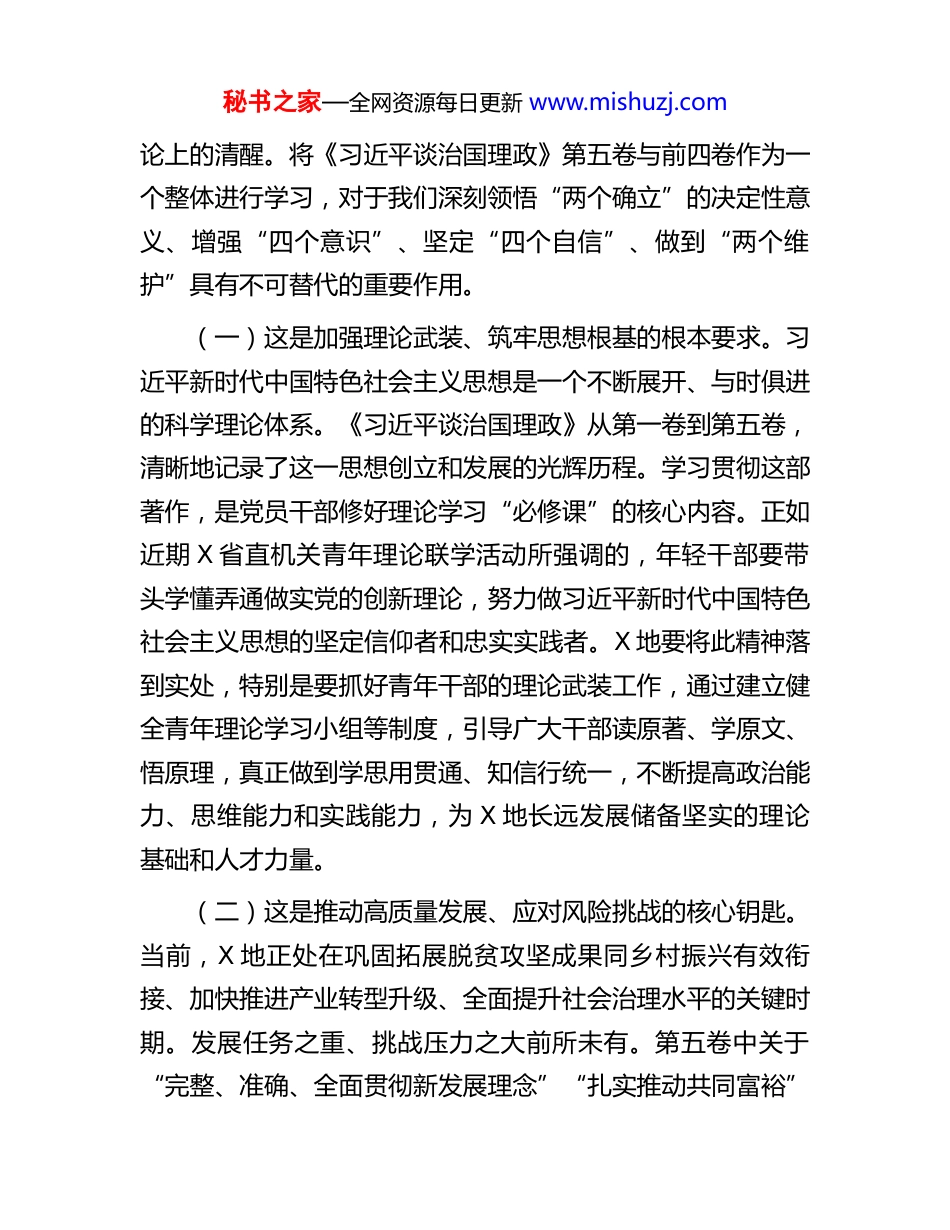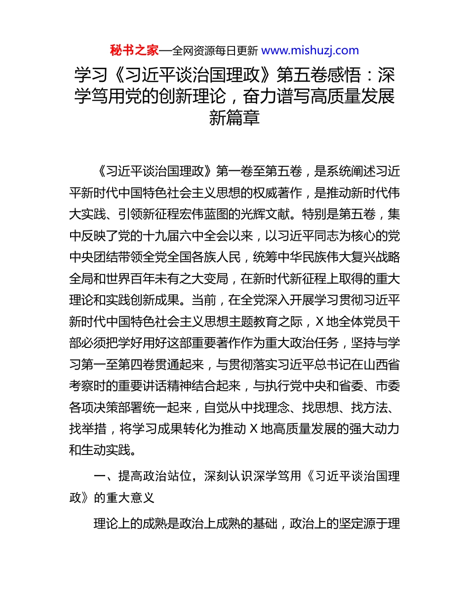 秘书之家—全网资源每日更新 www.mishuzj.com学习《习近平谈治国理政》第五卷感悟:深学笃用党的创新理论,奋力谱写高质量发展新篇章《习近平谈治国理政》第一卷至第五卷,是系统阐述习近平新时代中国特色社会主义思想的权威著作,是推动新时代伟大实践、引领新征程宏伟蓝图的光辉文献。特别是第五卷,集中反映了党的十九届六中全会以来,以习近平同志为核心的党中央团结带领全党全国各族人民,统筹中华民族伟大复兴战略全局和世界百年未有之大变局,在新时代新征程上取得的重大理论和实践创新成果。当前,在全党深入开展学习贯彻习近平新时代中国特色社会主义思想主题教育之际,X 地全体党员干部必须把学好用好这部重要著作作为重大政治任务,坚持与学习第一至第四卷贯通起来,与贯彻落实习近平总书记在山西省考察时的重要讲话精神结合起来,与执行党中央和省委、市委各项决策部署统一起来,自觉从中找理念、找思想、找方法、找举措,将学习成果转化为推动 X 地高质量发展的强大动力和生动实践。一、提高政治站位,深刻认识深学笃用《习近平谈治国理政》的重大意义理论上的成熟是政治上成熟的基础,政治上的坚定源于理秘书之家—全网资源每日更新 www.mishuzj.com论上的清醒。将《习近平谈治国理政》第五卷与前四卷作为一个整体进行学习,对于我们深刻领悟“两个确立”的决定性意义、增强“四个意识”、坚定“四个自信”、做到“两个维护”具有不可替代的重要作用。(一)这是加强理论武装、筑牢思想根基的根本要求。习近平新时代中国特色社会主义思想是一个不断展开、与时俱进的科学理论体系。《习近平谈治国理政》从第一卷到第五卷,清晰地记录了这一思想创立和发展的光辉历程。学习贯彻这部著作,是党员干部修好理论学习“必修课”的核心内容。正如近期 X 省直机关青年理论联学活动所强调的,年轻干部要带头学懂弄通做实党的创新理论,努力做习近平新时代中国特色社会主义思想的坚定信仰者和忠实实践者。X 地要将此精神落到实处,特别是要抓好青年干部的理论武装工作,通过建立健全青年理论学习小组等制度,引导广大干部读原著、学原文、悟原理,真正做到学思用贯通、知信行统一,不断提高政治能力、思维能力和实践能力,为 X 地长远发展储备坚实的理论基础和人才力量。(二)这是推动高质量发展、应对风险挑战的核心钥匙。当前,X 地正处在巩固拓展脱贫攻坚成果同乡村振兴有效衔接、加快推进产业转型升级、全面提升社会治理水平的关键时期。发展任务之重、挑战压力之大前所未有。第五卷中关于“完整、准确、全面贯彻新发展理念”“扎实推动共同富裕”秘书之家—全网资源每日更新 www.mishuzj.com“统筹发展和安全”等重要论述,为我们破解发展难题、厚植发展优势提供了战略指引。通过系统学习,我们能够更深刻地理解高质量发展的内涵要求,更精准地把握 X 地在区域发展格局中的定位,从而在复杂多变的外部环境中保持战略定力,有效防范化解经济社会发展各领域的风险挑战,确保 X 地经济社会发展航船行稳致远。(三)这是统一思想行动、凝聚奋进力量的行动指南。思想是行动的先导。只有思想上统一,才能做到步调一致、行动有力。党中央和省委、市委的各项决策部署,都是习近平新时代中国特色社会主义思想在具体领域的实践化。学习《习近平谈治国理政》,就是要深刻理解这些决策部署背后的理论逻辑和战略考量,从而变“要我做”为“我要做”,增强贯彻执行的自觉性和坚定性。通过学习,X 地全体干部群众将更加清晰地认识到自身肩负的历史使命,把个人奋斗融入全镇、全市乃至全省全国的发展大局中,心往一处想、劲往一处使,形成推动 X 地高质量发展的磅礴合力。二、坚持融会贯通,系统把握蕴含其中的思想精髓与实践要求学习《习近平谈治国理政》不能碎片化、孤立化,必须坚持系统观念,将其作为一个有机整体,与总书记对 X 省的重要指示精神和对具体领域工作的要求结合起来,一体学习、一秘书之家—全网资源每日更新 www.mishuzj.com体领会、一体贯彻。(一)贯通学习第一至第五卷,深刻领会理论发展的脉络和逻辑。从第一卷的“坚持和发展中国特色社会主...