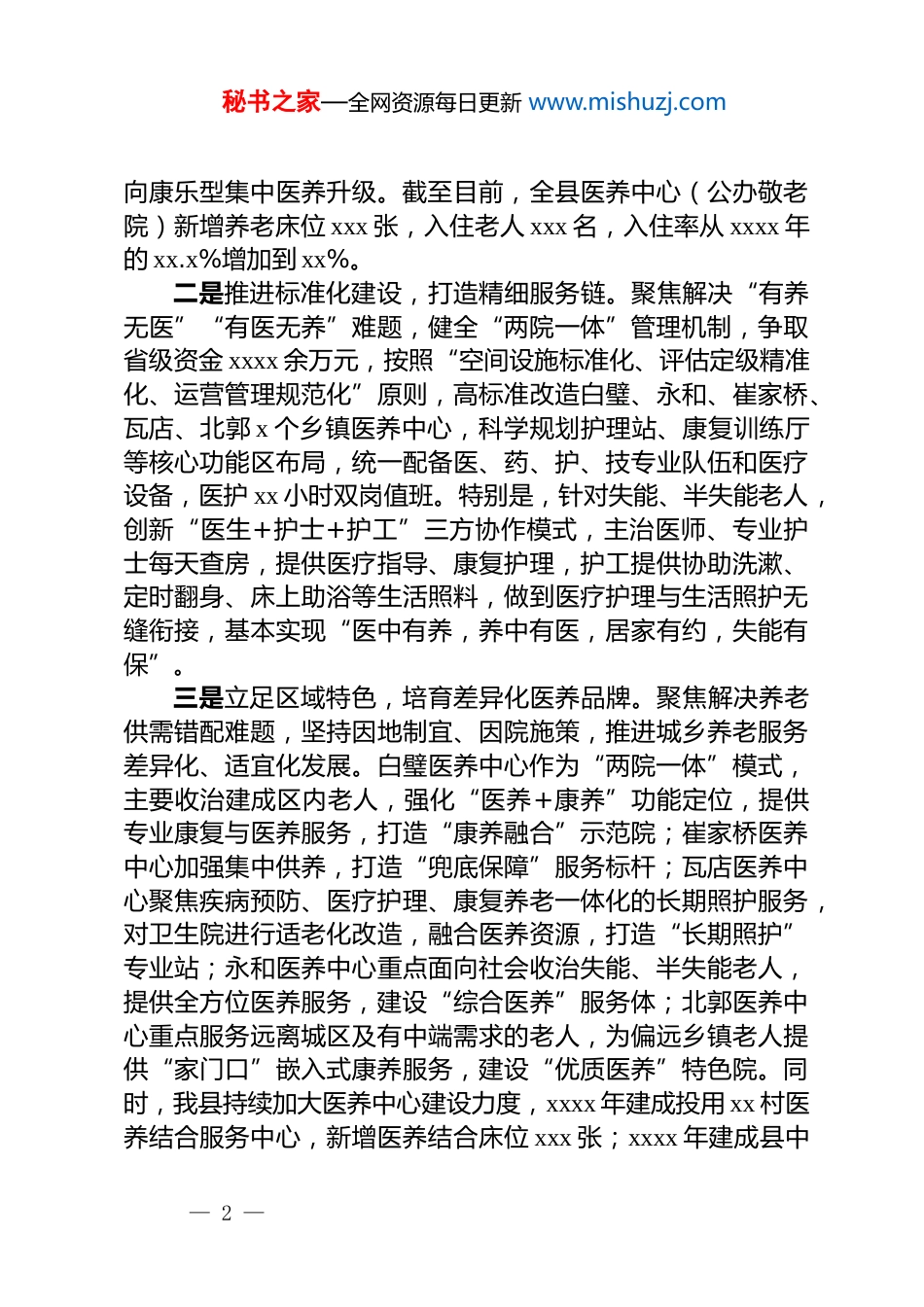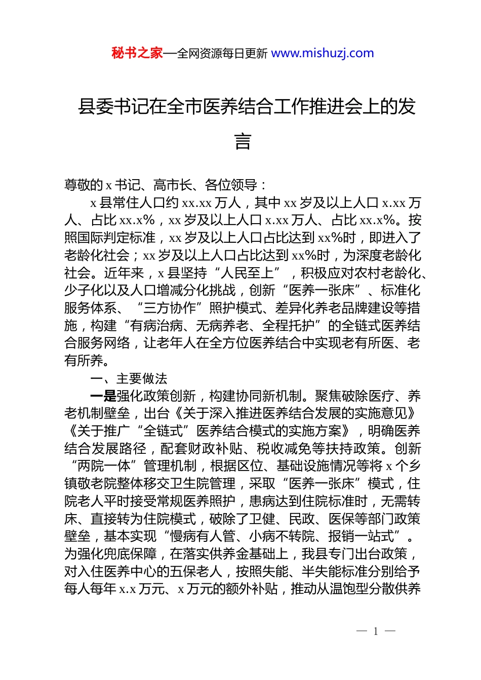 秘书之家—全网资源每日更新 www.mishuzj.com县委书记在全市医养结合工作推进会上的发言尊敬的 x 书记、高市长、各位领导:x 县常住人口约 xx.xx 万人,其中 xx 岁及以上人口 x.xx 万人、占比 xx.x%,xx 岁及以上人口 x.xx 万人、占比 xx.x%。按照国际判定标准,xx 岁及以上人口占比达到 xx%时,即进入了老龄化社会;xx 岁及以上人口占比达到 xx%时,为深度老龄化社会。近年来,x 县坚持“人民至上”,积极应对农村老龄化、少子化以及人口增减分化挑战,创新“医养一张床”、标准化服务体系、“三方协作”照护模式、差异化养老品牌建设等措施,构建“有病治病、无病养老、全程托护”的全链式医养结合服务网络,让老年人在全方位医养结合中实现老有所医、老有所养。一、主要做法一是强化政策创新,构建协同新机制。聚焦破除医疗、养老机制壁垒,出台《关于深入推进医养结合发展的实施意见》《关于推广“全链式”医养结合模式的实施方案》,明确医养结合发展路径,配套财政补贴、税收减免等扶持政策。创新“两院一体”管理机制,根据区位、基础设施情况等将 x 个乡镇敬老院整体移交卫生院管理,采取“医养一张床”模式,住院老人平时接受常规医养照护,患病达到住院标准时,无需转床、直接转为住院模式,破除了卫健、民政、医保等部门政策壁垒,基本实现“慢病有人管、小病不转院、报销一站式”。为强化兜底保障,在落实供养金基础上,我县专门出台政策,对入住医养中心的五保老人,按照失能、半失能标准分别给予每人每年 x.x 万元、x 万元的额外补贴,推动从温饱型分散供养— 1 —秘书之家—全网资源每日更新 www.mishuzj.com向康乐型集中医养升级。截至目前,全县医养中心(公办敬老院)新增养老床位 xxx 张,入住老人 xxx 名,入住率从 xxxx 年的 xx.x%增加到 xx%。二是推进标准化建设,打造精细服务链。聚焦解决“有养无医”“有医无养”难题,健全“两院一体”管理机制,争取省级资金 xxxx 余万元,按照“空间设施标准化、评估定级精准化、运营管理规范化”原则,高标准改造白璧、永和、崔家桥、瓦店、北郭 x 个乡镇医养中心,科学规划护理站、康复训练厅等核心功能区布局,统一配备医、药、护、技专业队伍和医疗设备,医护 xx 小时双岗值班。特别是,针对失能、半失能老人,创新“医生+护士+护工”三方协作模式,主治医师、专业护士每天查房,提供医疗指导、康复护理,护工提供协助洗漱、定时翻身、床上助浴等生活照料,做到医疗护理与生活照护无缝衔接,基本实现“医中有养,养中有医,居家有约,失能有保”。三是立足区域特色,培育差异化医养品牌。聚焦解决养老供需错配难题,坚持因地制宜、因院施策,推进城乡养老服务差异化、适宜化发展。白璧医养中心作为“两院一体”模式,主要收治建成区内老人,强化“医养+康养”功能定位,提供专业康复与医养服务,打造“康养融合”示范院;崔家桥医养中心加强集中供养,打造“兜底保障”服务标杆;瓦店医养中心聚焦疾病预防、医疗护理、康复养老一体化的长期照护服务,对卫生院进行适老化改造,融合医养资源,打造“长期照护”专业站;永和医养中心重点面向社会收治失能、半失能老人,提供全方位医养服务,建设“综合医养”服务体;北郭医养中心重点服务远离城区及有中端需求的老人,为偏远乡镇老人提供“家门口”嵌入式康养服务,建设“优质医养”特色院。同时,我县持续加大医养中心建设力度,xxxx 年建成投用 xx 村医养结合服务中心,新增医养结合床位 xxx 张;xxxx 年建成县中— 2 —秘书之家—全网资源每日更新 www.mishuzj.com心医院医养结合服务中心,新增床位 xxx 张,增设远程问诊系统、智慧监控系统、智能穿戴护理等,探索“医、养、康、护”智慧型医养结合新模式,建设集医疗、康复、颐养为一体的康养产业集群。二、取得成效一是充分激活卫生院资源。医养结合改革前,我县 x 个乡镇卫生院共有病床 xxx 张,病床平均使用率仅 xx%左右。通过深化医养结合改革,把养老服务“搬进”卫生院,实现乡镇卫生院从单纯医疗服务向医养结合拓展、延伸,有效解决了卫生院...